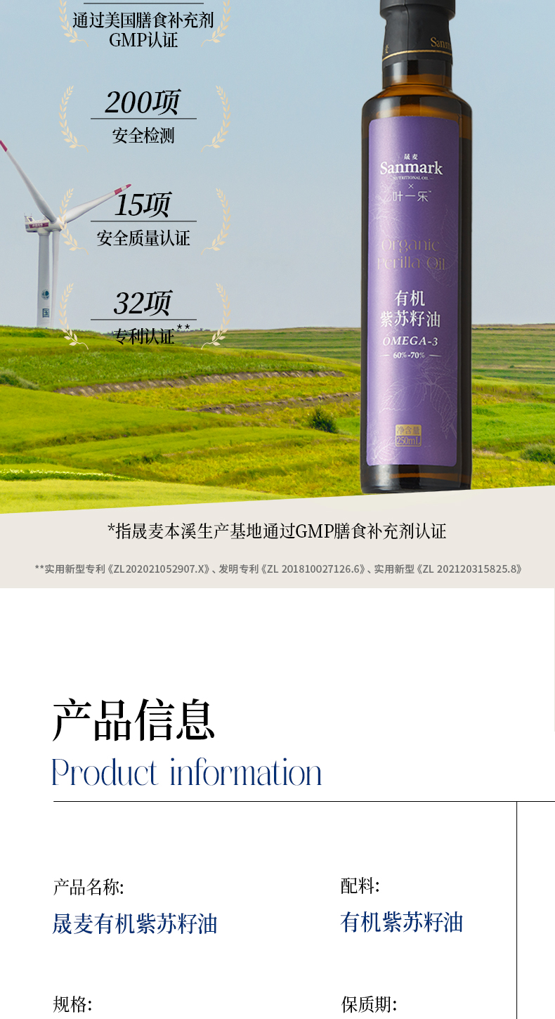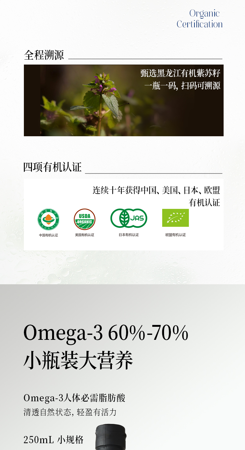 晟麦 有机紫苏油250ml 苏子籽食用油一级冷榨小瓶旗舰店正品