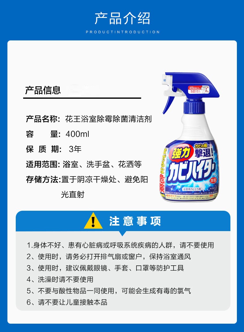 KAO花王 除霉剂浴室泡沫清洁喷剂卫生间墙面瓷砖清洗剂去污垢水渍除异味正装400ml+补充装400ml