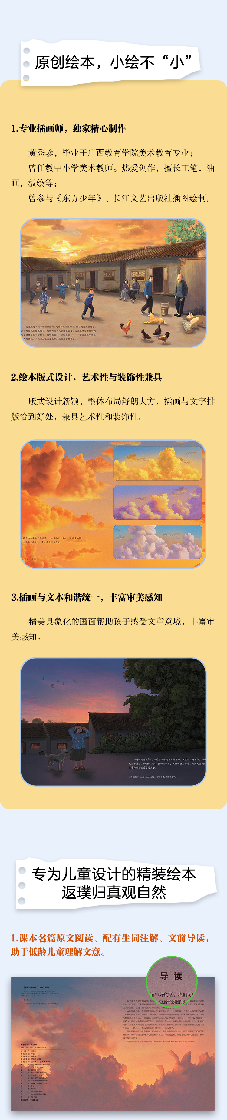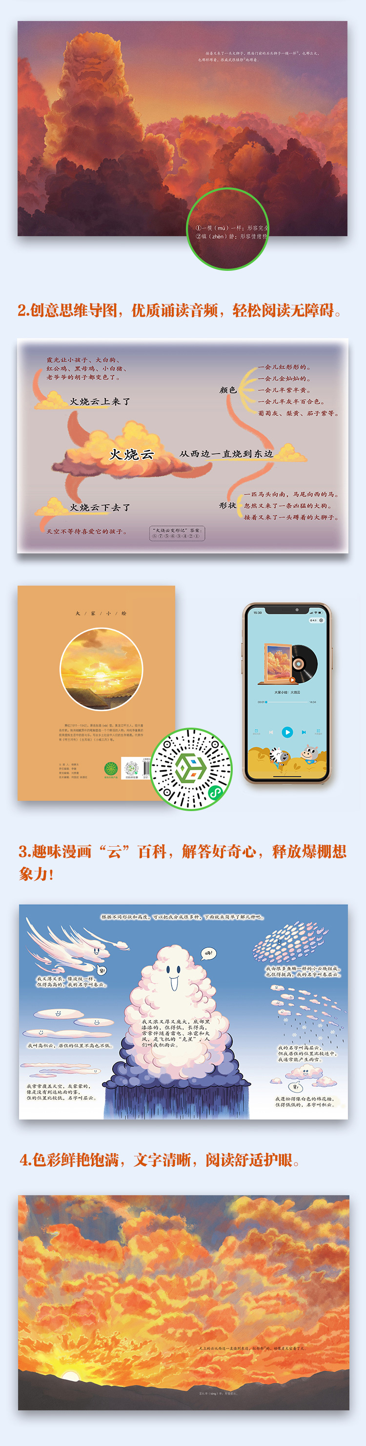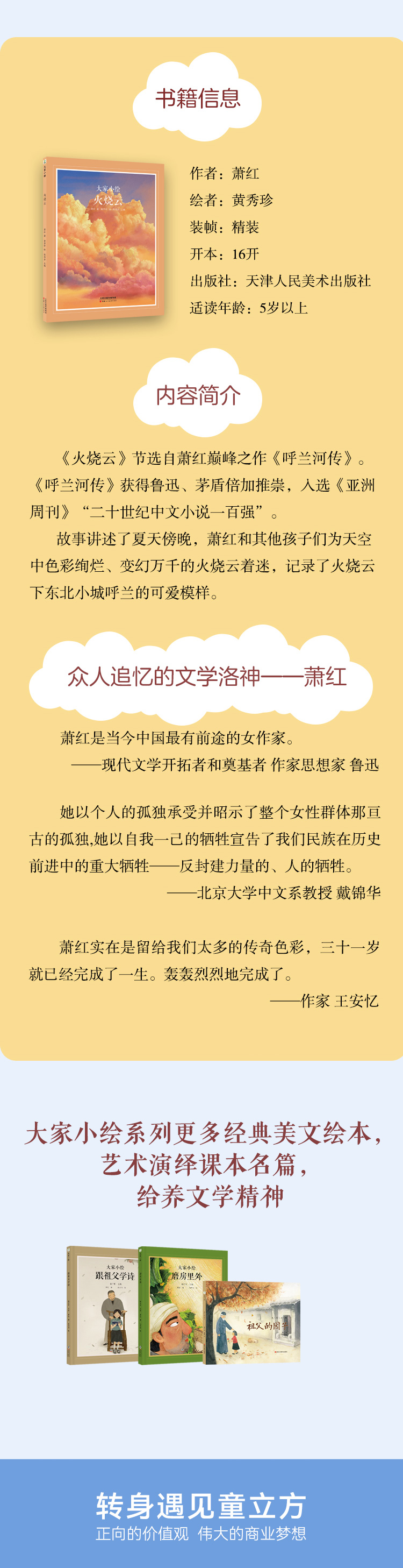 绘本《火烧云》文本为统编语文三年级下册课文《火烧云》的原文,节选自萧红代表作《呼兰河传》。故事讲述了现代作家萧红描绘的晚饭后火烧云从上来到下去的过程中的颜色和形状的变化。萧红准确地用词、生动逼真的把景物美和语言美有机地融为一体,抓住火烧云颜色、形状极多和颜色、形状变化极快这两个特点来观察和描写火烧云,体现了作者热爱大自然、热爱生活的思想感情,同时也启发学生在观察事物的过程中要大胆发挥自己丰富的想象力。