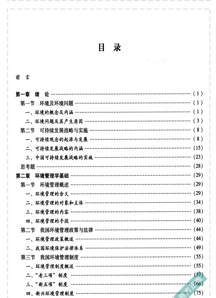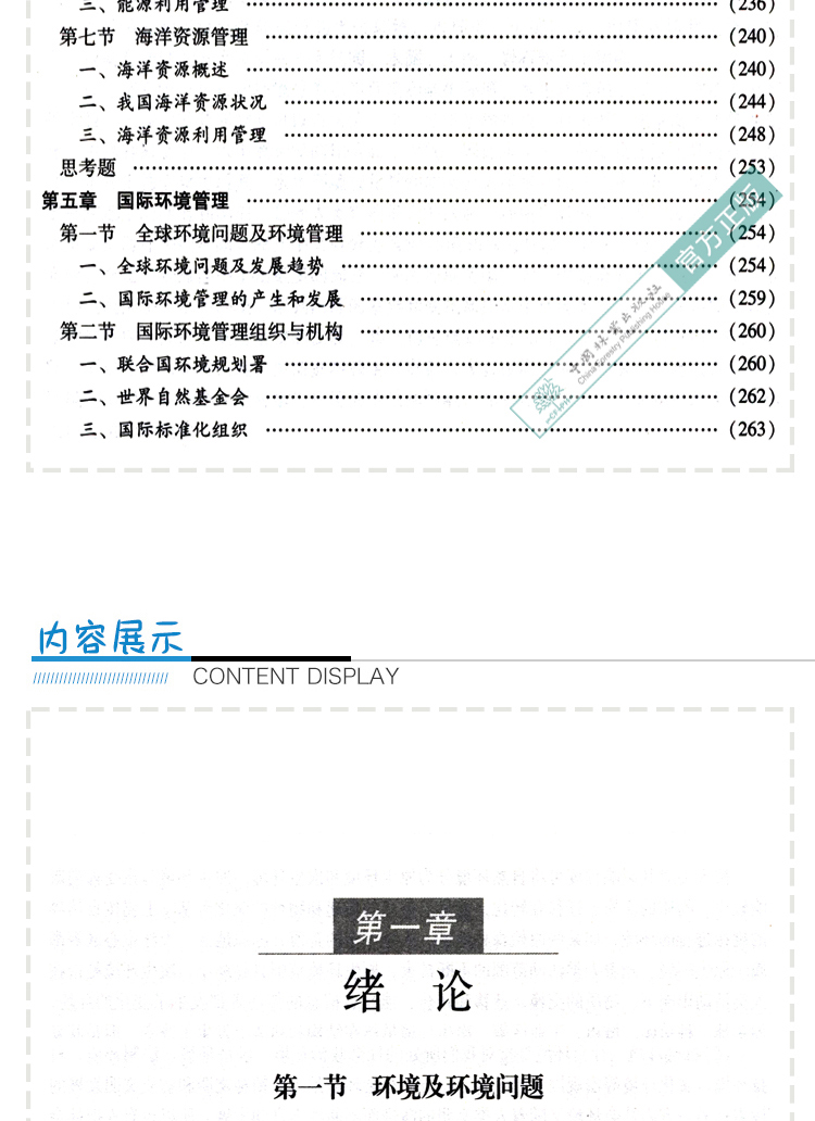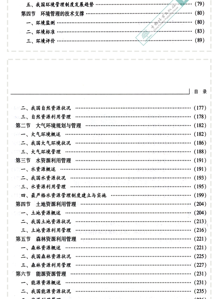 本书包括绪论包括环境问题由来、可持续发展战略;环境管理学基础包括环境管理概述、我国环境管理政策与法律、我国环境管理制度、环境管理技术支撑;区域环境规划与管理包括城市环境规划与管理、乡村环境规划与管理、工艺企业环境管理、自然保护区环境规划管理、海洋环境规划与管理;自然资源利用环境管理包括概述、大气环境规划与管理、水资源利用管理、土地资源管理、森林资源管理、能源资源管理、海洋资源管理;国际环境管理包括全球环境问题管理、国际环境管理组织机构、主要国家环境管理、环境管理国际行动。