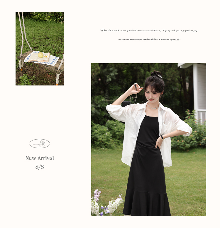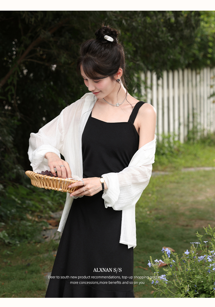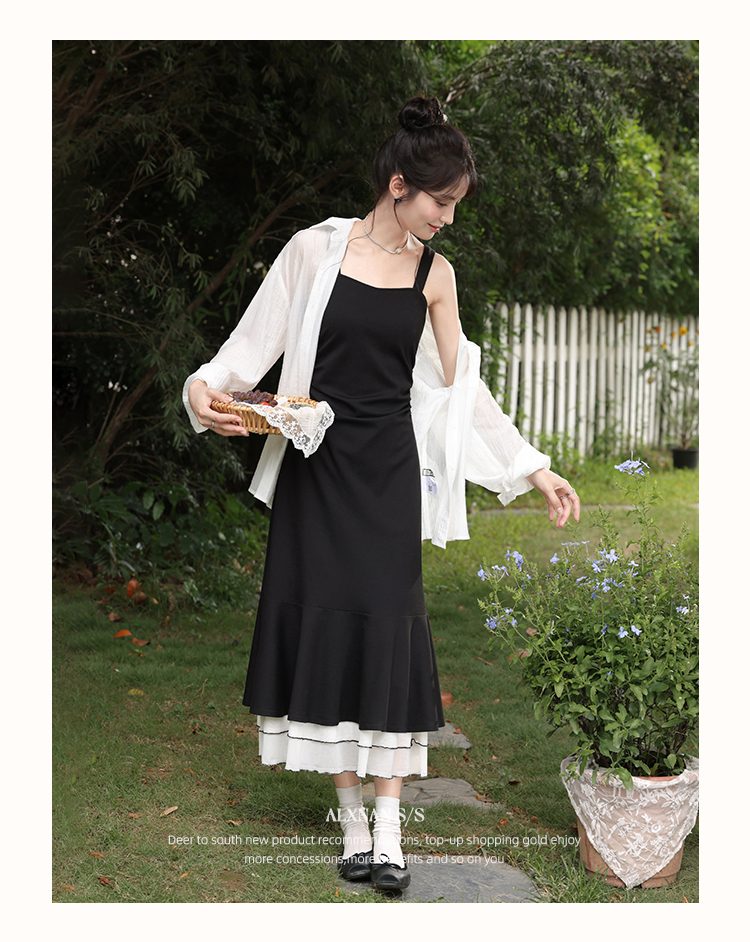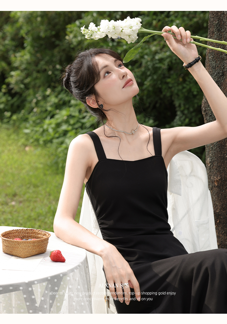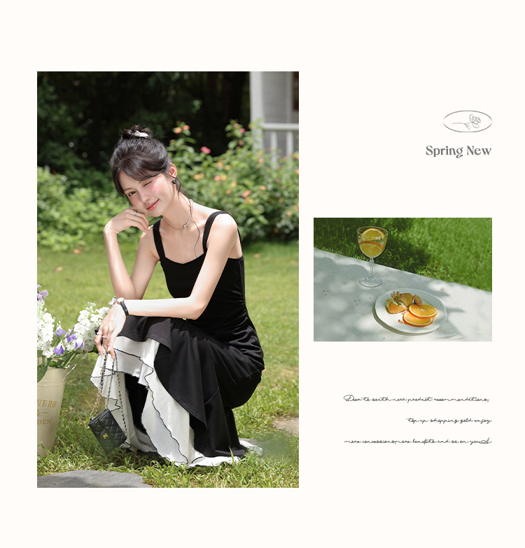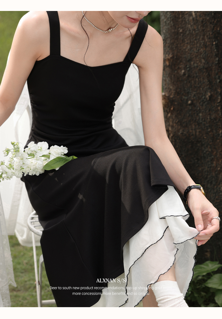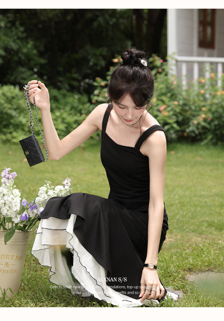 鹿向南「南法假日」法式气质拼接女连衣裙夏季收腰黑色吊带长裙子