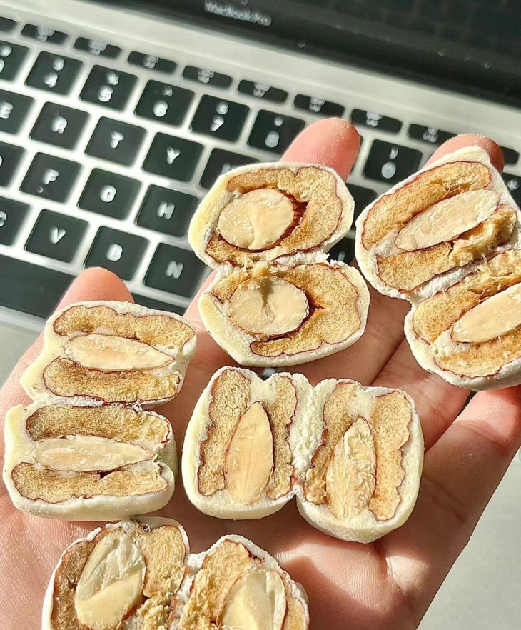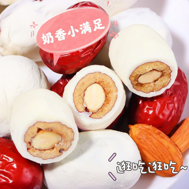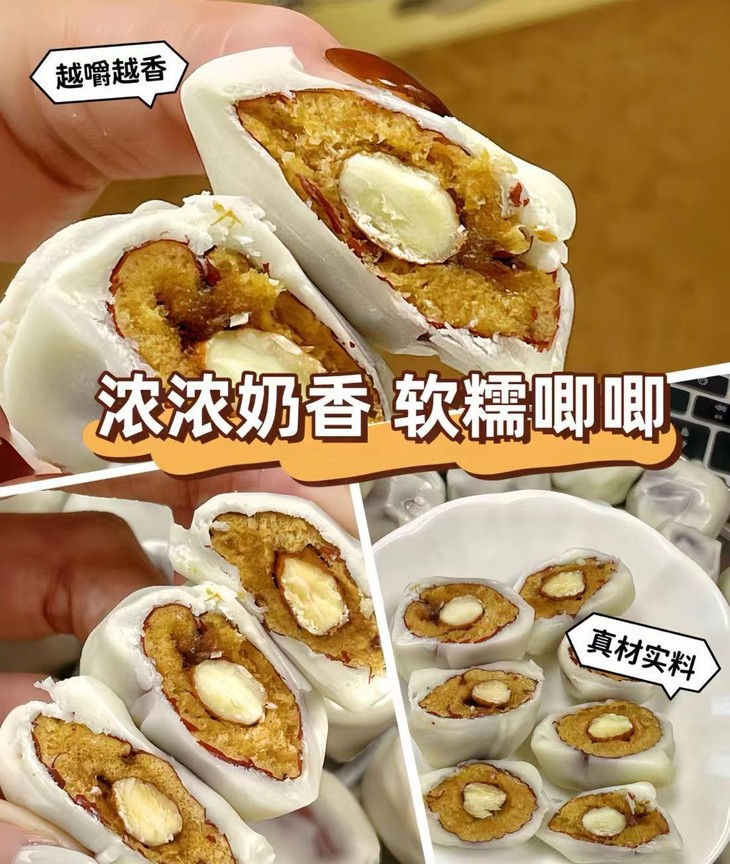 买四送一💰19.9元到手5袋❗【煜客唻巴旦木奶枣】 ✅手工制作,真材实料,奶香味十足,软糯香甜 ✅甜甜的无核红枣中间夹着一整颗巴旦木仁,再搭配奶粉、黄油棉花糖的组合🌟
