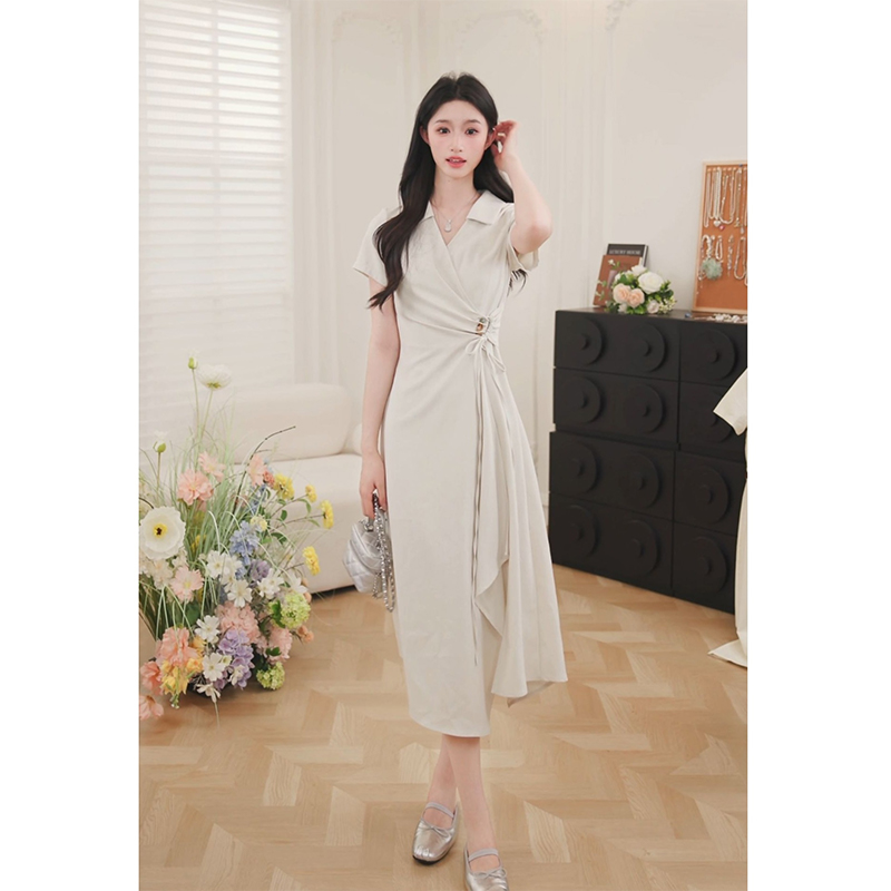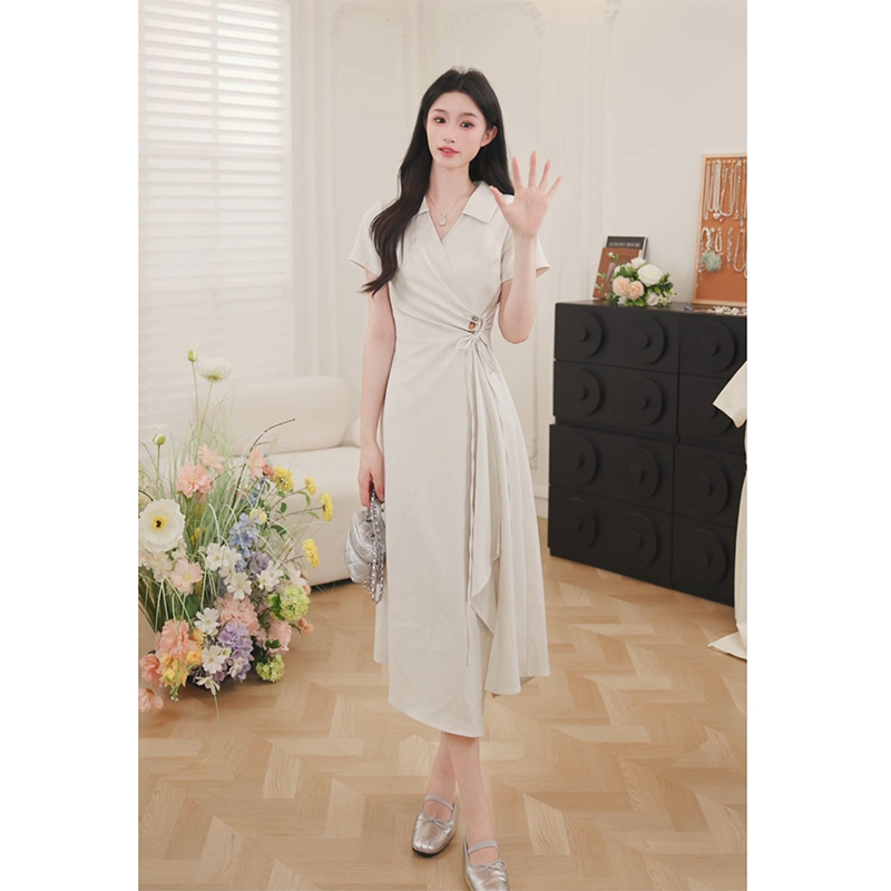 鹿向南「简雅之裳」时尚夏新款v领连衣裙女不规则设计感高腰长裙QYM002572