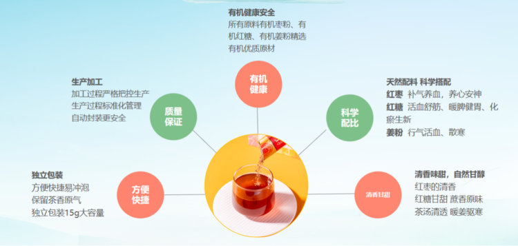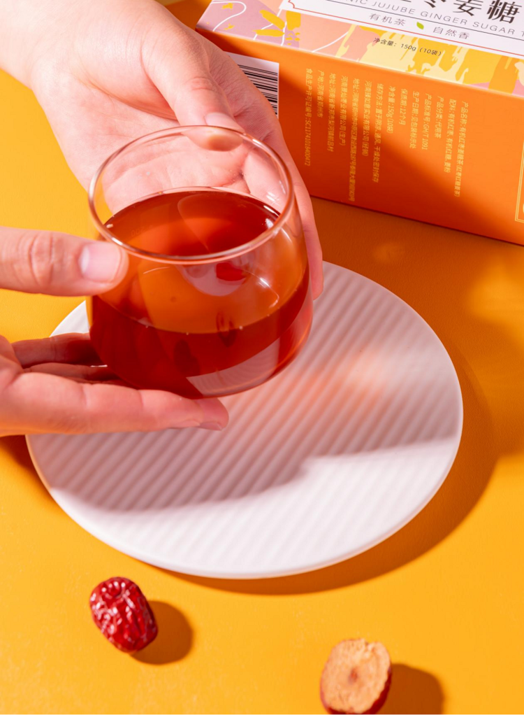 ·有机红枣粉与有机姜粉的完美融合红枣的香甜能融合姜的辛辣使姜的口感没那么辣,效果只增不减茶汤清透,暖姜驱寒