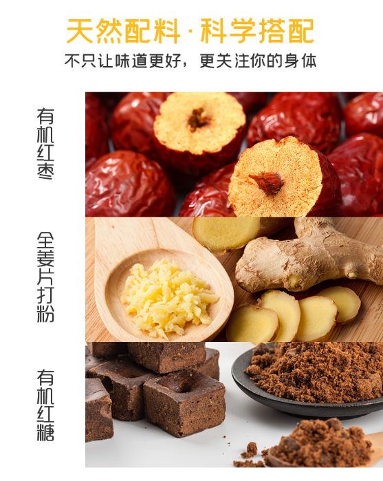 ●除了红枣为有机原料外,生姜和红糖也都是甄选的有机原料。