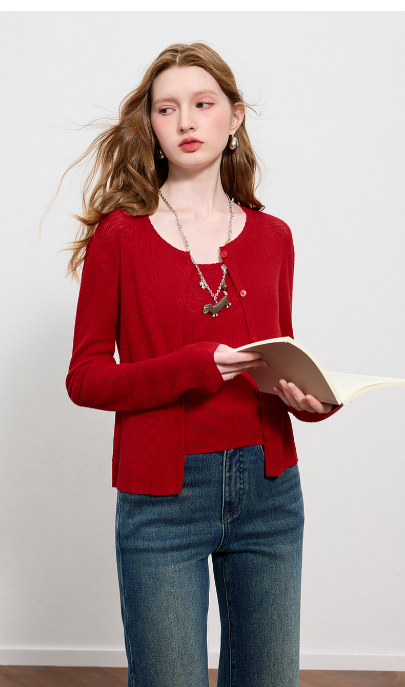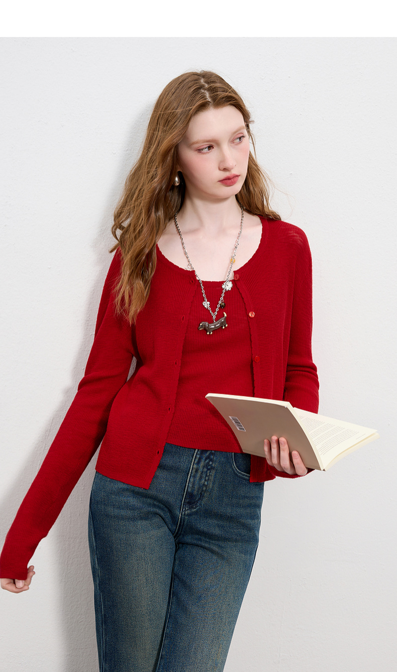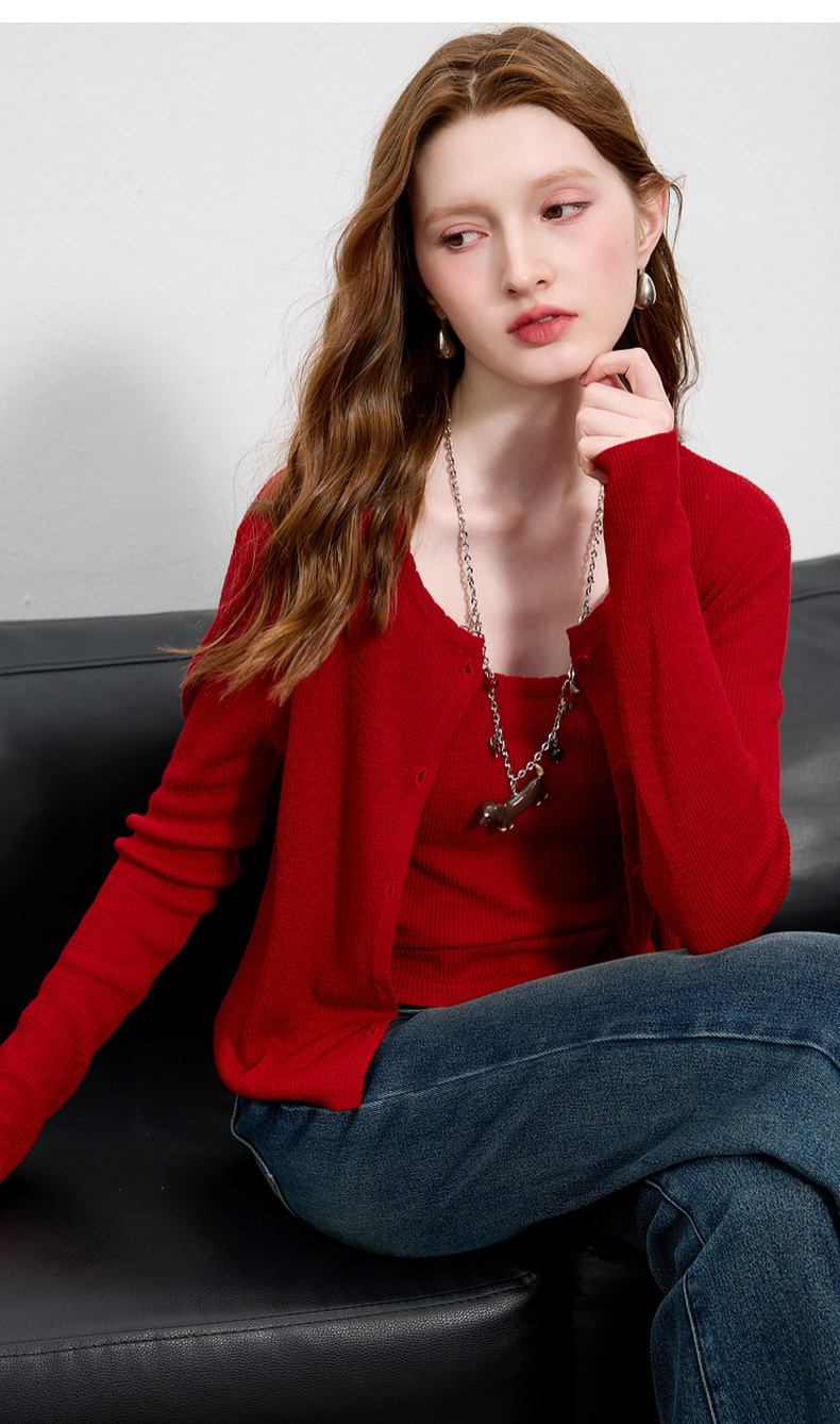 三彩2025秋季新款针织衫套装圆领毛衫开衫修身吊带两件套M