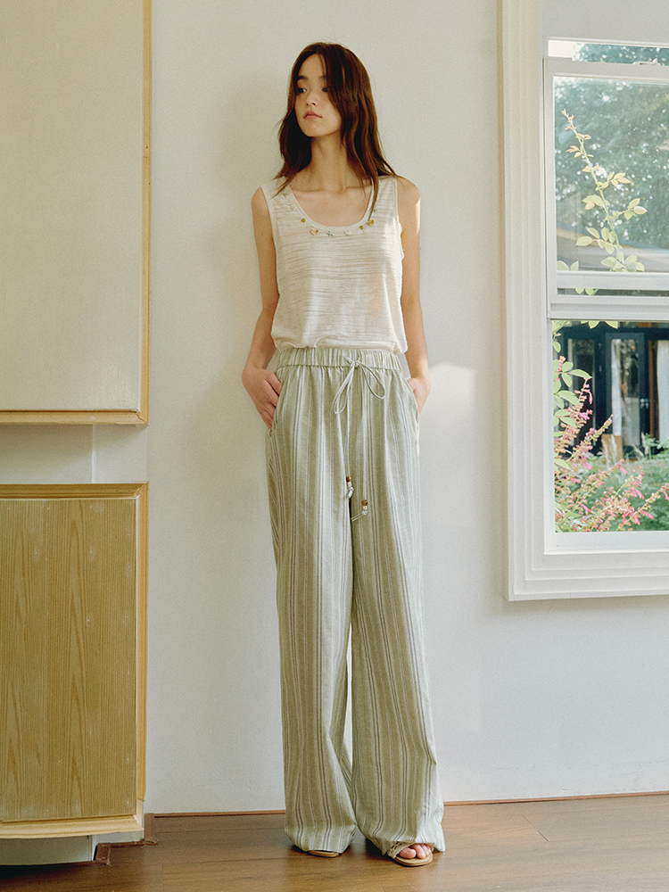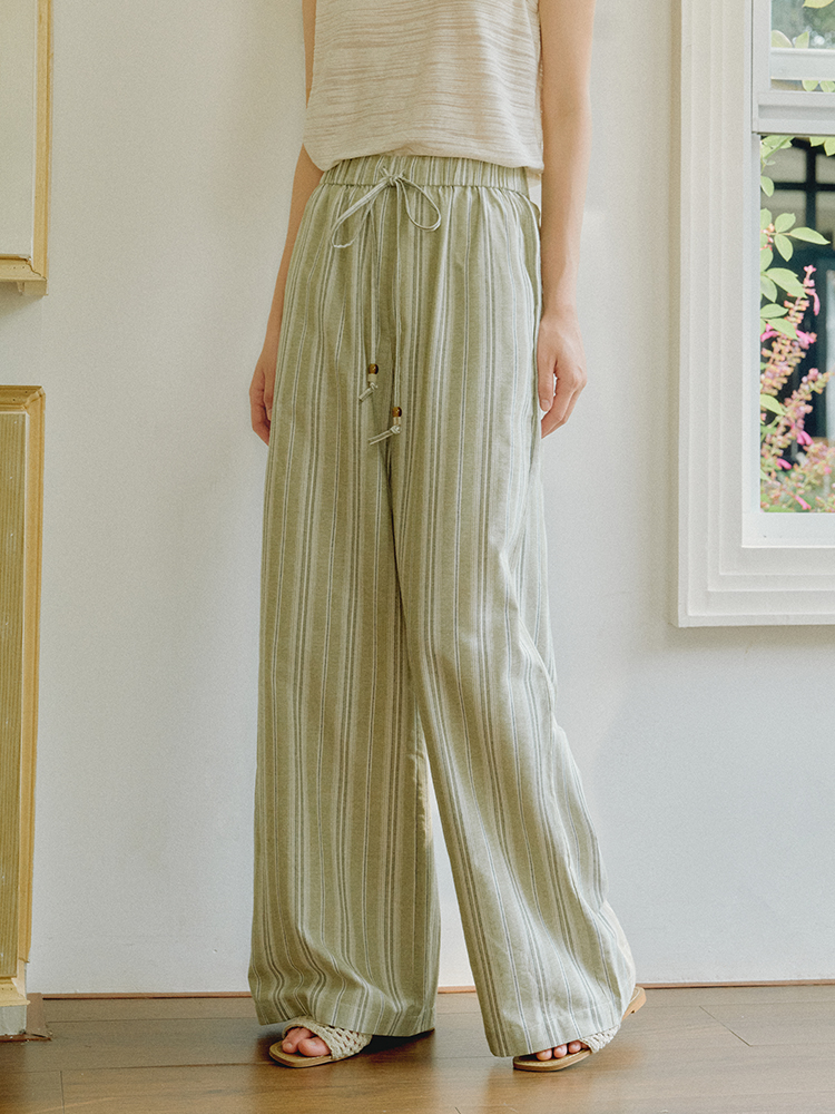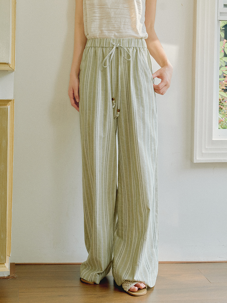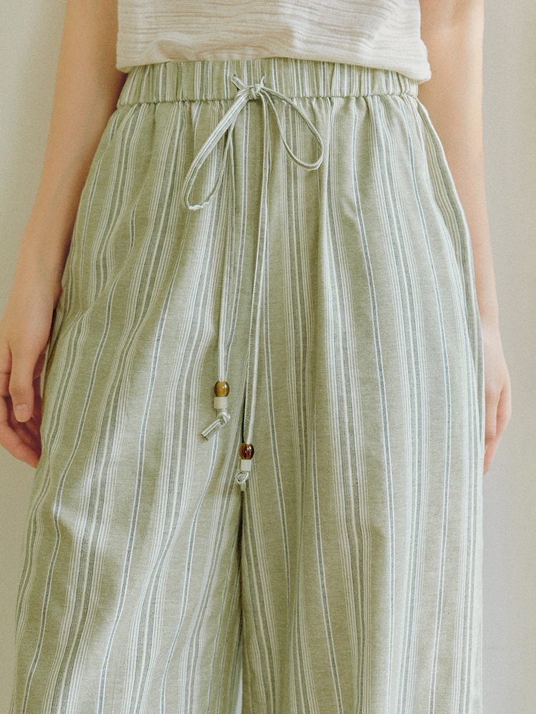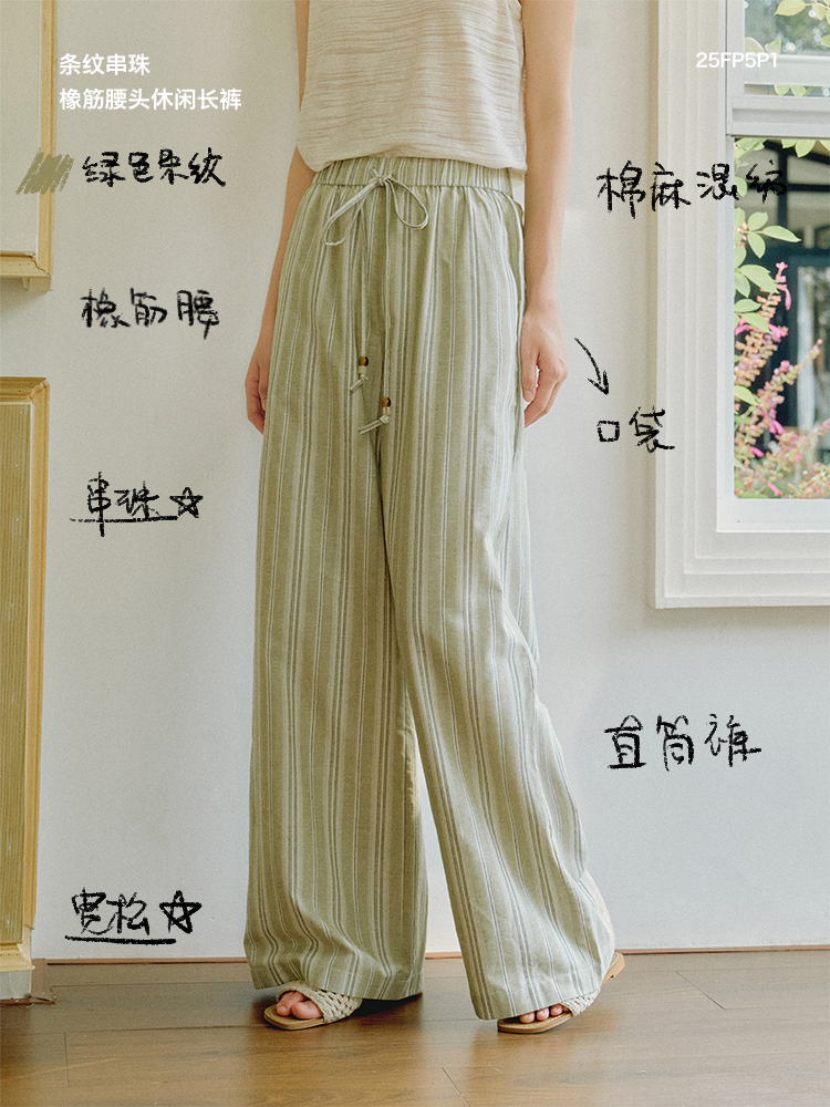 ForPoem 现货 25/SS原创设计棉麻条纹串珠橡筋腰头休闲宽松长裤