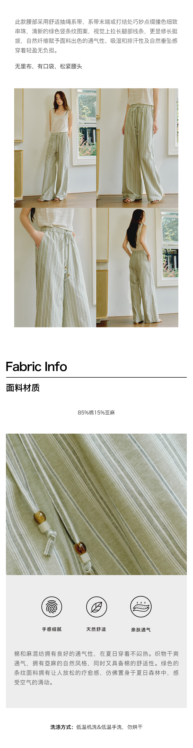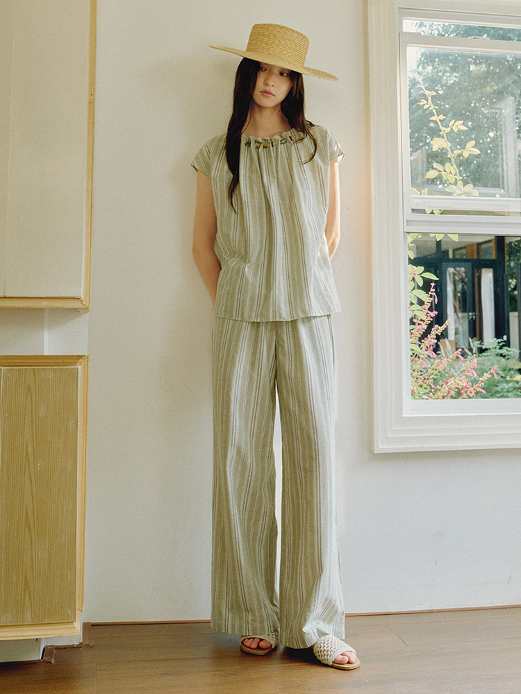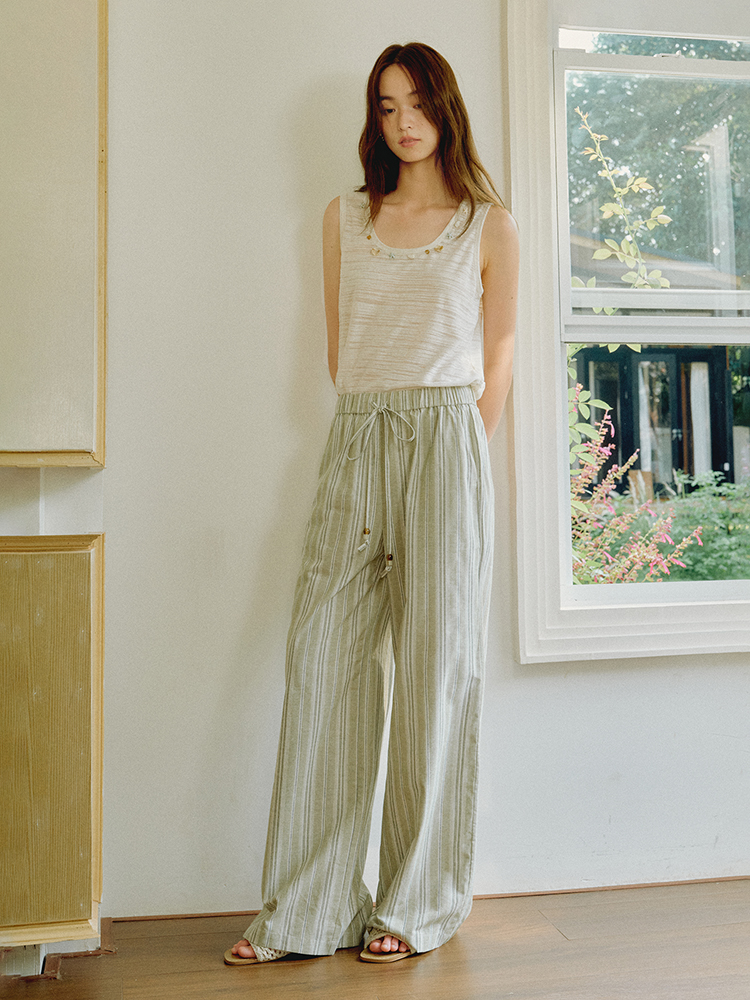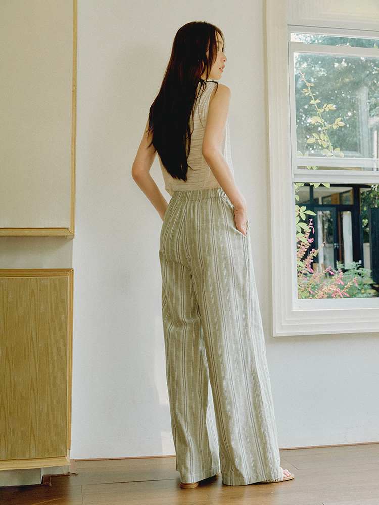 ForPoem 现货 25/SS原创设计棉麻条纹串珠橡筋腰头休闲宽松长裤