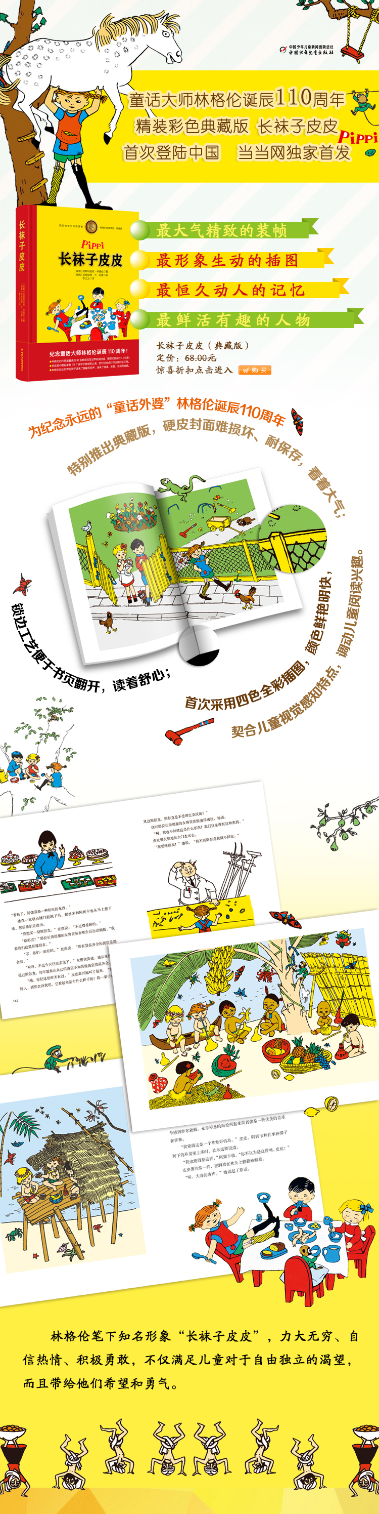 中国少年儿童出版社作为*一家获得林格伦作品出版权的单位,自2006年开始,先后出版了林格伦作品的多个版本,包括文字书、绘本、拼音等,深受广大读者的喜爱。今年是林格伦诞辰110周年,我们推出《长袜子皮皮》精装版,以此纪念伟大的童话外婆。