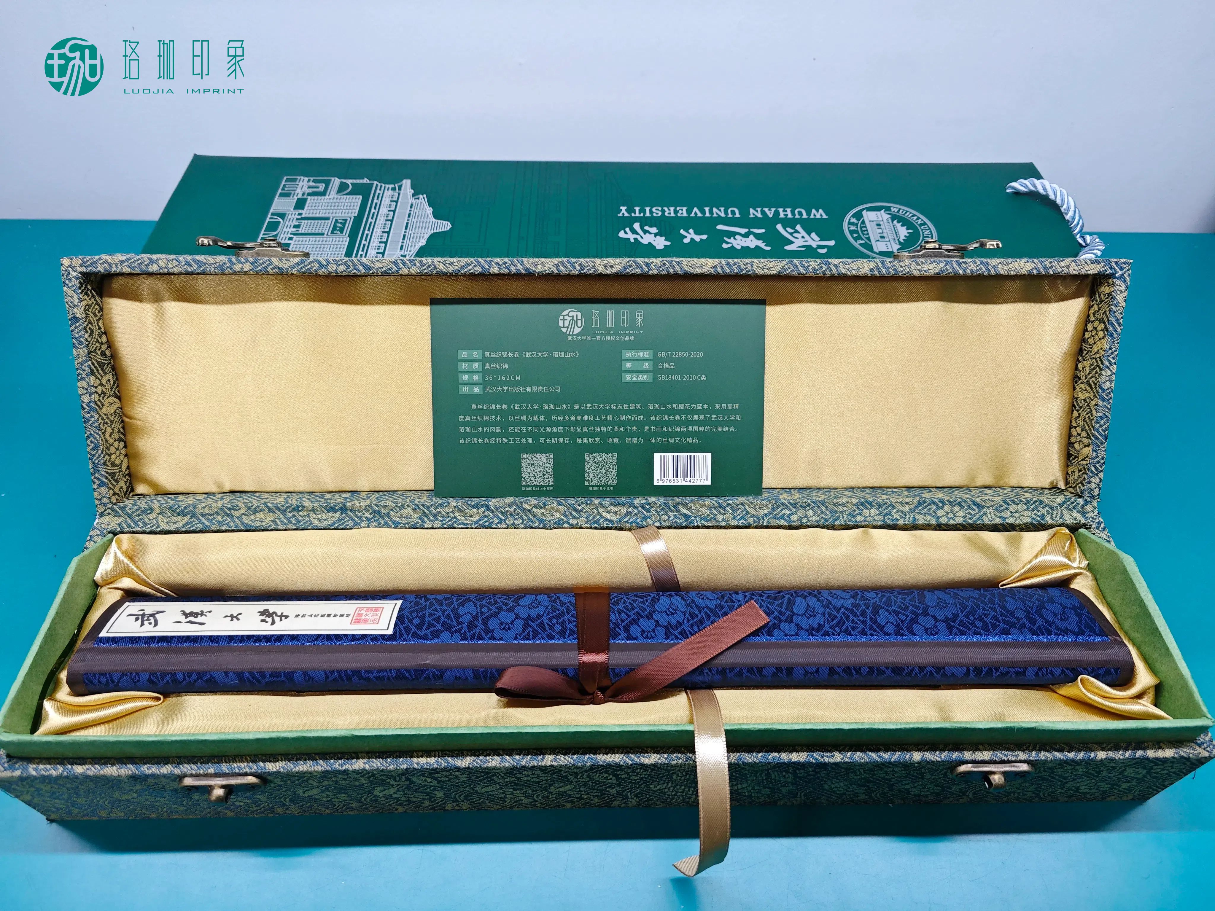 该织锦长卷不仅展现了武汉大学和珞珈山水的风韵,还能在不同光源角度下彰显真丝的独特的柔和华贵,是书画和织锦两项国粹的完美结合。经特殊工艺处理,可长期保存,是集收藏、欣赏、馈赠为一体的丝绸文化精品。