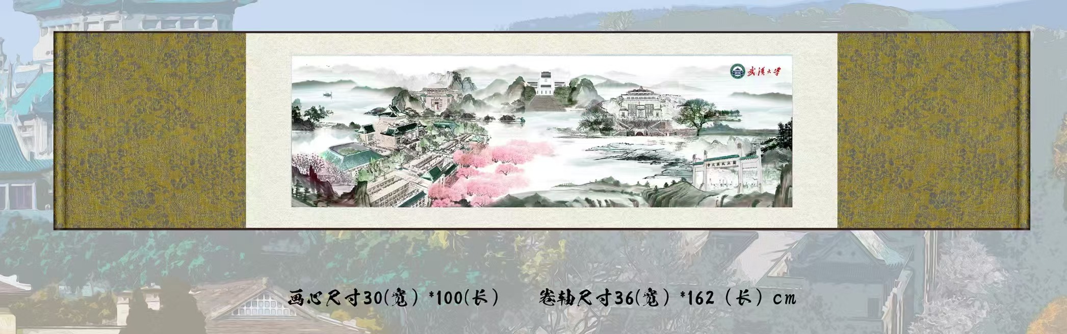 真丝织锦长卷《武汉大学·珞珈山水》是以武汉大学标志性建筑、珞珈山水和樱花为蓝本,采用高精度真丝织锦技术,以丝绸为载体,历经多道高难度工艺精心制作而成。