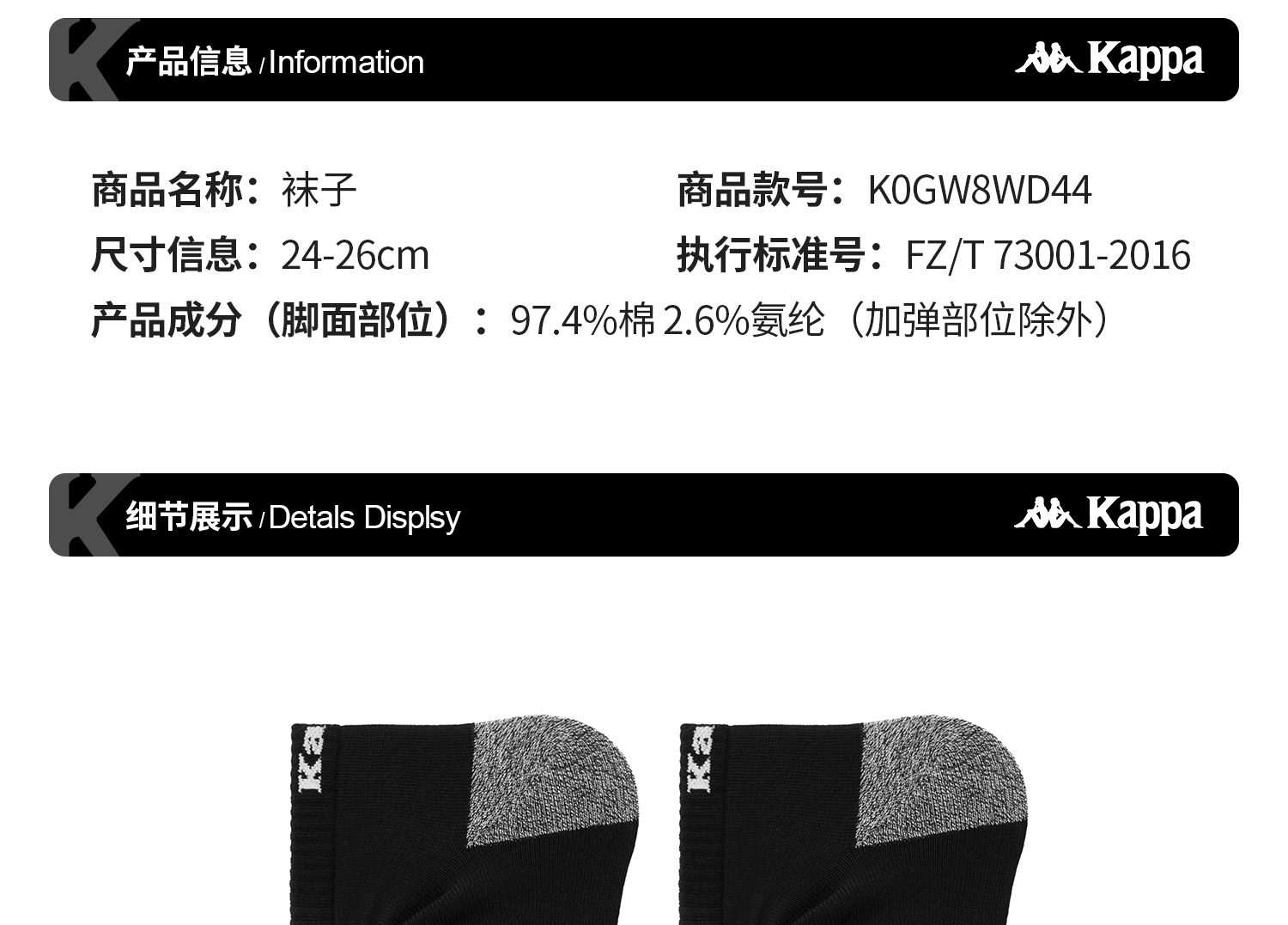 Kappa 男女通用运动短筒袜休闲透气跑步训练袜中筒袜子K0GW8WD44