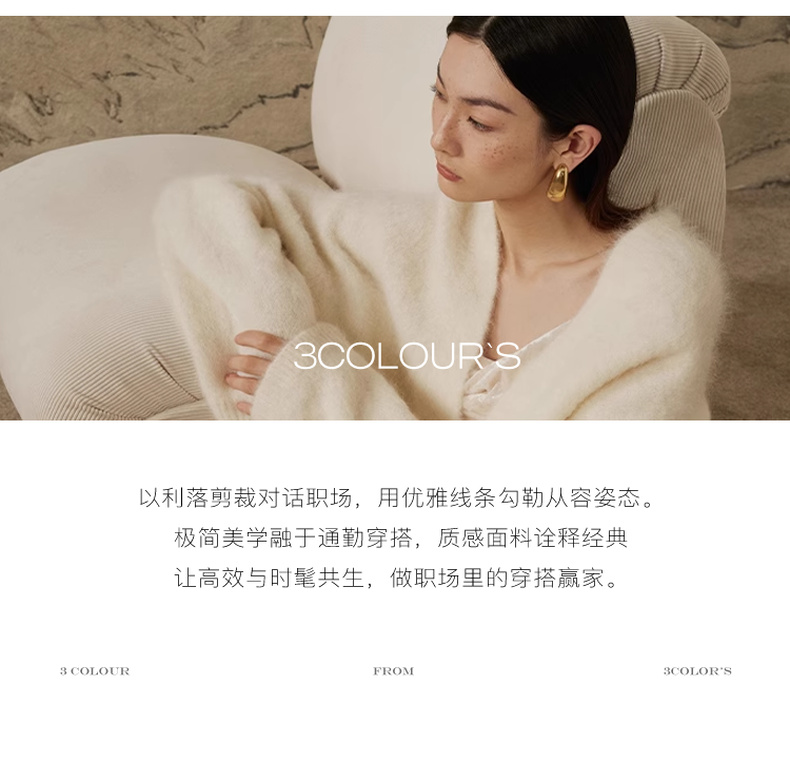 - 3COLOUR,一直致力于探索自我与时尚审美,用穿衣哲学折射生活主张,在流动中探寻恒久。