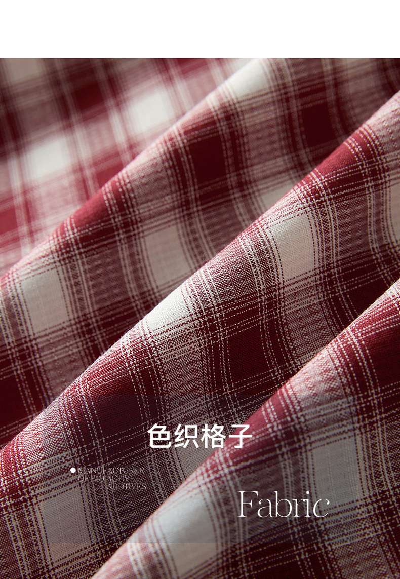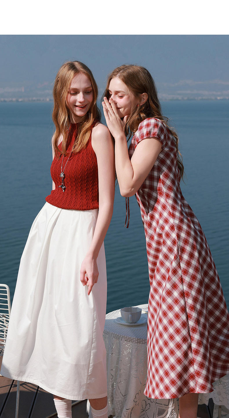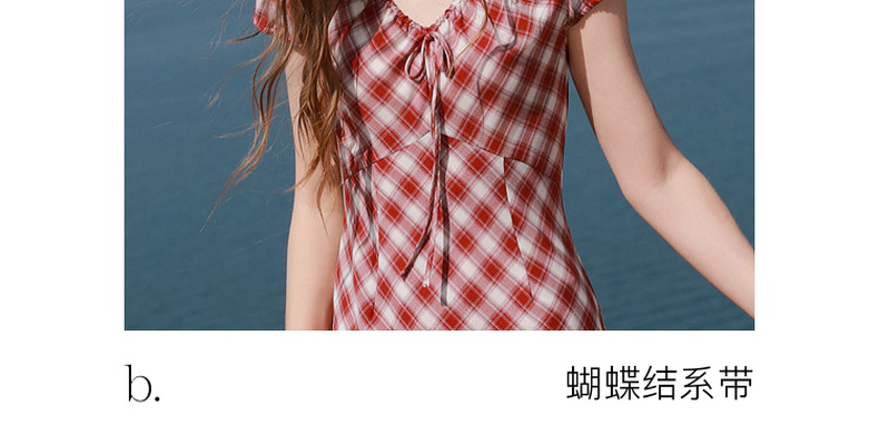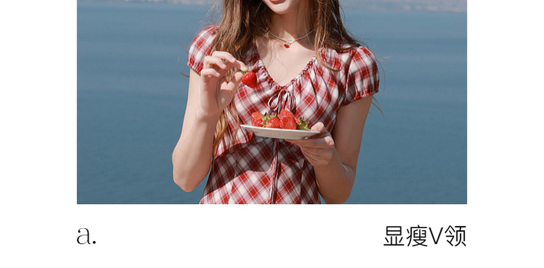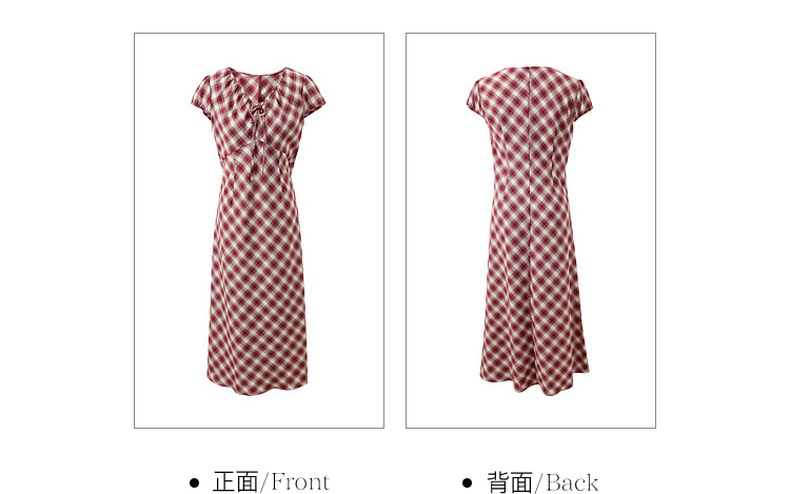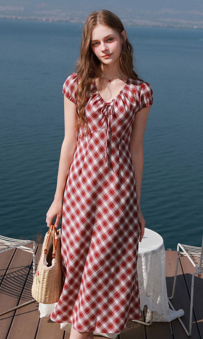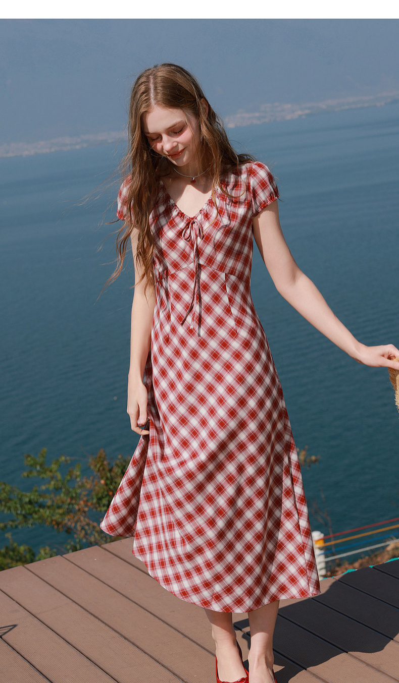 三彩2026夏季新款格纹连衣裙短袖V领A字裙长裙法式浪漫M