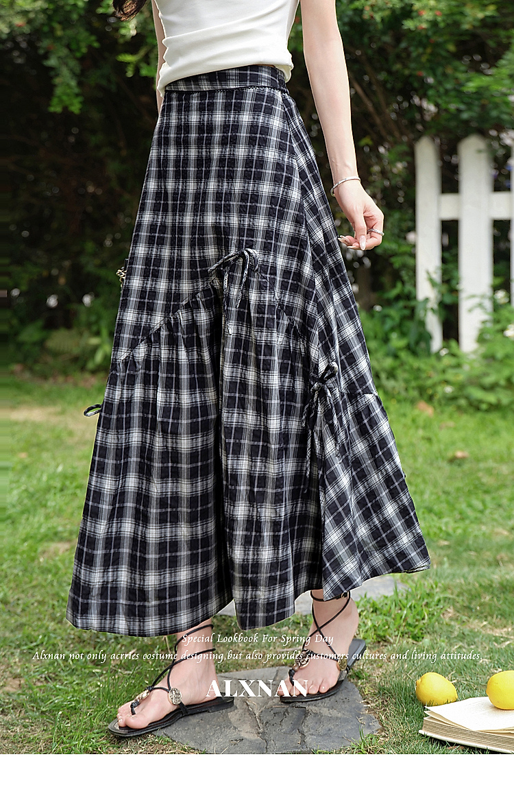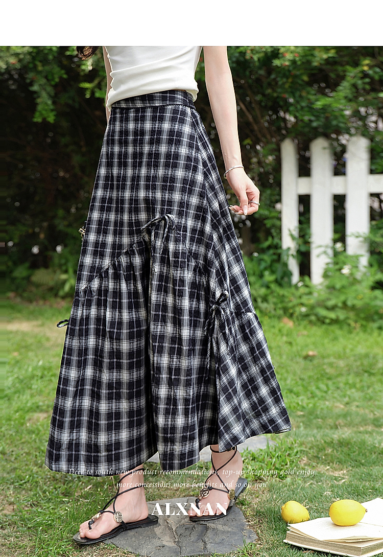 鹿向南「星落左岸」复古黑色格纹半身裙女夏新款显瘦学院风中长裙