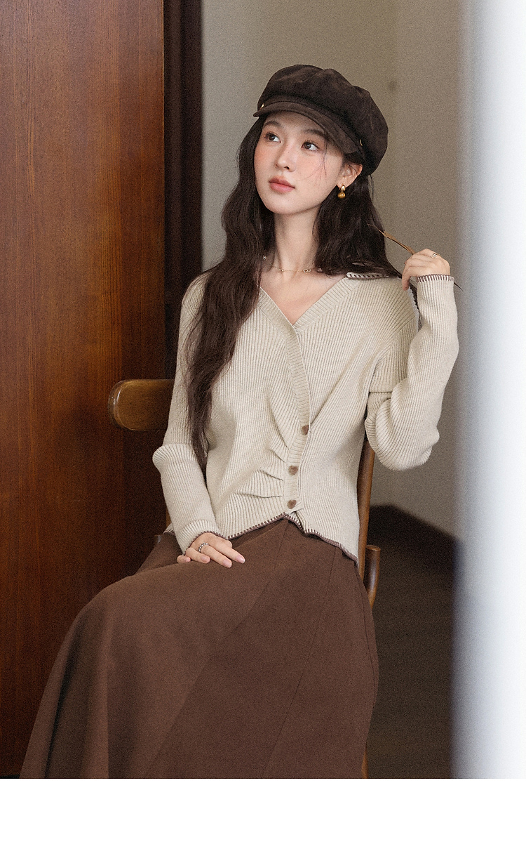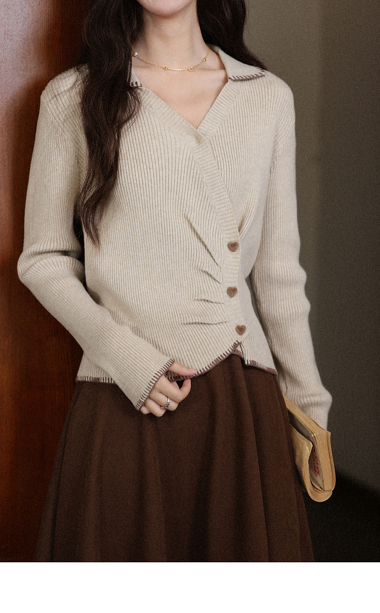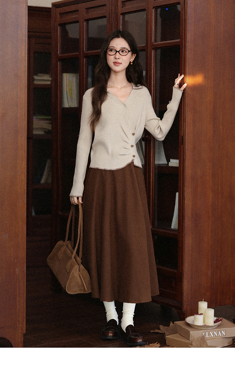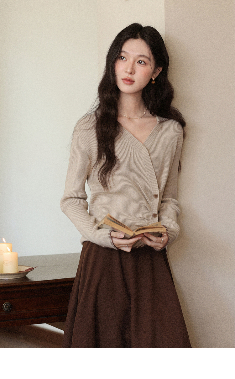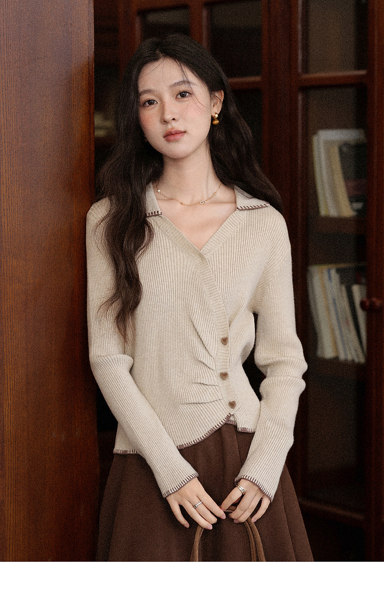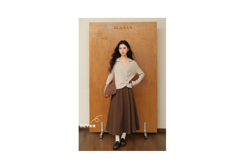 鹿向南「榛果拿铁」不规则咖米色长袖针织衫女秋季设计感修身上衣