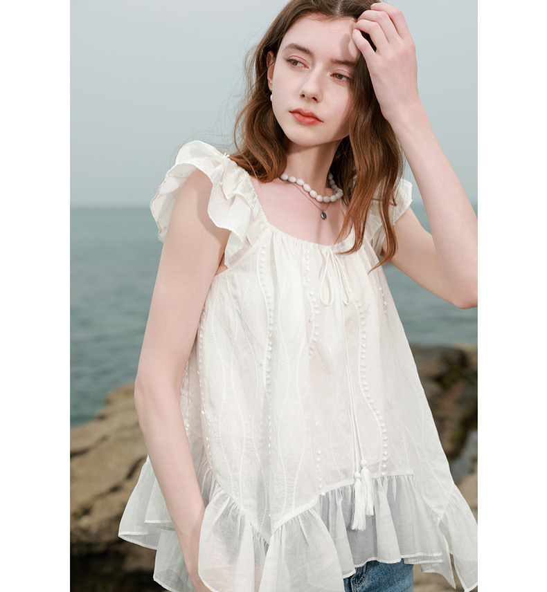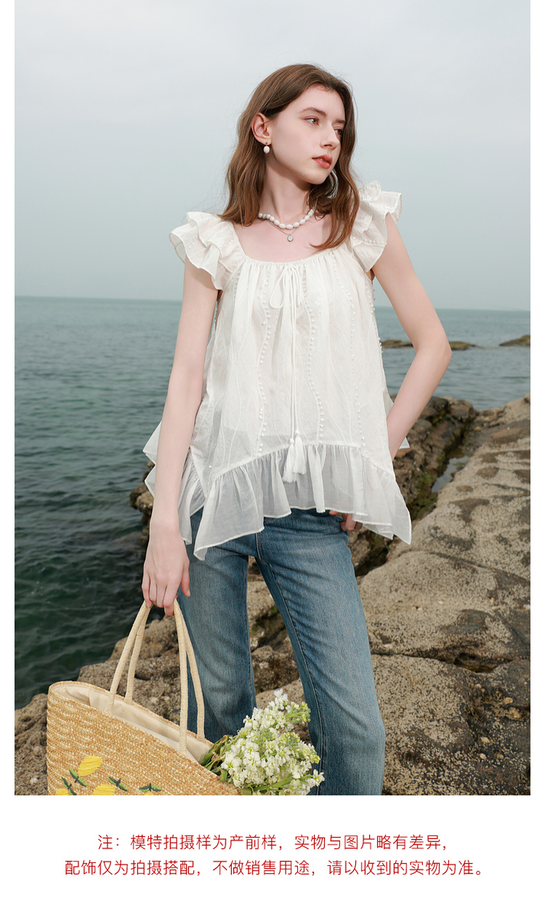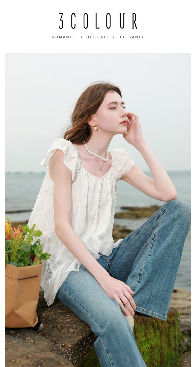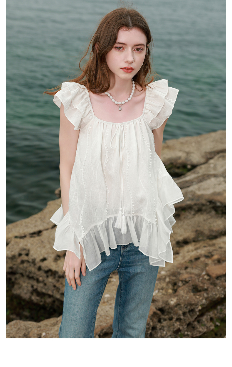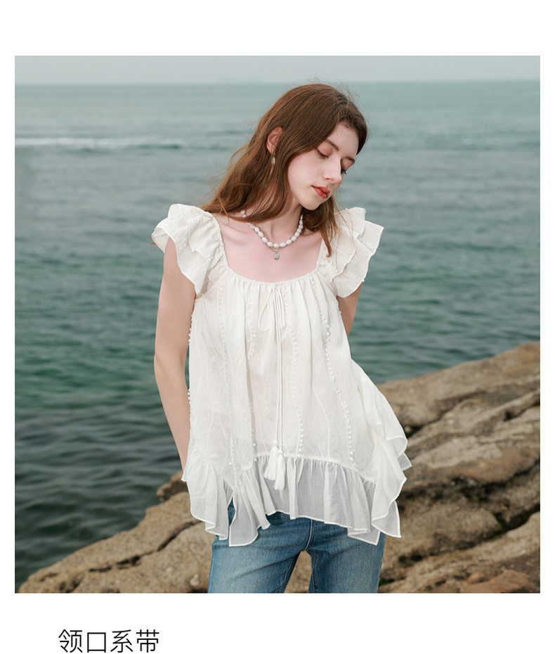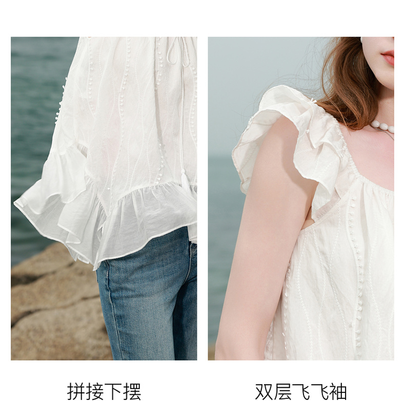 三彩2025夏季新款刺绣小衫飞飞袖系带上衣拼接宽松甜美M