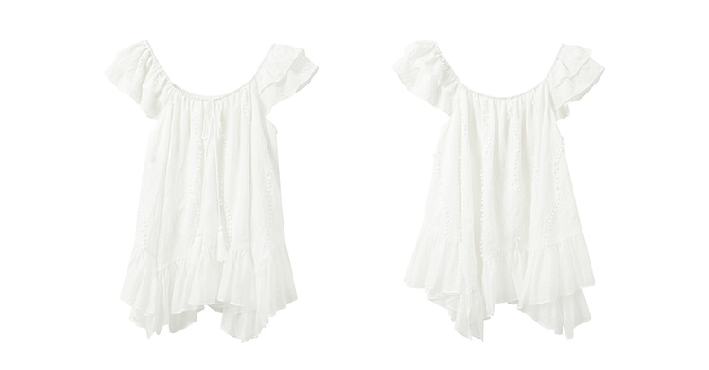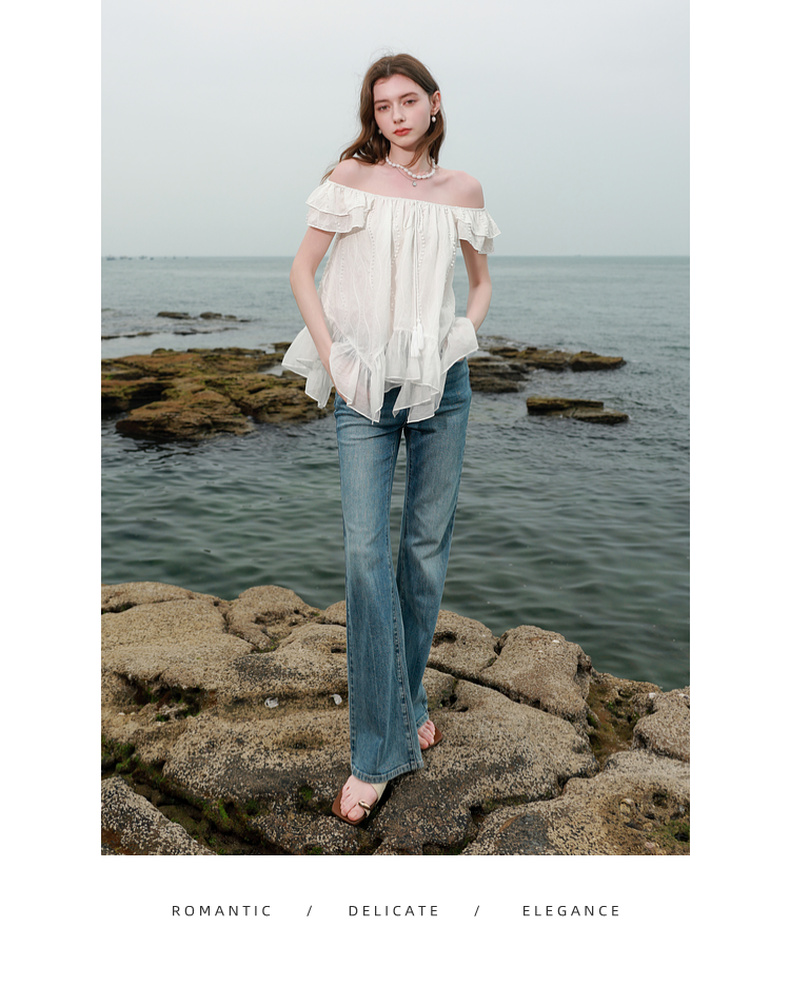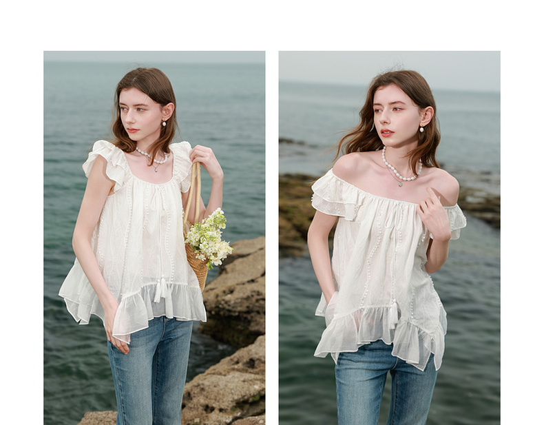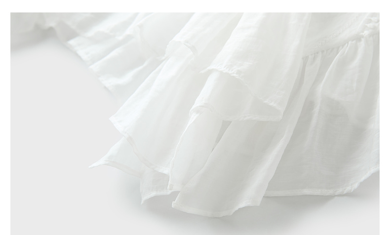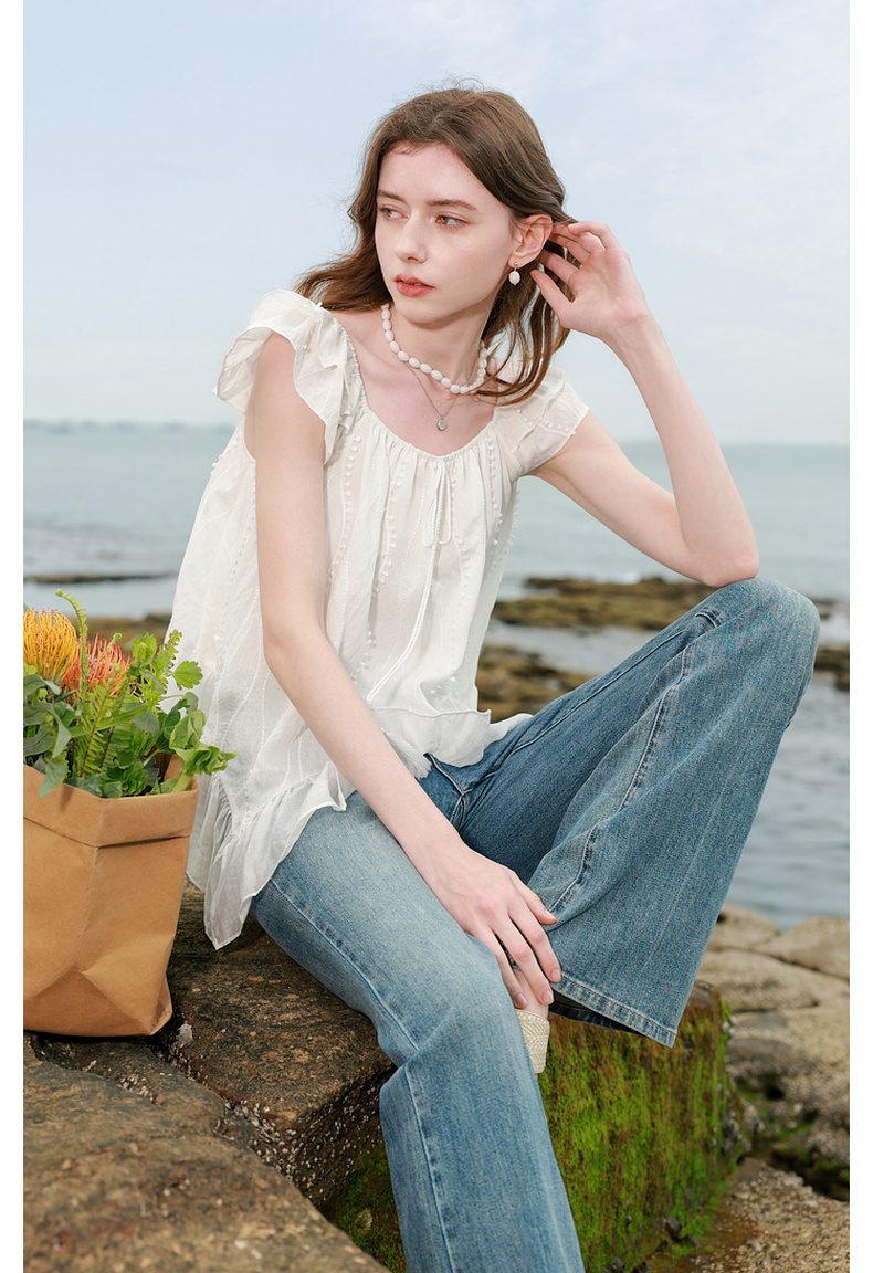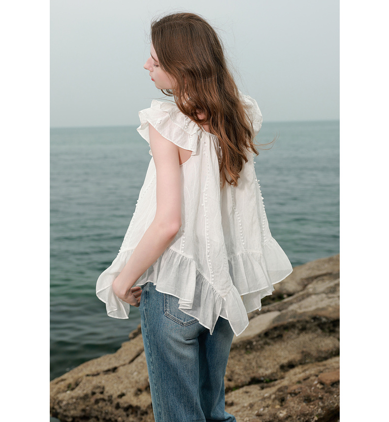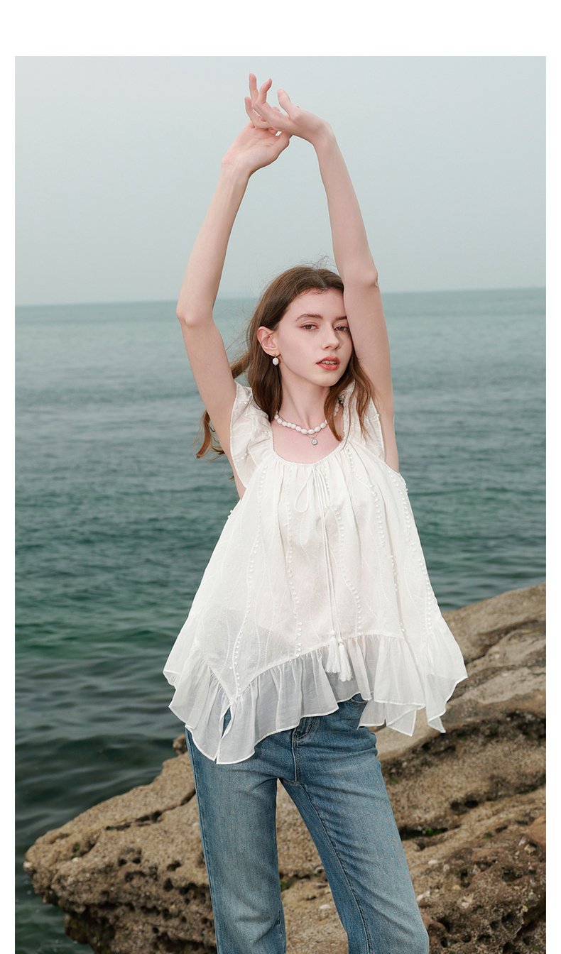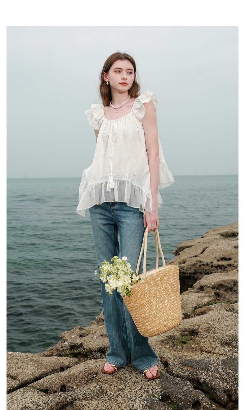 三彩2025夏季新款刺绣小衫飞飞袖系带上衣拼接宽松甜美M