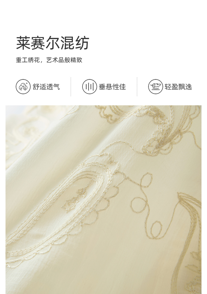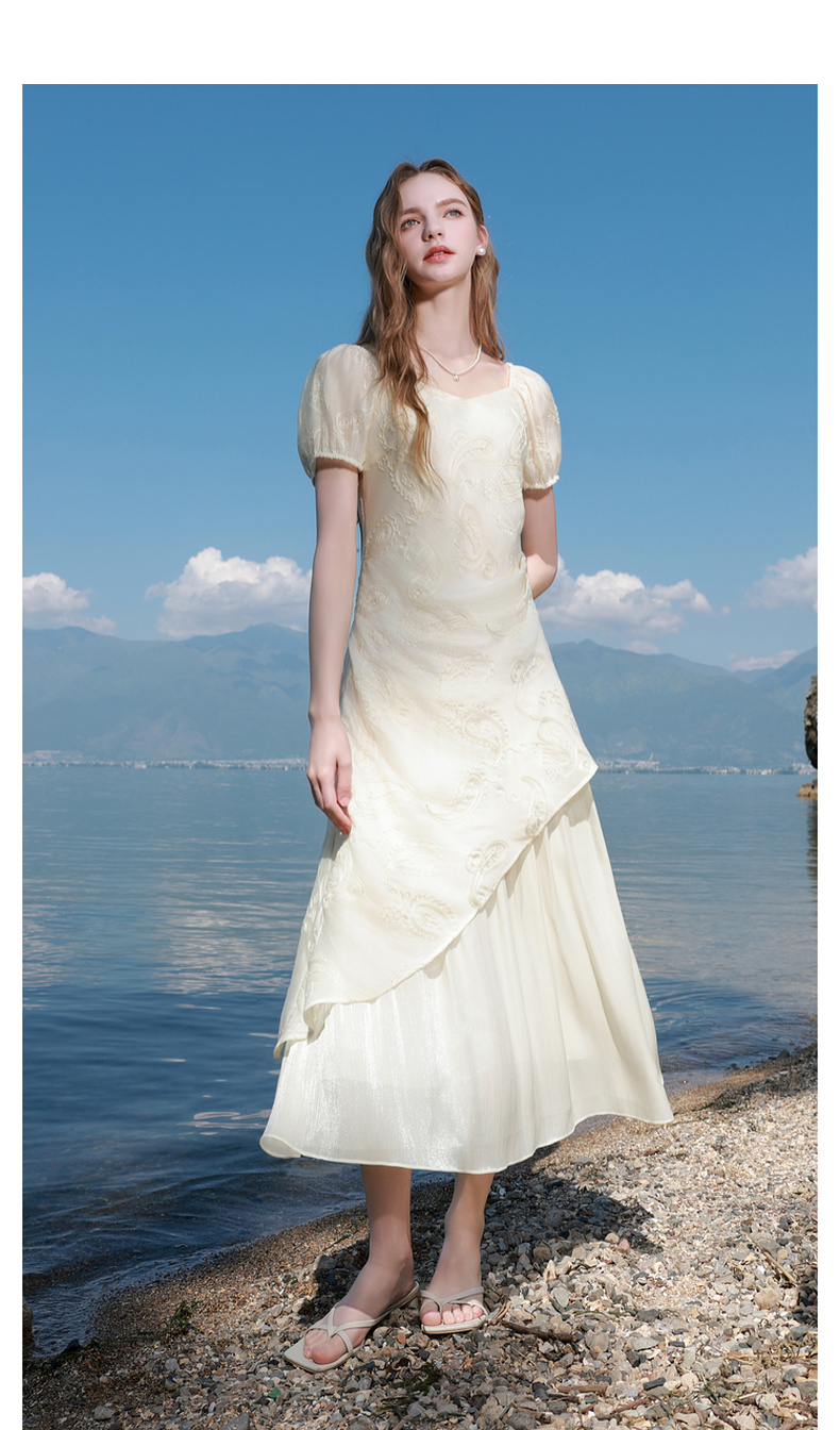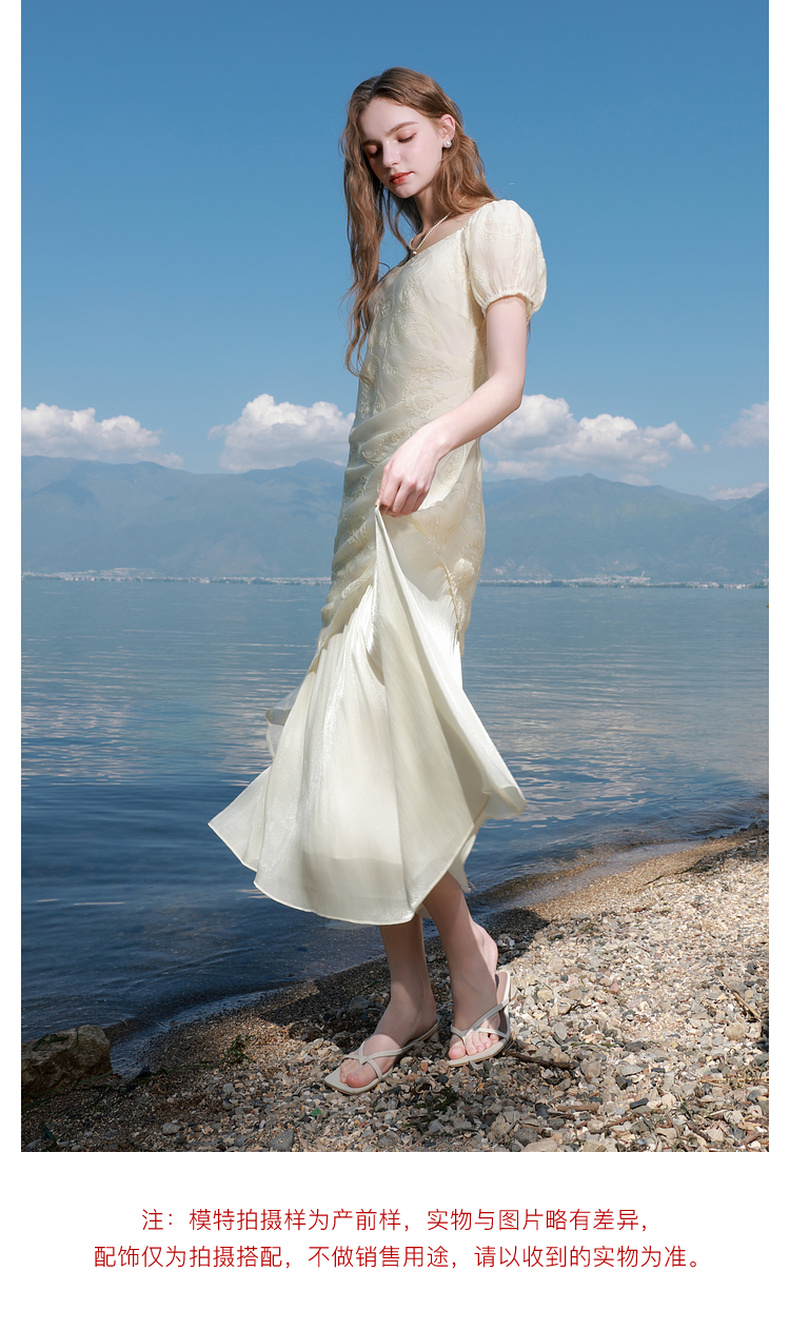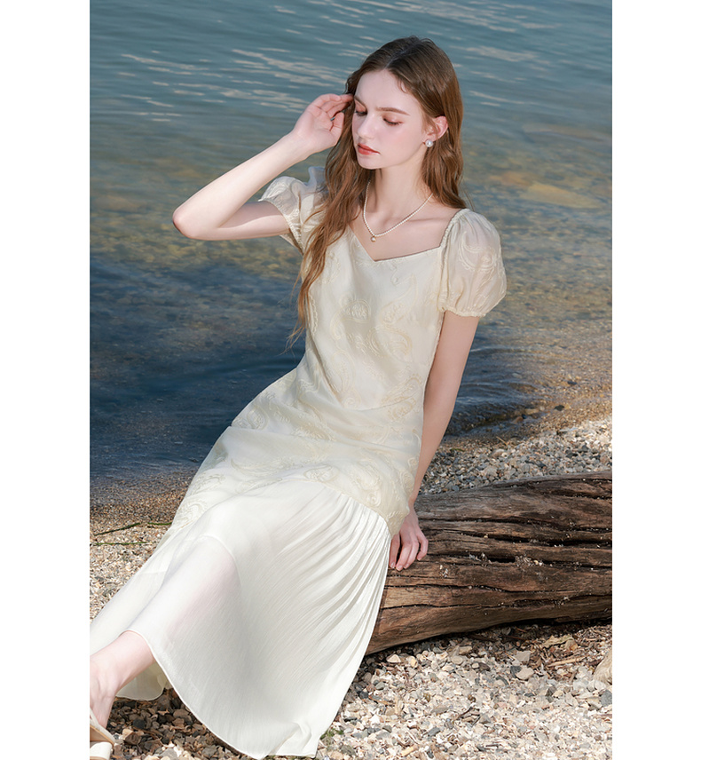【莱赛尔】三彩2025秋季新款绣花连衣裙假两件方领长裙M