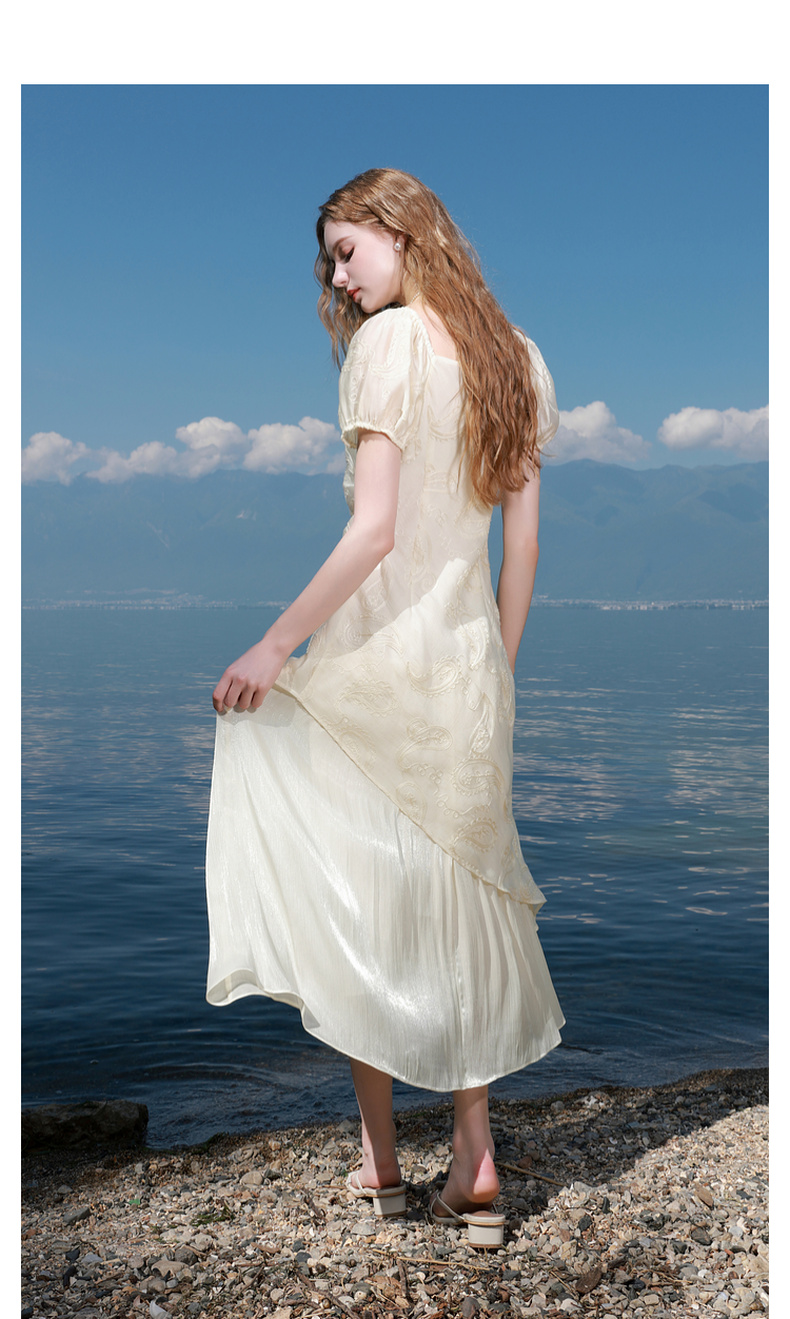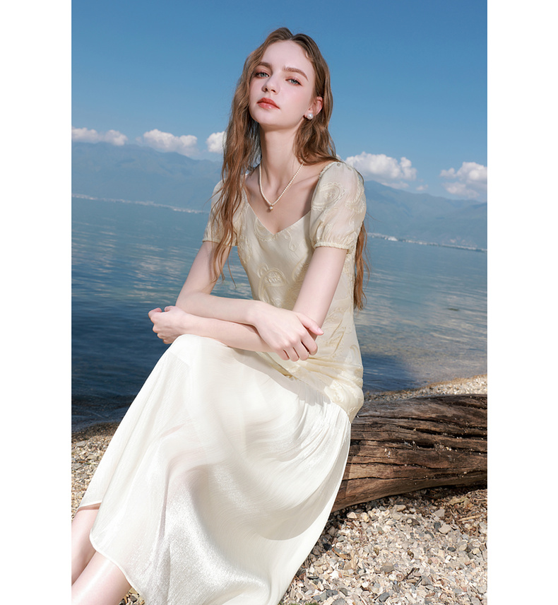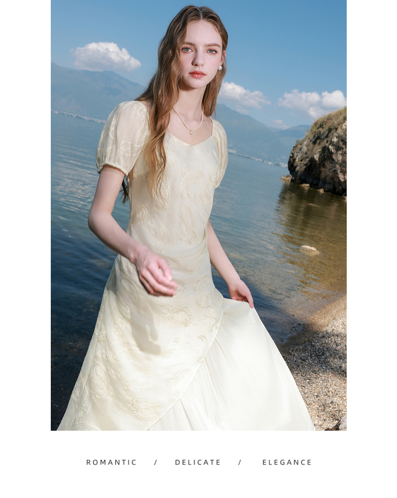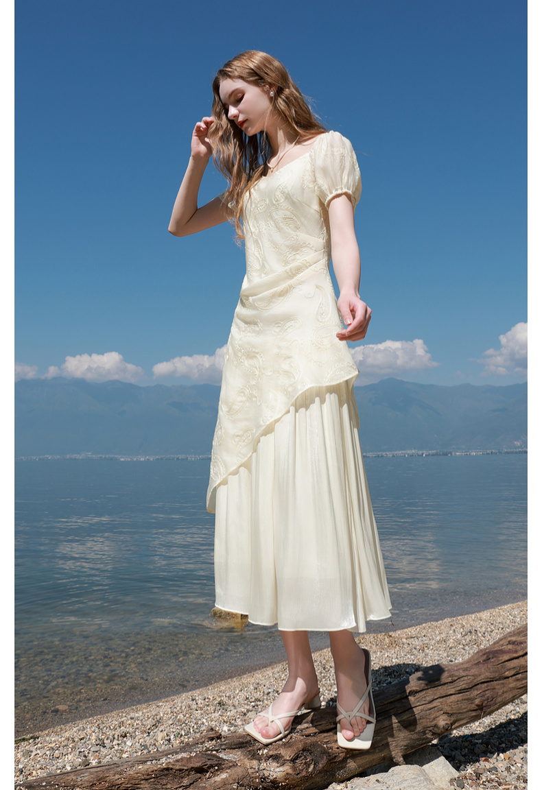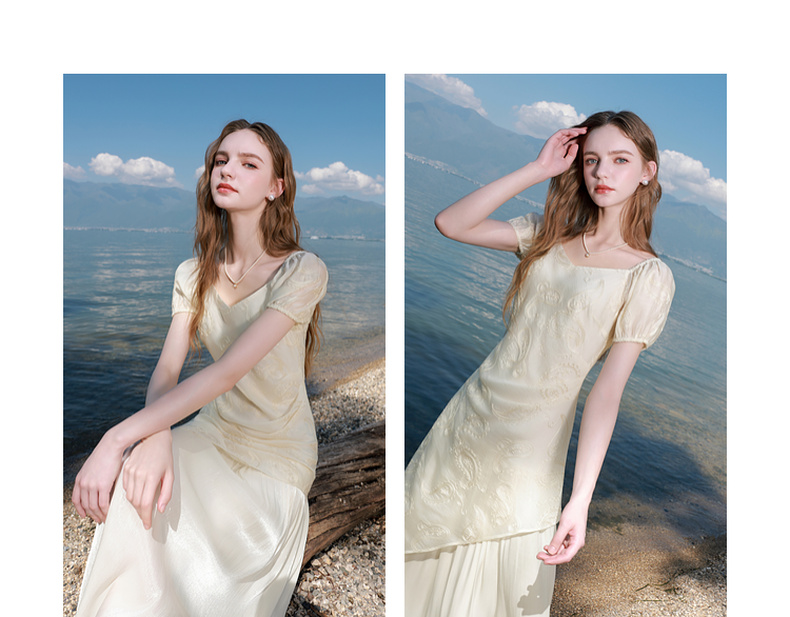 【莱赛尔】三彩2025秋季新款绣花连衣裙假两件方领长裙M