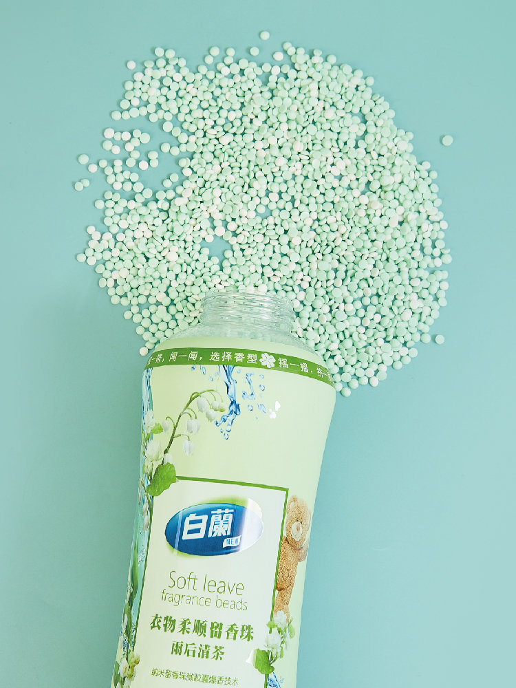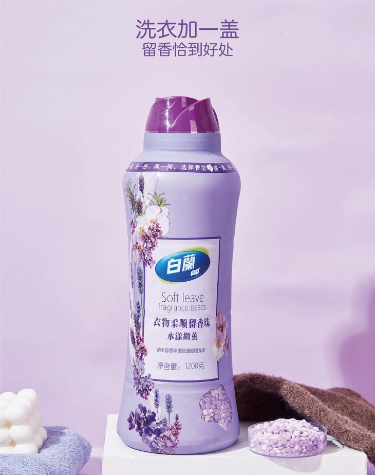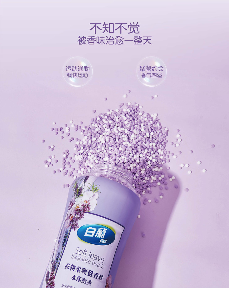 白蘭衣物柔顺留香珠(水漾微薰) 采用微胶囊爆香工艺,当衣服和肌肤摩擦的时候,裹挟在衣服里面的微胶囊就会像爆珠一样爆开,自然越穿越香
