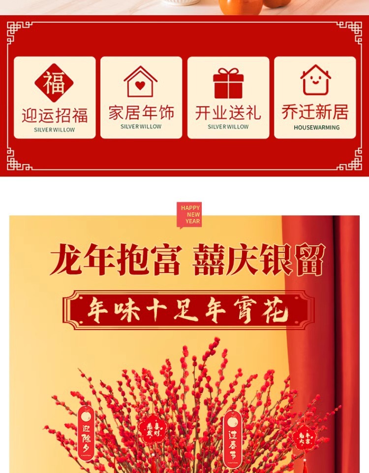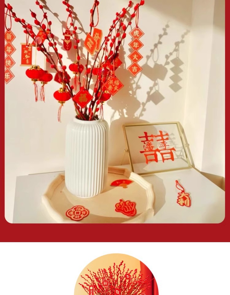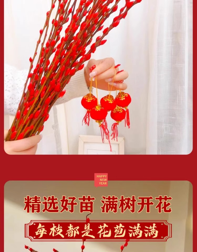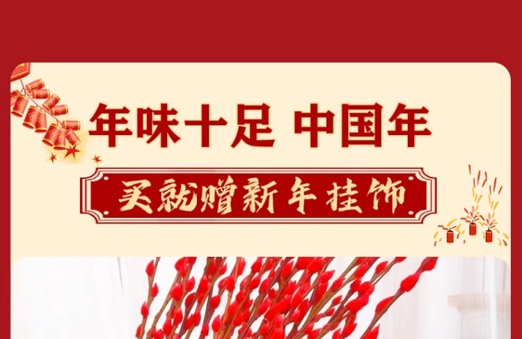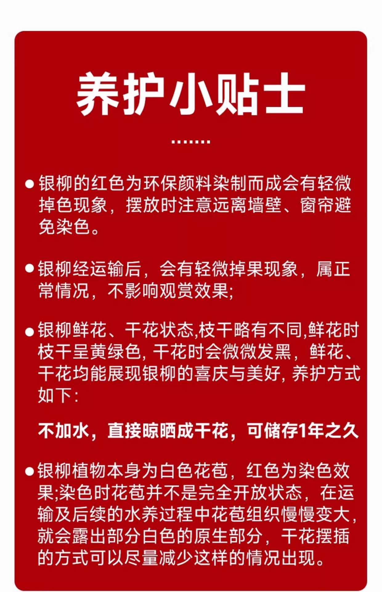 银柳的红色为环保颜料染制而成会有轻微掉色现象,摆放时注意远离墙壁、窗帘避免染色。