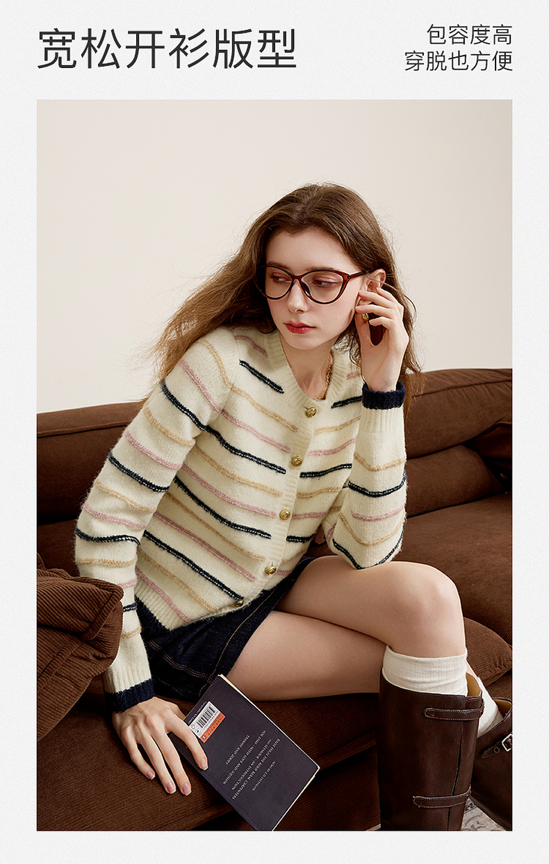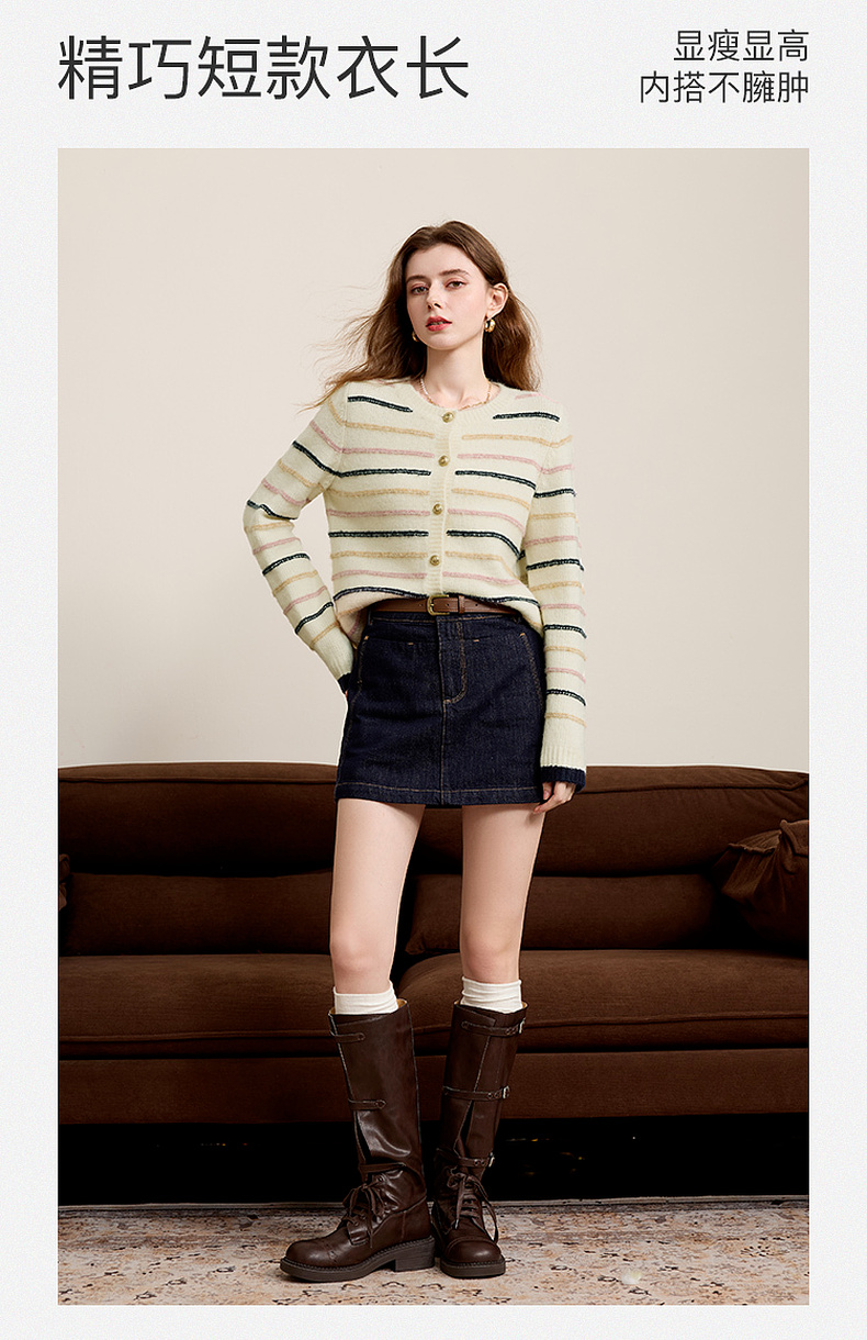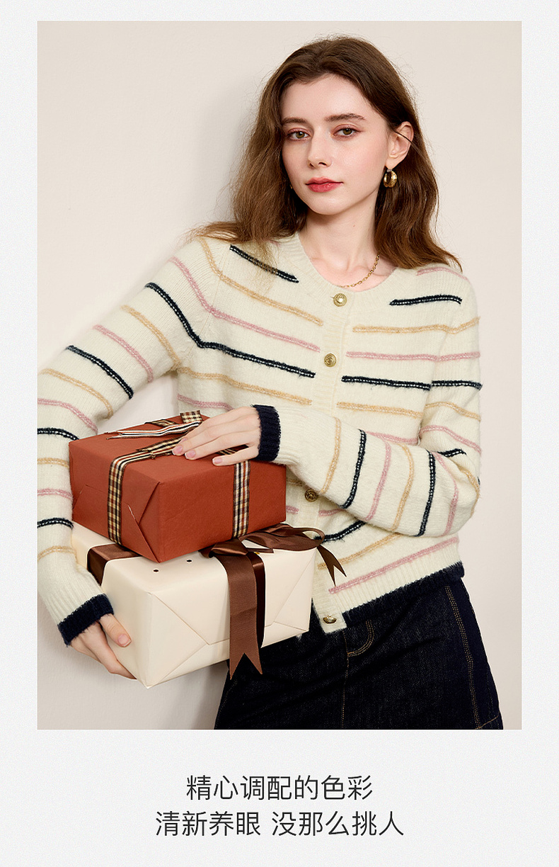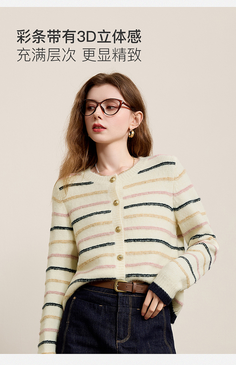 三彩2025春季新款条纹针织衫复古圆领毛衣开衫外套显瘦短款M