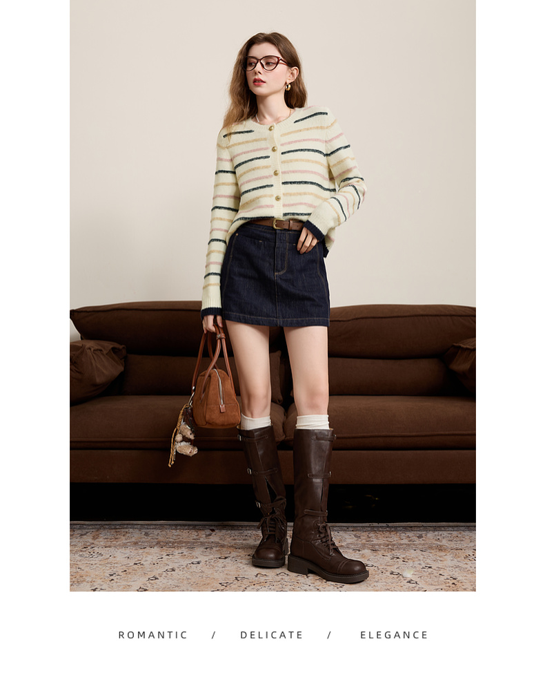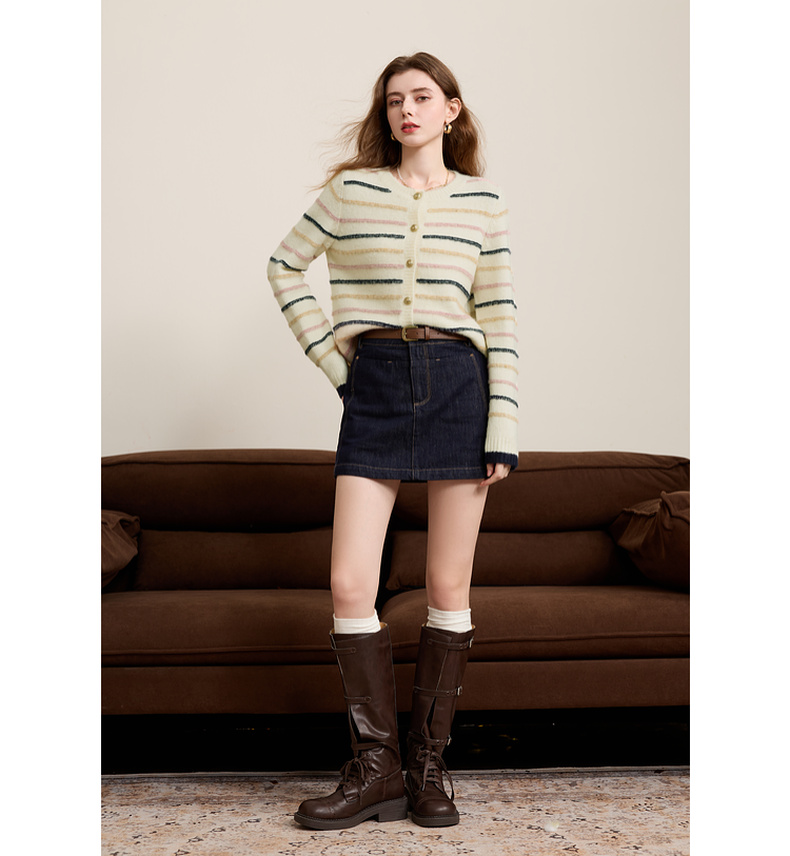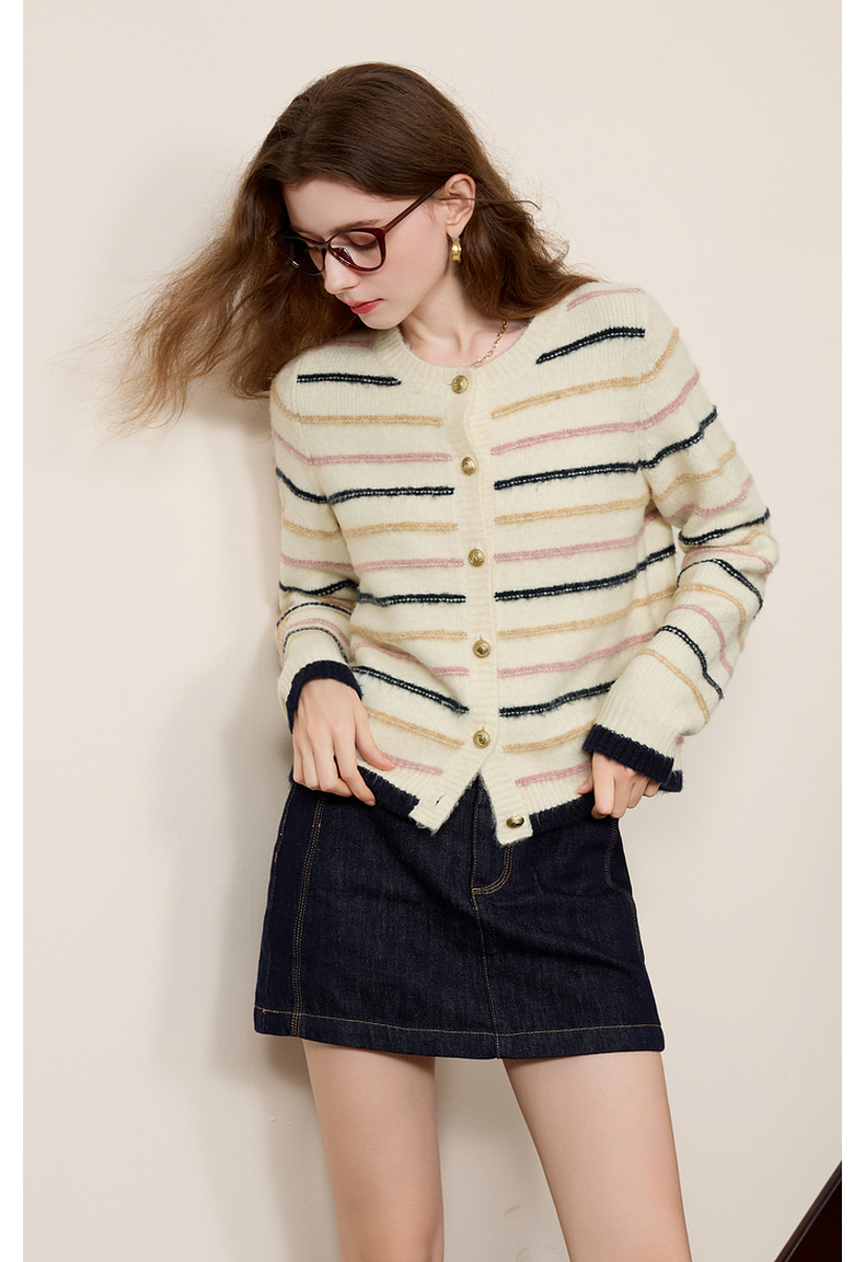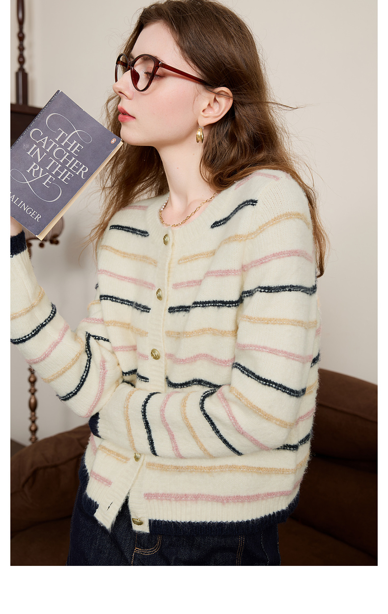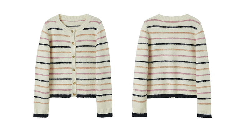 三彩2025春季新款条纹针织衫复古圆领毛衣开衫外套显瘦短款M