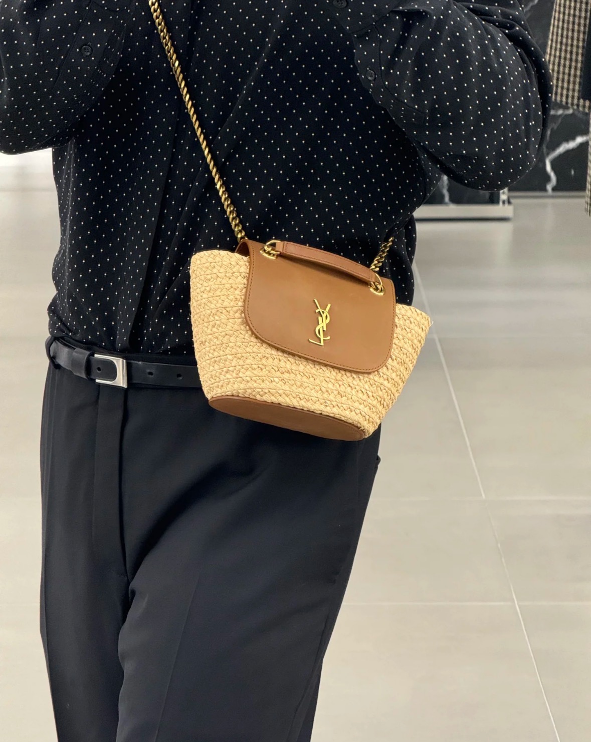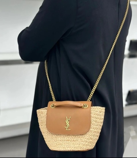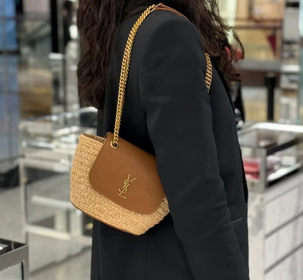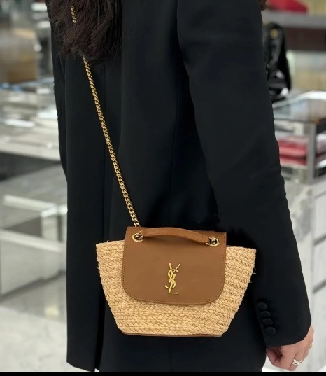圣罗兰 拉菲草拼小牛皮 斜挎单肩包 女款 自然色拼砖红色