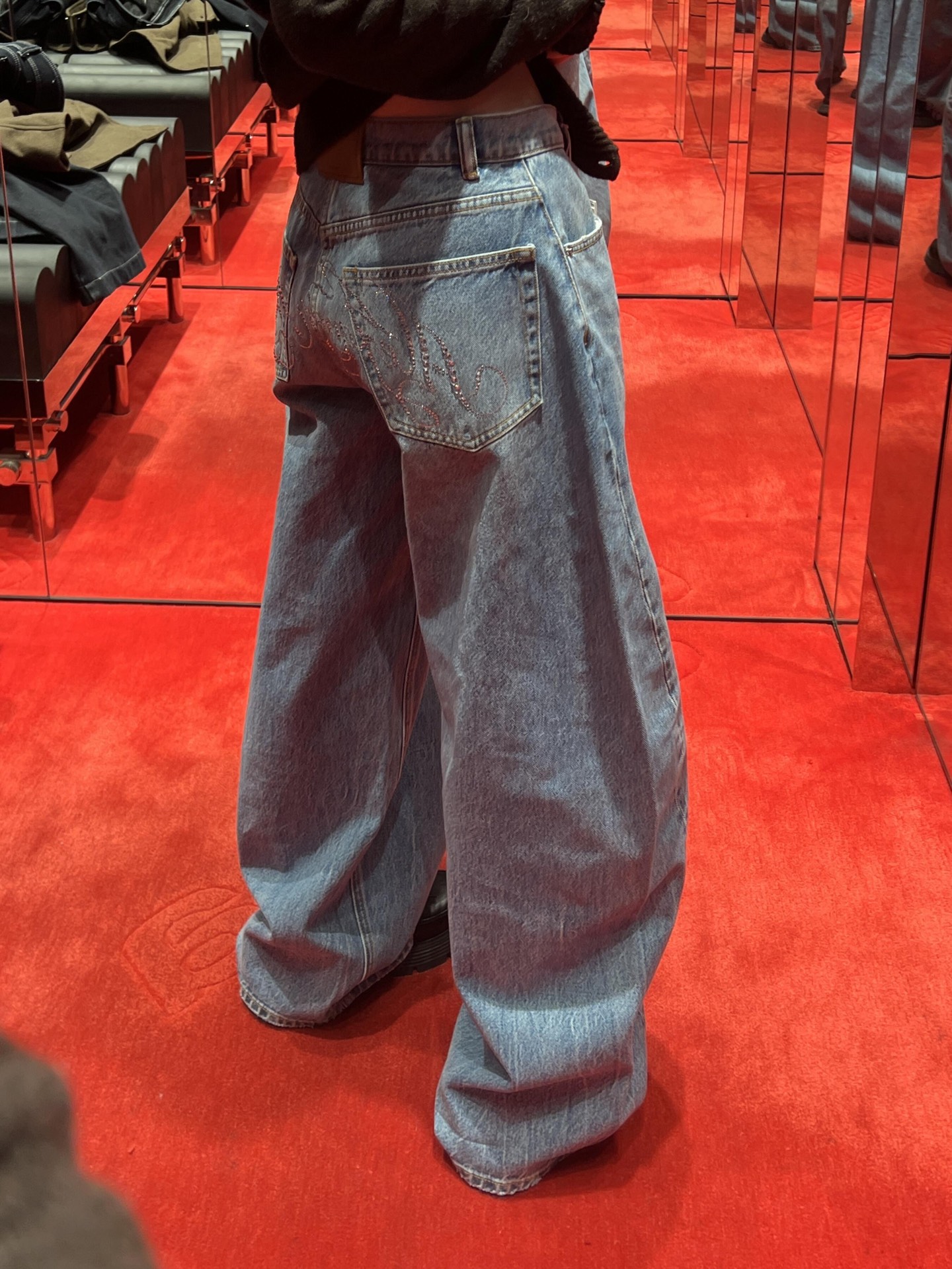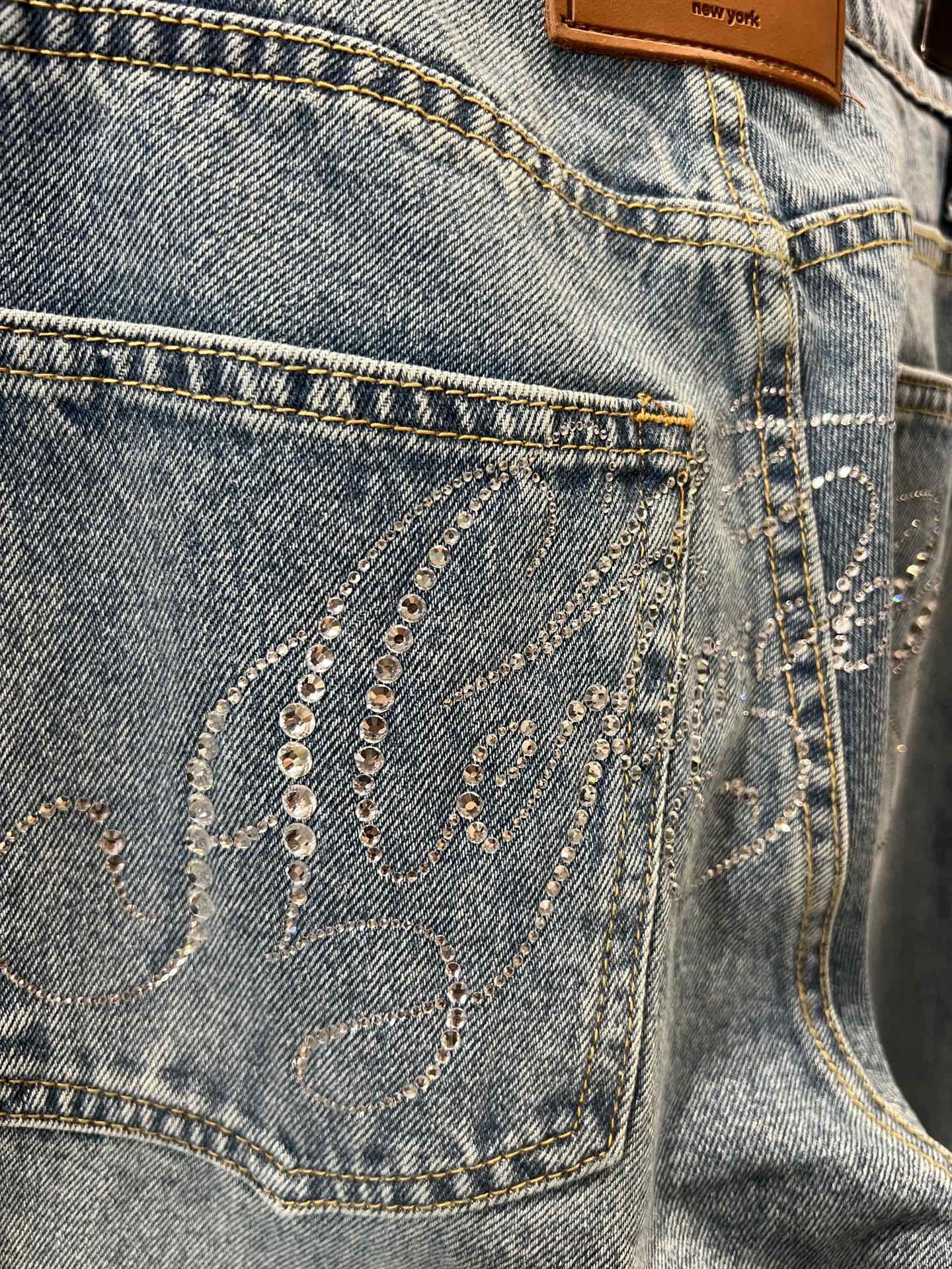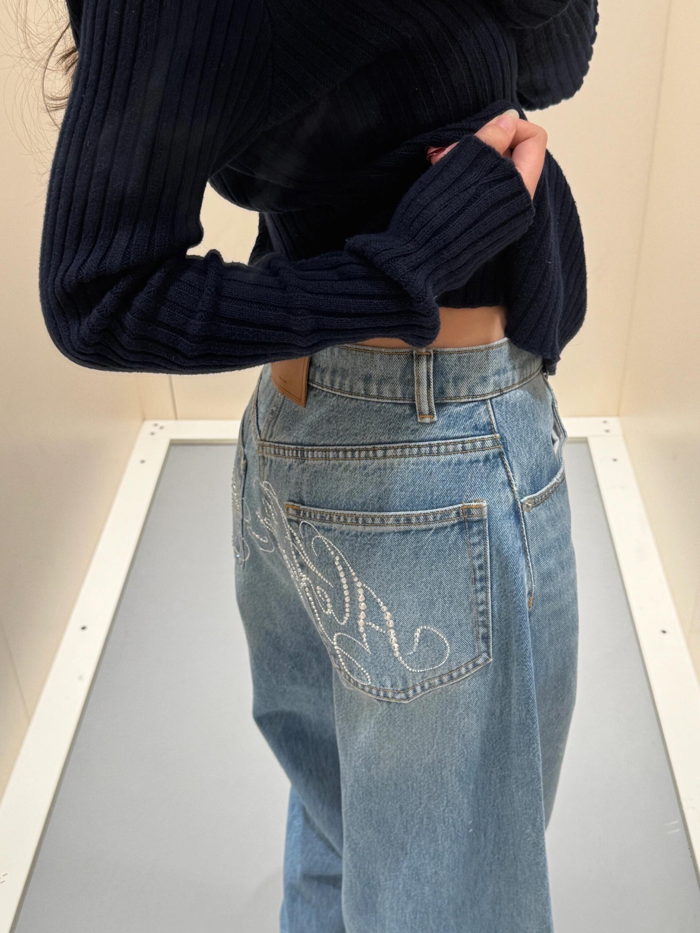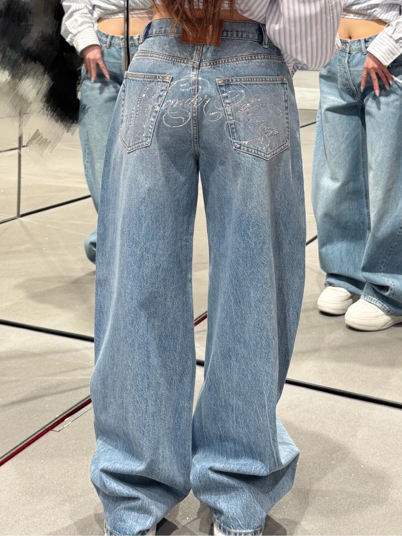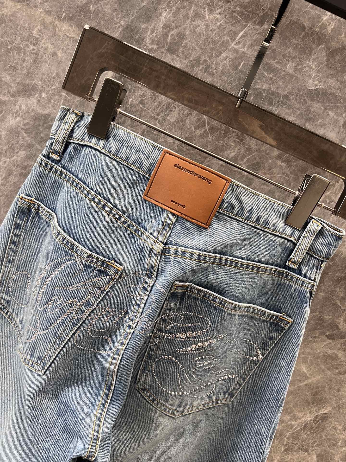 Alexa*der wang 25Ss早春新款 字母烫钻弯刀牛仔长裤丨⚠独家yb开发!高版出品!绝对是王炸😎立体剪裁的弯刀裤版型➕臀部烫钻点缀,简直不要太绝!!!弯刀剪裁的裤腿,对于腿不直有很好的修饰作用,上身不会贴腿!有很好的空气垂感且无形中藏肉肉,很巨巨巨显腿长! 做工品质看细节