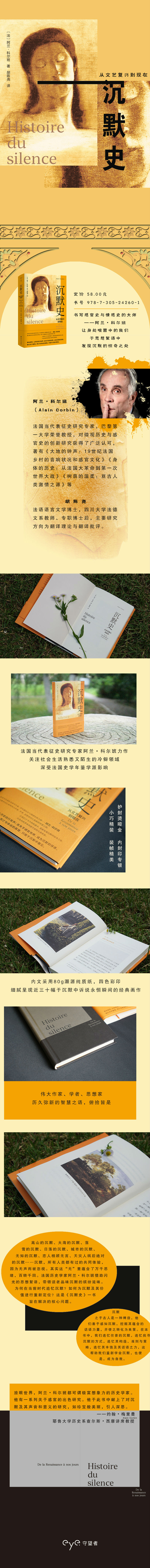 科尔班认为,沉默,不仅仅是没有声音。沉默存在于我们内部,存在于伟大的作家、思想家、学者和有信仰者数世纪以来所构建的内心城堡之中。然而,尽管沉默是我们某些激荡心灵的体验的核心,但20世纪的剧变还是慢慢消解了它的价值。如今,喧嚣的城市空间和各种媒体持续不断的信息轰炸迫使我们一直保持活跃、打开耳朵。我们已不知道内心的自我为何物,这一过程正改变着个体的本质。科尔班带领读者细细品读从古至今众多重要思想家及作家的“沉默”书写,让我们重新发现了沉默的惊奇之处,以及由此带来的更丰富的生命体验。