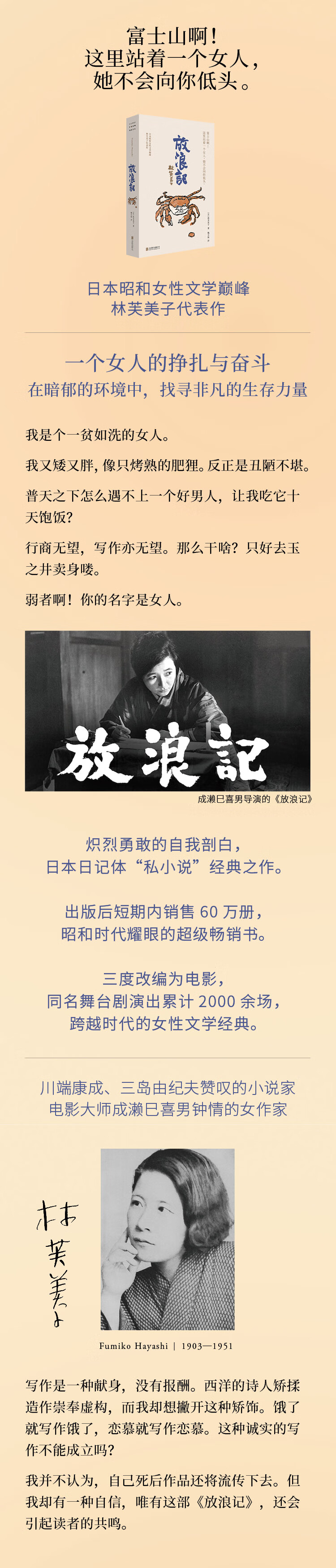 《放浪记》是日本日记体“私小说”中的经典,也是林芙美子的成名之作。这些文字最初连载于长谷川时雨的《女人艺术》杂志,后于昭和五年(1930)出版单行本,短期内便创下60万册销量的佳绩,成为轰动全日本的超级畅销书。《放浪记》被誉为 “昭和时期日本女性文学第一杰作”,曾被木村庄十二、久松静儿和成濑巳喜男先后三次改编为电影,并以舞台剧的形式在日本上演两千余场。 早年的林芙美子为生计长年挣扎于底层,她做过女佣,摆过货摊,进过工厂,当过酒吧女招待,还遭遇了数段坎坷的情感,但艰难的环境并未击碎她的文学梦想,也未曾让她为安稳折服于现实的婚姻,这在当时无疑是另类而超前的。林芙美子以痛快率真的笔法将这段经历写在日记里,这些日记正是《放浪记》的雏形。 具有 “即使在地上爬也要活下去的韧性”的林芙美子,在日本社会快速都市化的时代来到东京,成为众多跋涉在这座大都市中的新女性的一员,正如川本三郎所说:“我们不应该仅把林芙美子当作以前所谓的贫穷的文学少女,更应该从生活在现代都市中的自由人的角度来理解她的文学。”翻开《放浪记》,不仅能看到一个年轻女性窘迫却始终乐观诙谐的日常,一位文学大前辈极度勇敢的自我剖白,还能透过她的眼睛观赏到日本大正—昭和时代的世相纷纭。