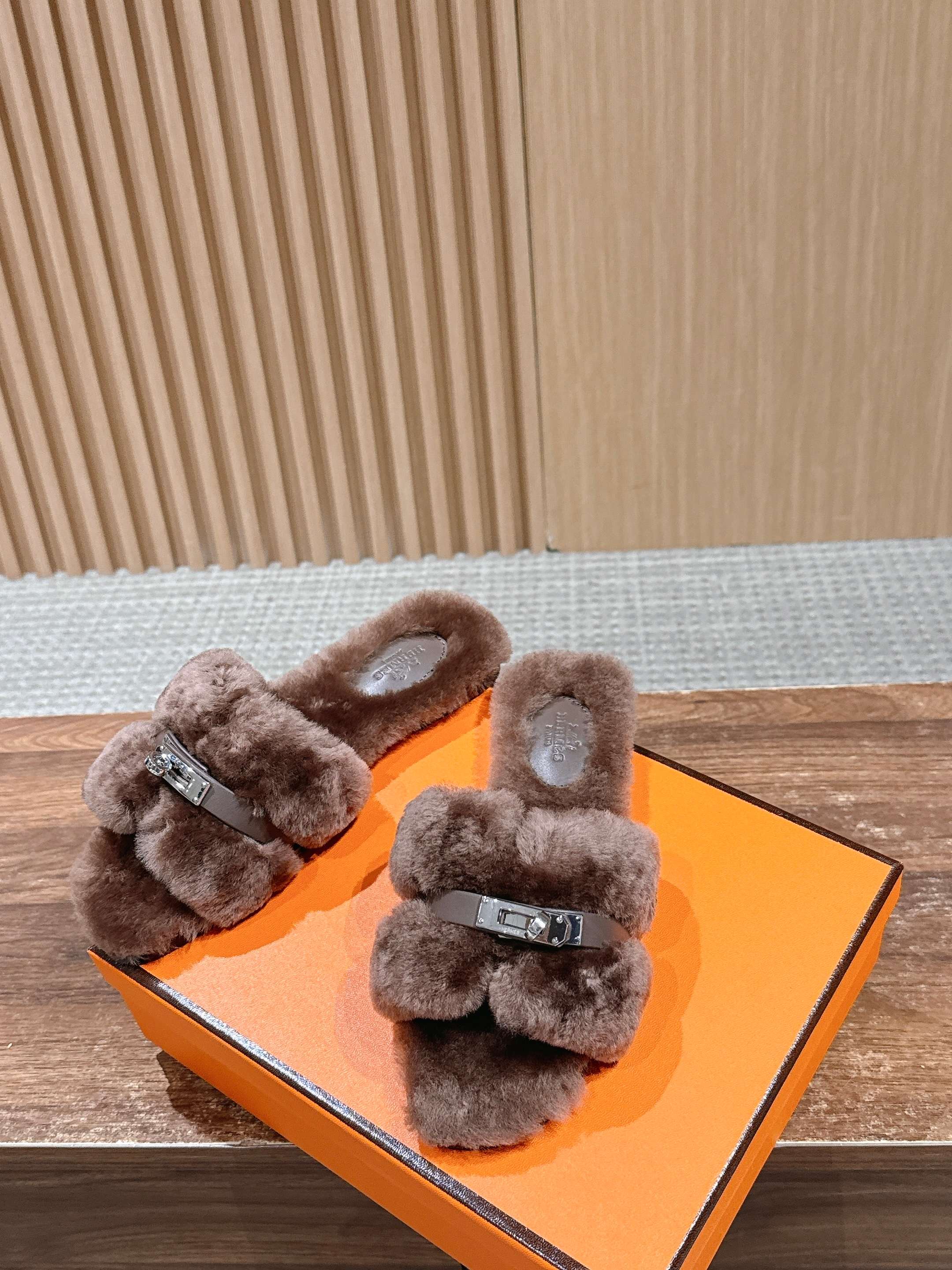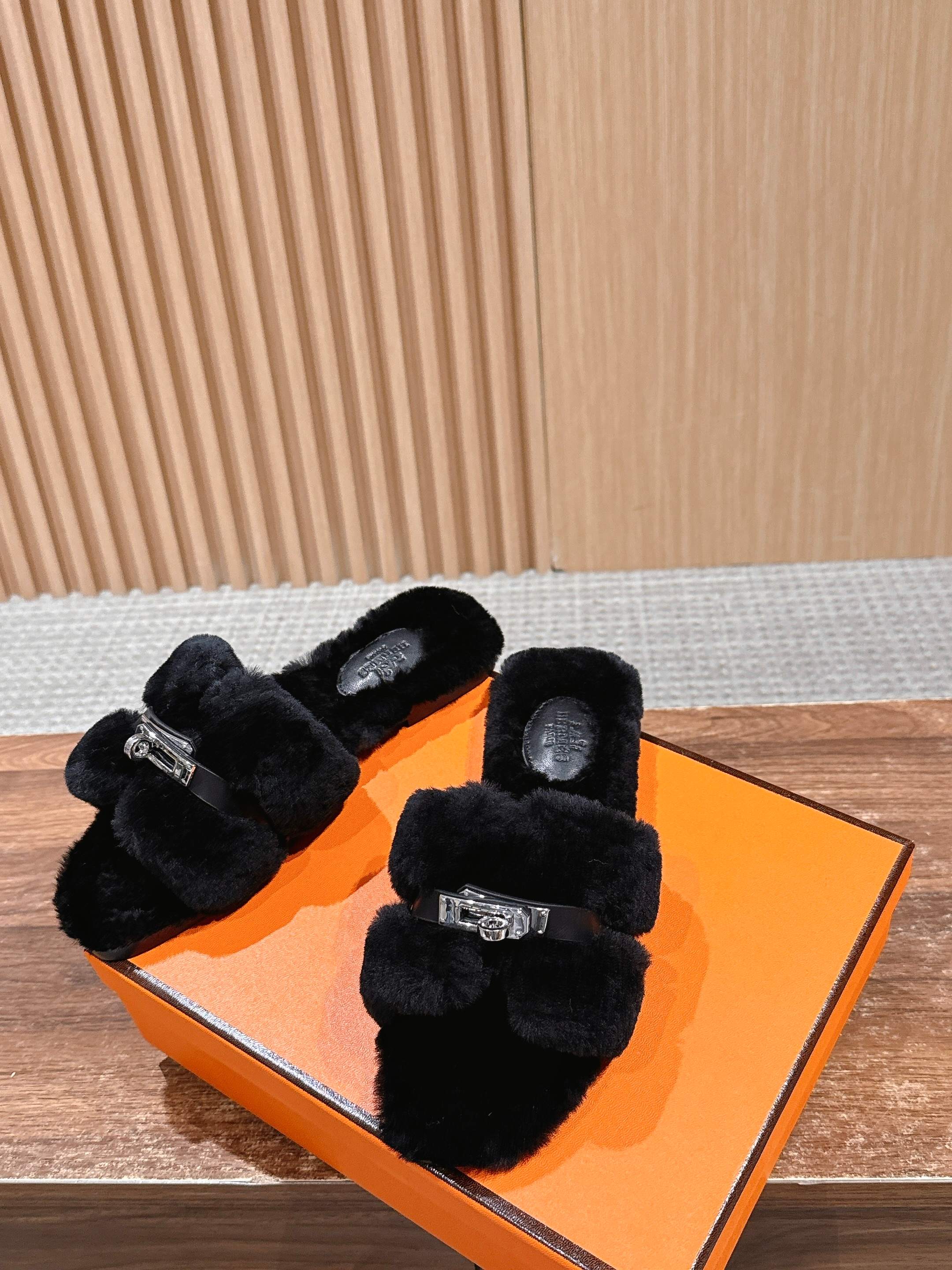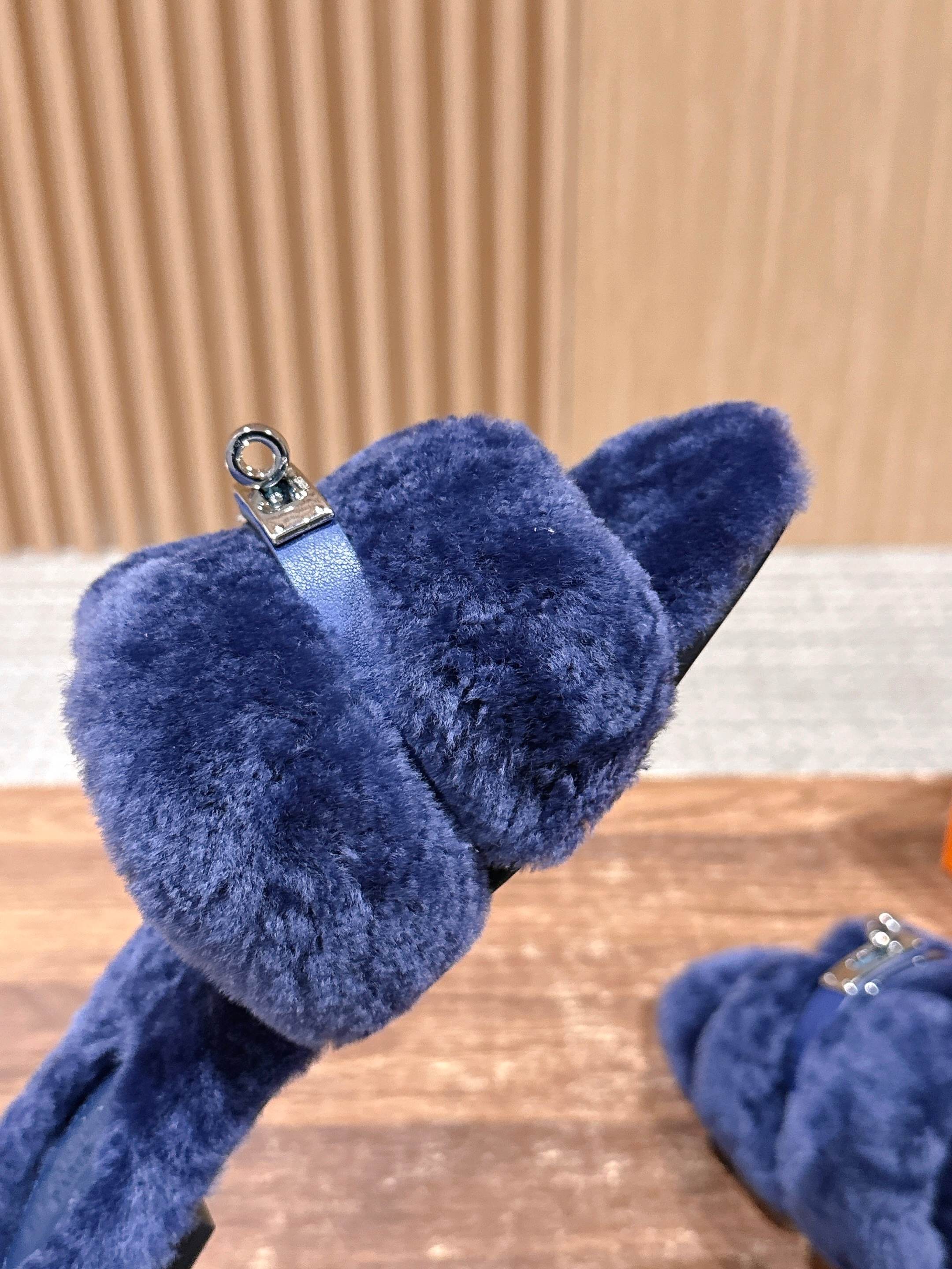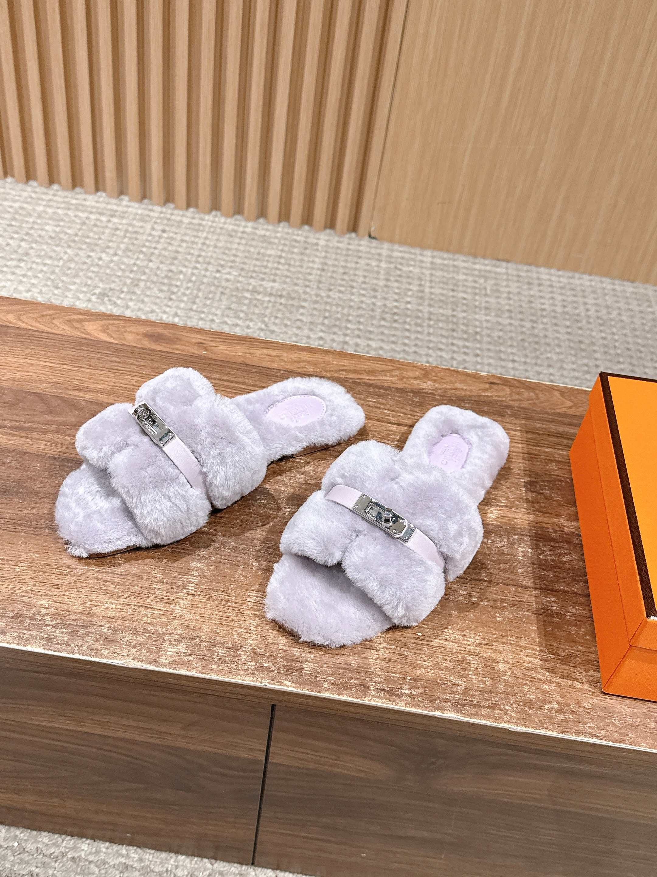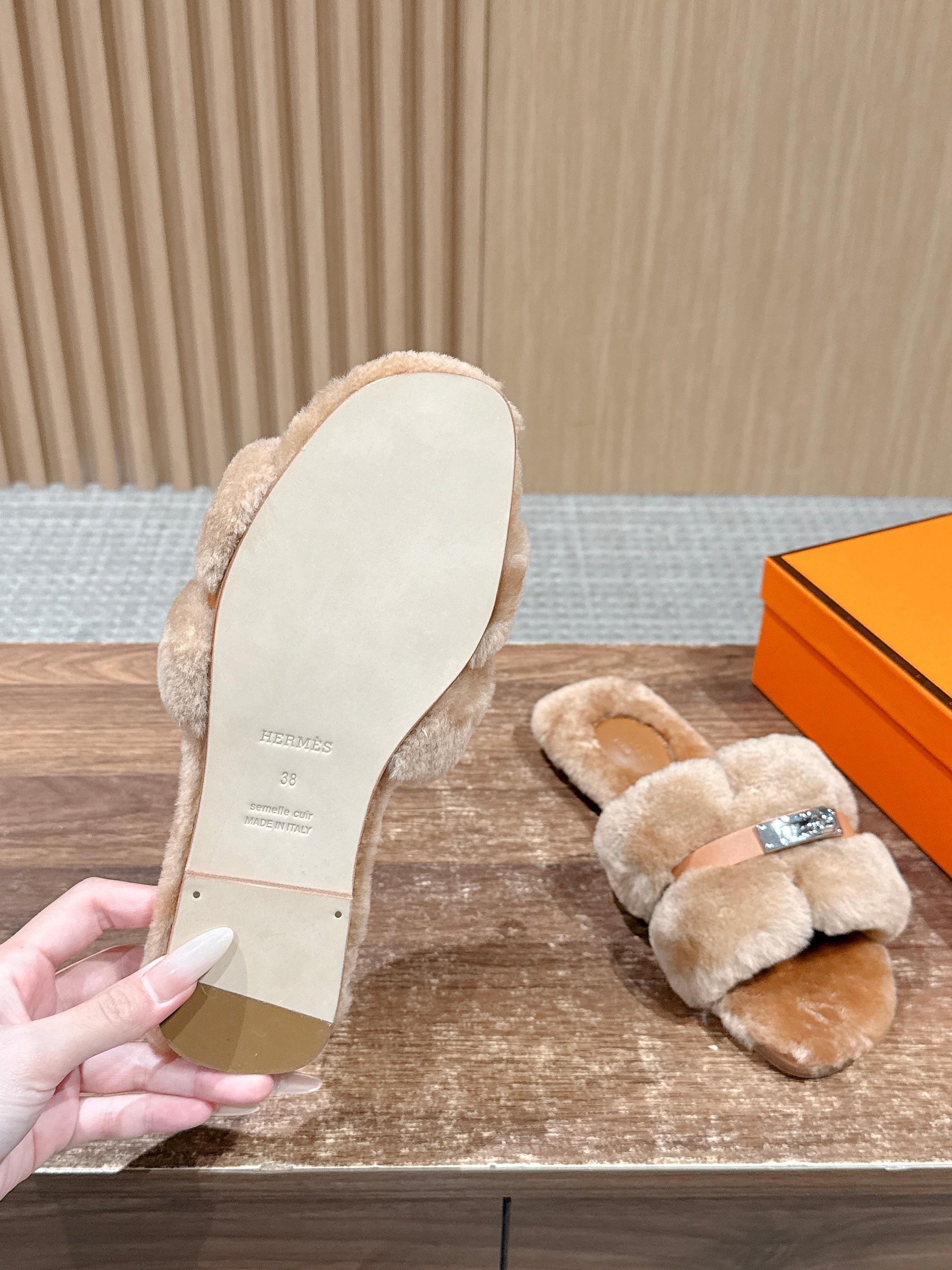 Hermer Giulia毛拖系列Kelly扣H毛拖鞋 万年经典款羊毛‘H’拖鞋 经典H拖搭配Kelly扣更为亮眼!一双平底拖鞋,属于休闲舒适的鞋款类型,适合日常居家或者在一些轻松的场合穿着。这种拖鞋款式简约却又不失时尚感,兼具实用性与时尚度。 整体采用了羊毛材质,看起来非常柔软蓬松,不仅在视觉上给人一种温暖舒适的感觉,实际穿着时也能提供极佳的亲肤体验,尤其适合在较凉爽的季节或者想要营造温暖氛围感的时候穿着。这种毛绒材质的选择也体现了品牌在材质运用上的用心,既要保证奢华感,又要兼顾穿着的舒适程度。 鞋面:羊毛 内里垫脚:羊毛 鞋底:意大利A级双层真皮大底 码数:35-39(40.41定做不退换)