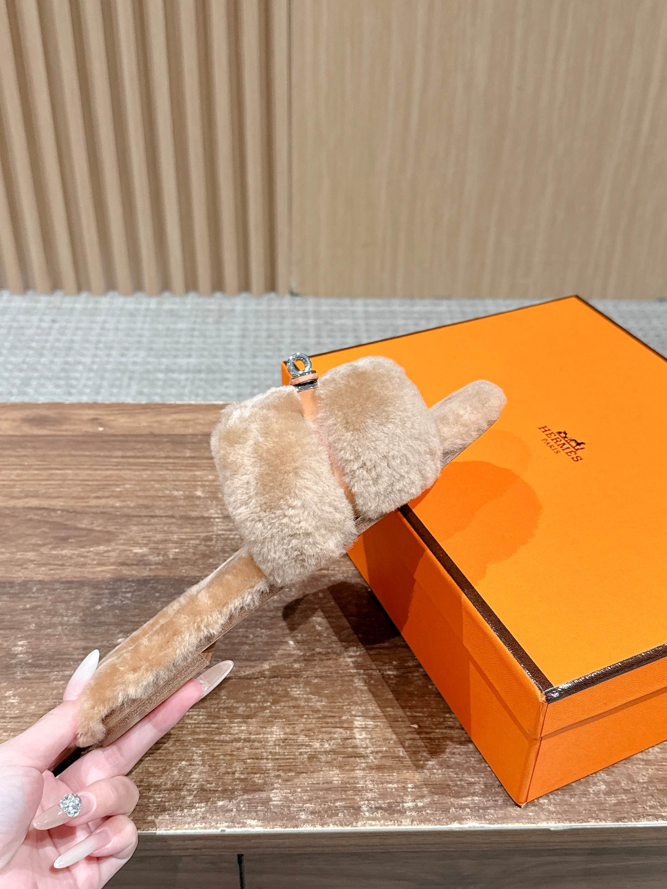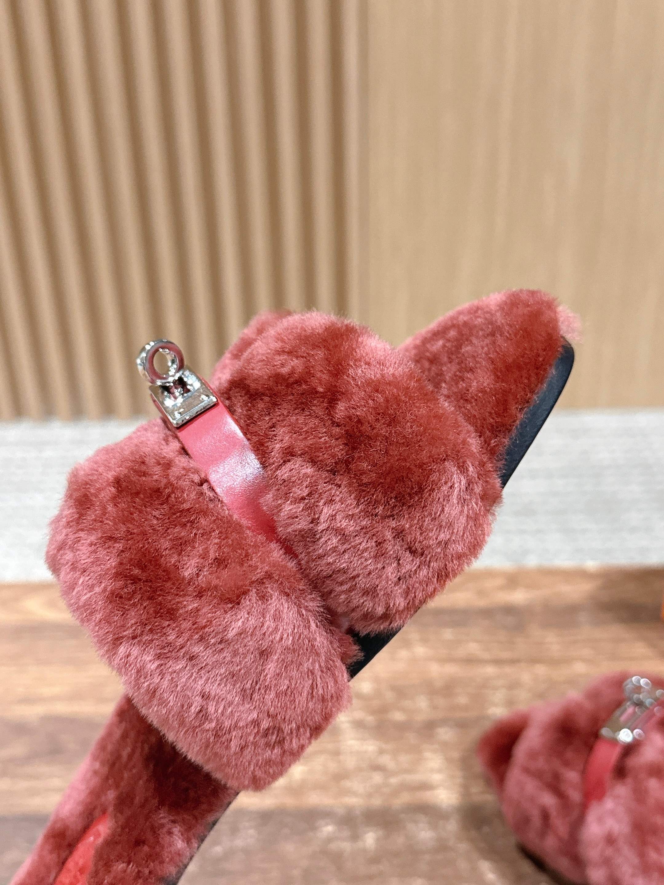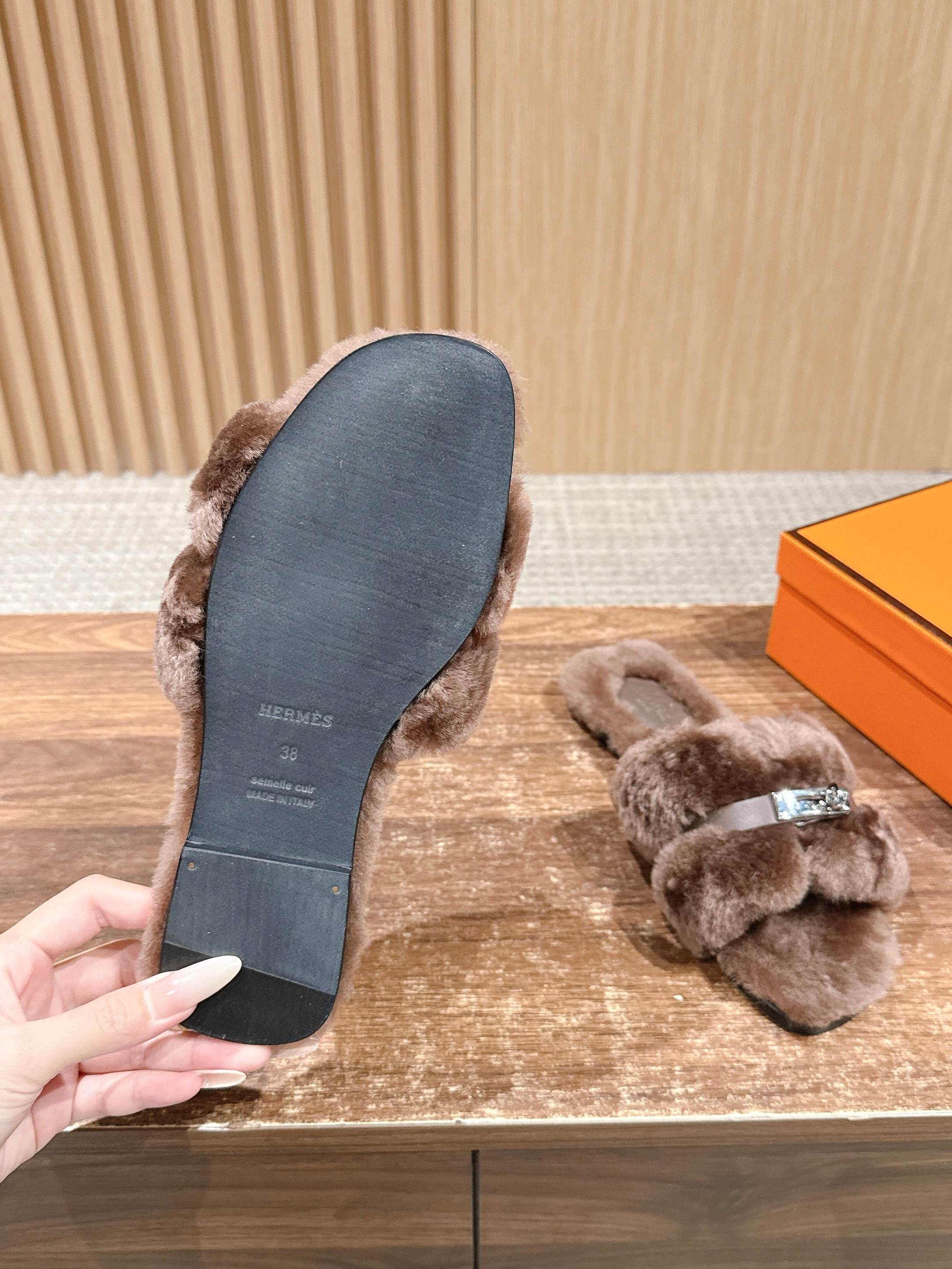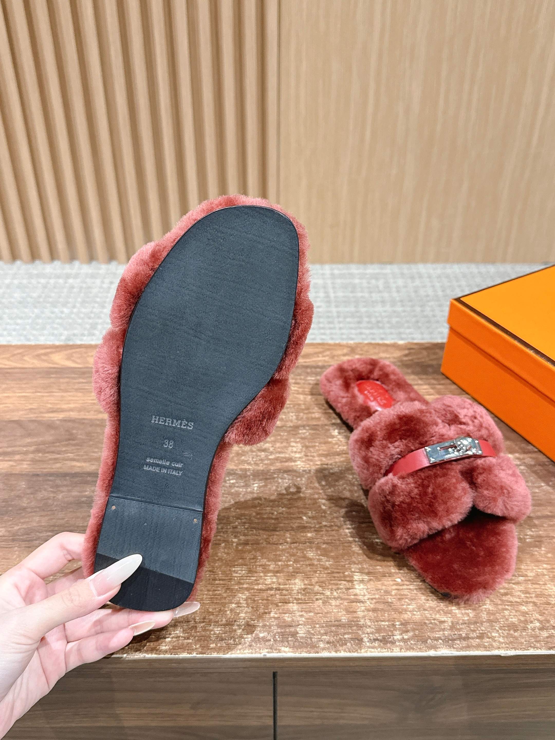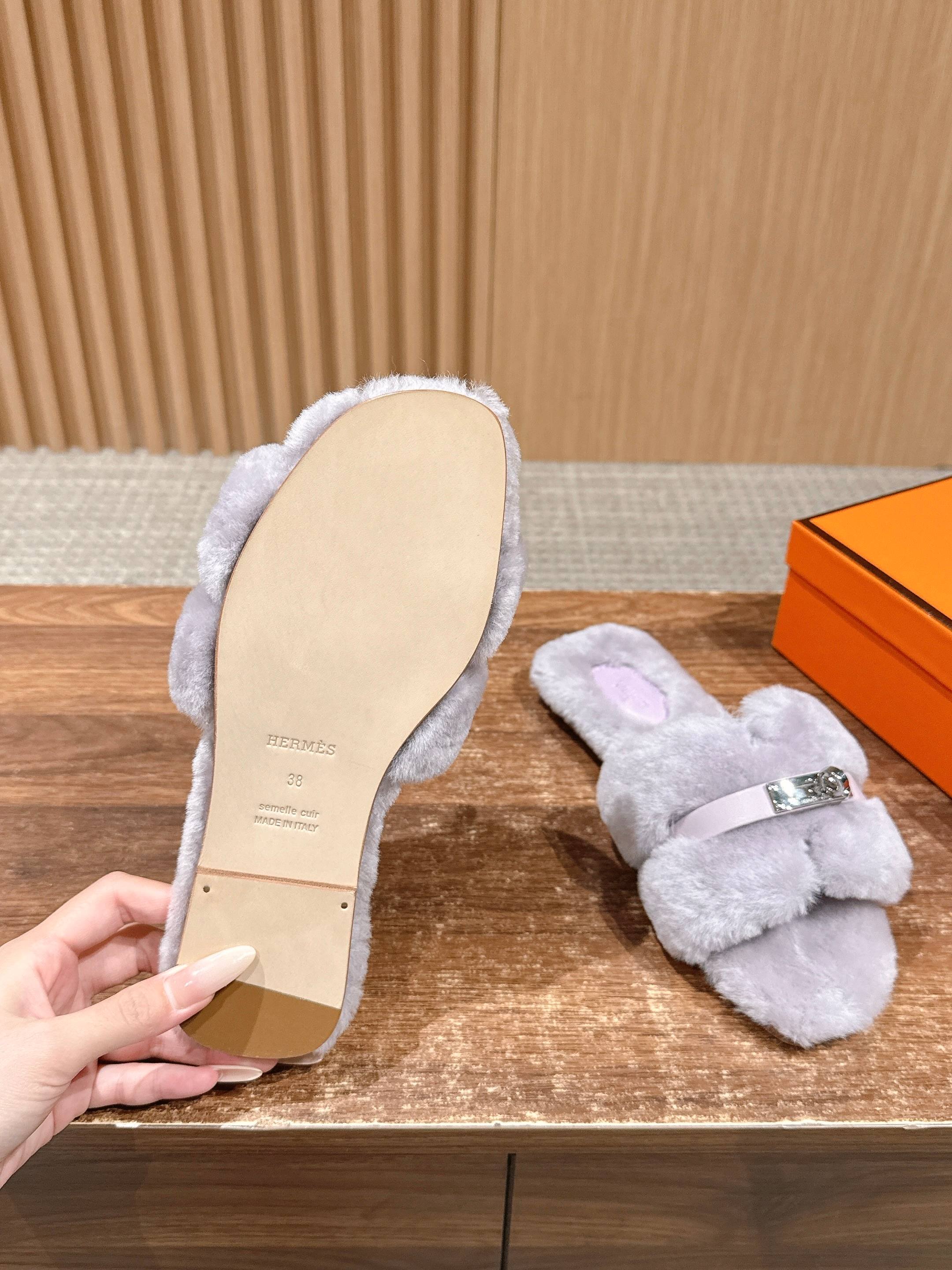 Hermer Giulia毛拖系列Kelly扣H毛拖鞋 万年经典款羊毛‘H’拖鞋 经典H拖搭配Kelly扣更为亮眼!一双平底拖鞋,属于休闲舒适的鞋款类型,适合日常居家或者在一些轻松的场合穿着。这种拖鞋款式简约却又不失时尚感,兼具实用性与时尚度。 整体采用了羊毛材质,看起来非常柔软蓬松,不仅在视觉上给人一种温暖舒适的感觉,实际穿着时也能提供极佳的亲肤体验,尤其适合在较凉爽的季节或者想要营造温暖氛围感的时候穿着。这种毛绒材质的选择也体现了品牌在材质运用上的用心,既要保证奢华感,又要兼顾穿着的舒适程度。 鞋面:羊毛 内里垫脚:羊毛 鞋底:意大利A级双层真皮大底 码数:35-39(40.41定做不退换)