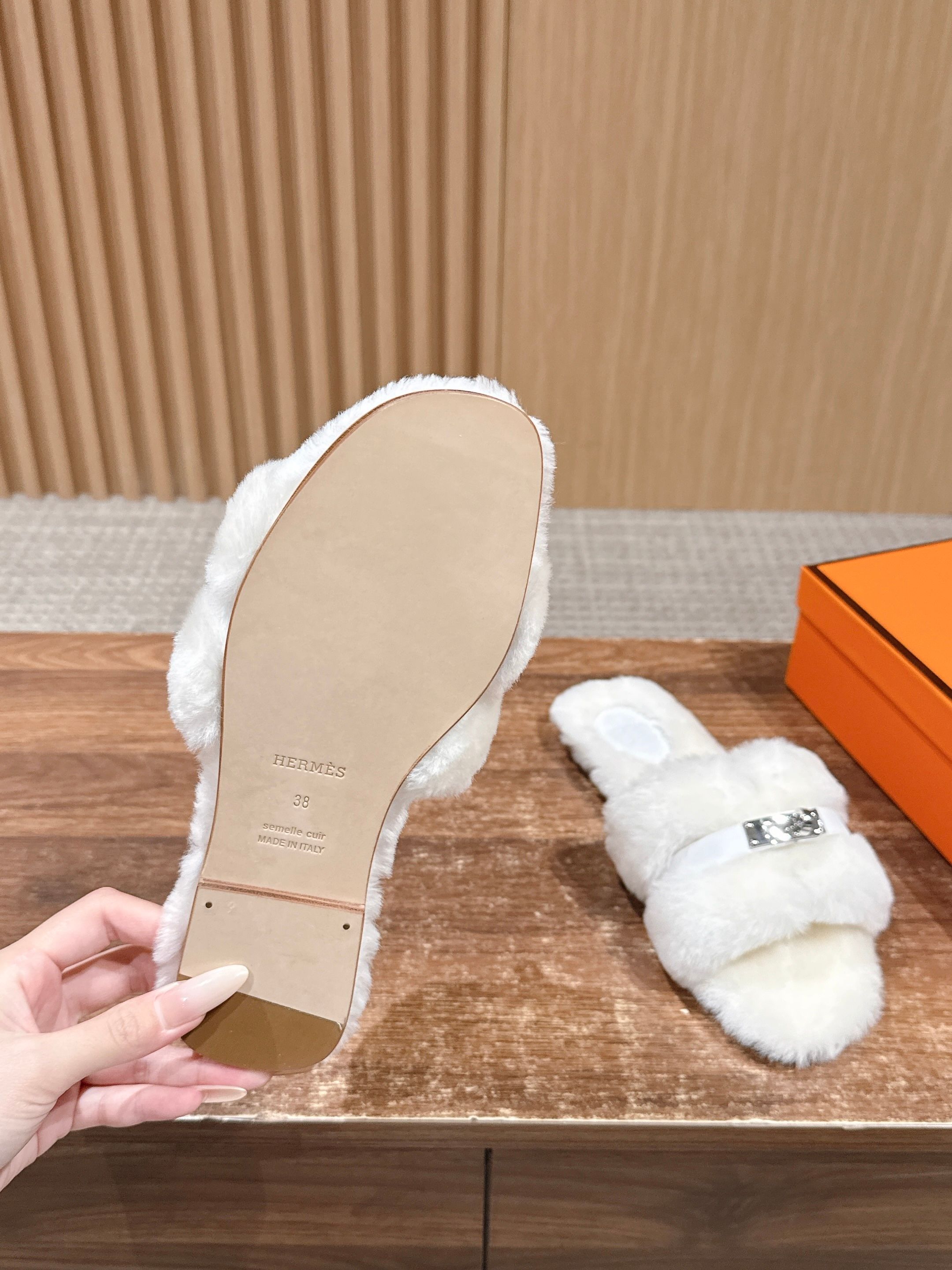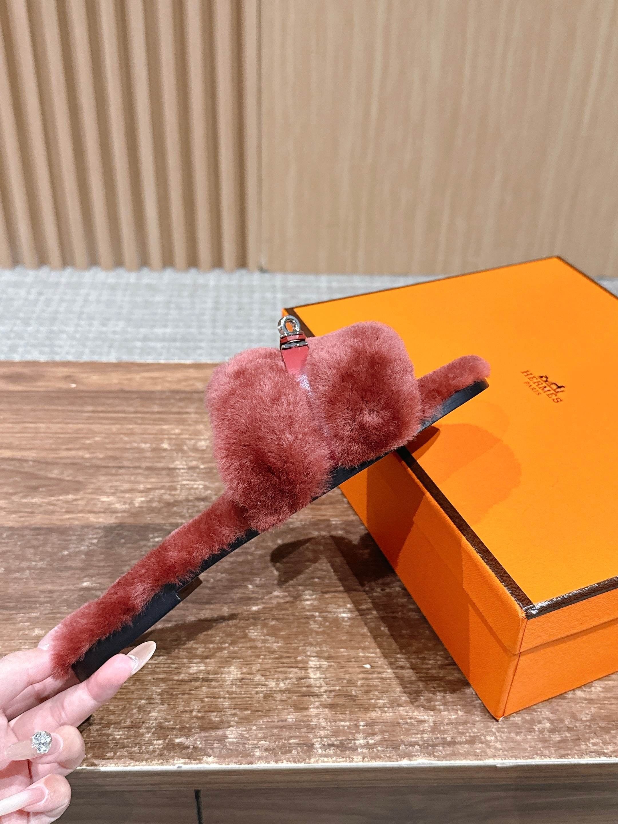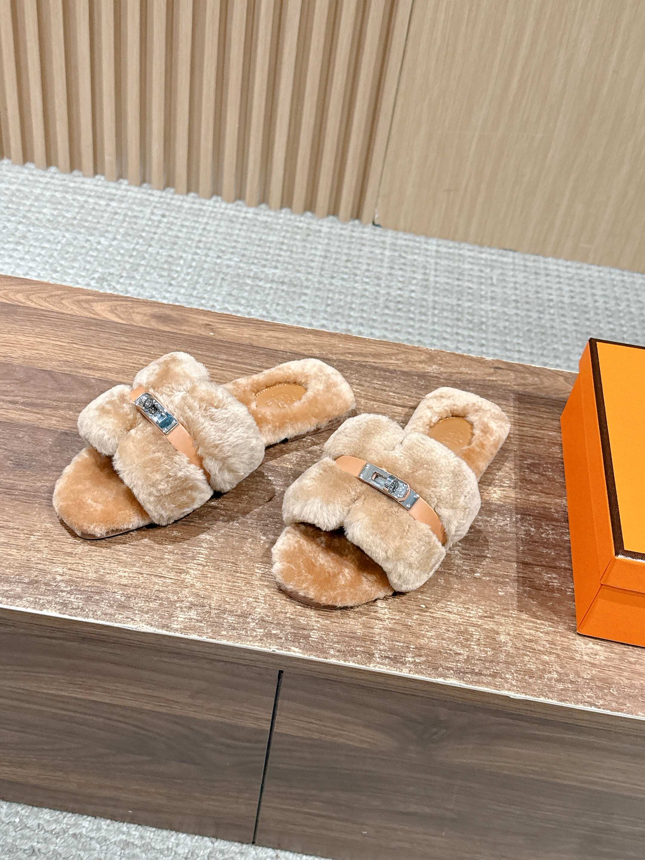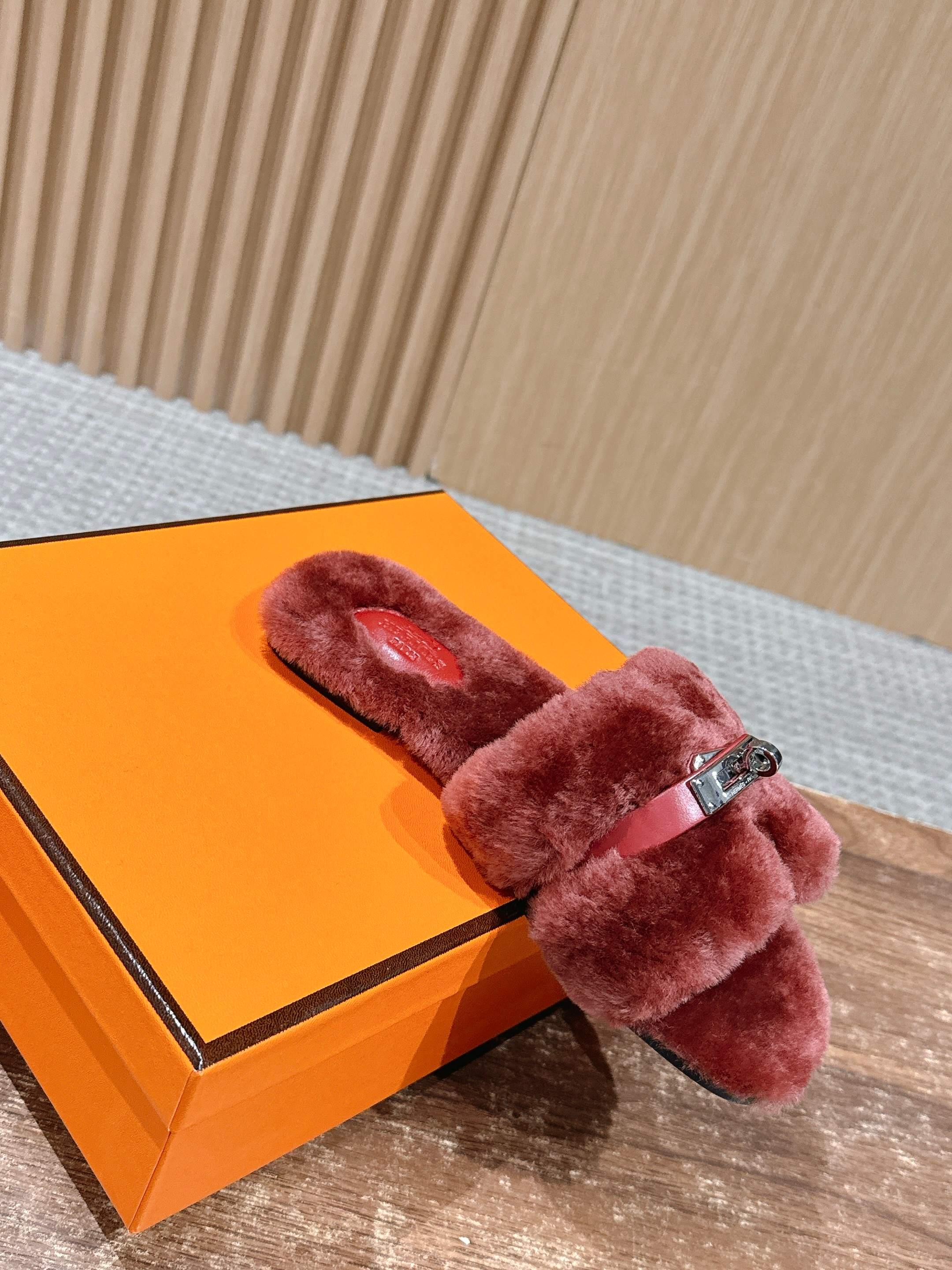 Hermer Giulia毛拖系列Kelly扣H毛拖鞋 万年经典款羊毛‘H’拖鞋 经典H拖搭配Kelly扣更为亮眼!一双平底拖鞋,属于休闲舒适的鞋款类型,适合日常居家或者在一些轻松的场合穿着。这种拖鞋款式简约却又不失时尚感,兼具实用性与时尚度。 整体采用了羊毛材质,看起来非常柔软蓬松,不仅在视觉上给人一种温暖舒适的感觉,实际穿着时也能提供极佳的亲肤体验,尤其适合在较凉爽的季节或者想要营造温暖氛围感的时候穿着。这种毛绒材质的选择也体现了品牌在材质运用上的用心,既要保证奢华感,又要兼顾穿着的舒适程度。 鞋面:羊毛 内里垫脚:羊毛 鞋底:意大利A级双层真皮大底 码数:35-39(40.41定做不退换)