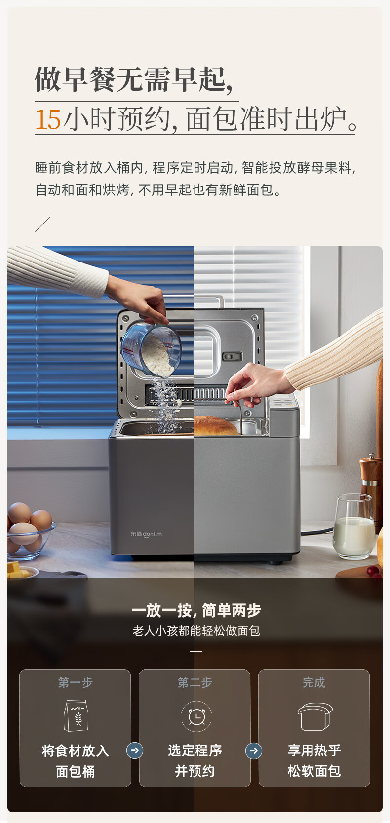 东菱(Donlim)全新升级面包机 全自动 和面机 家用 揉面机 可预约智能双撒 高成功率面包机DL-4705