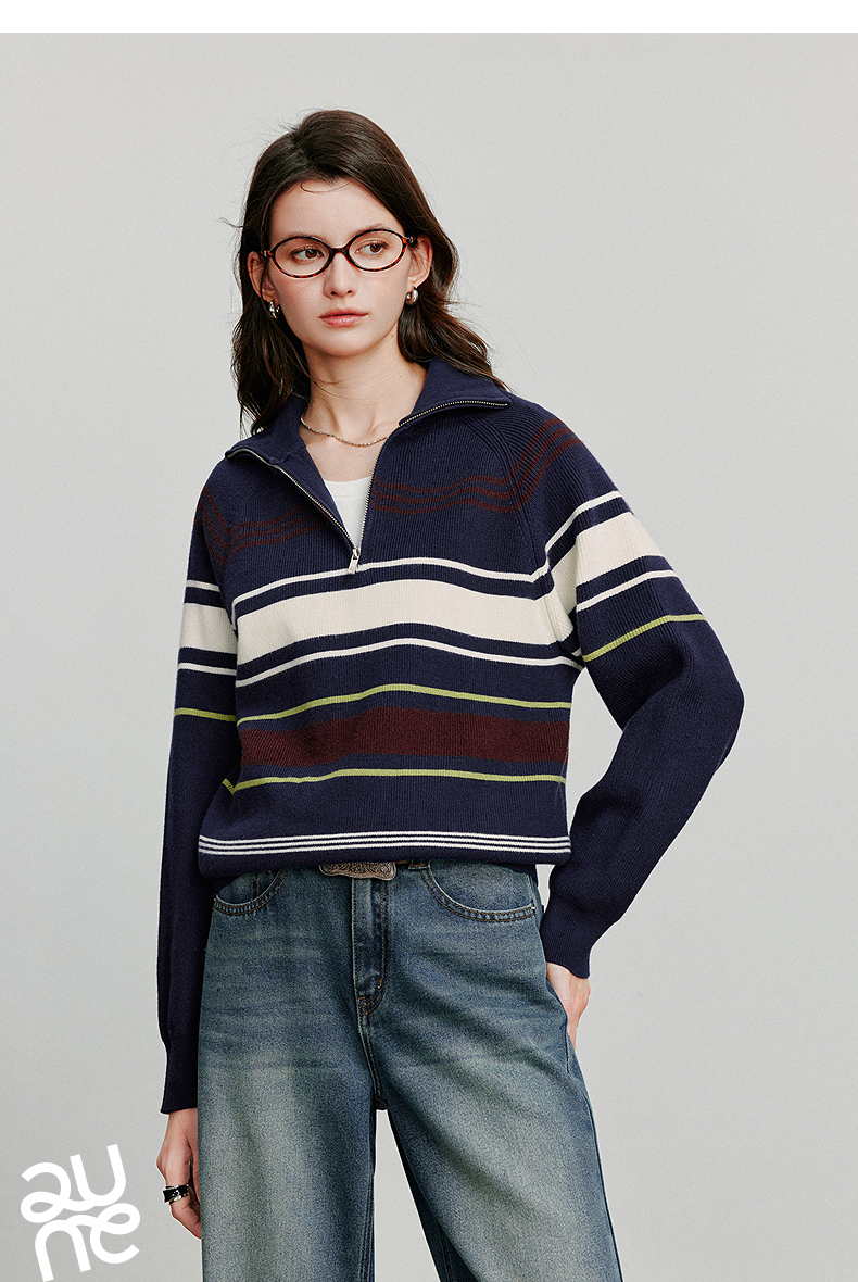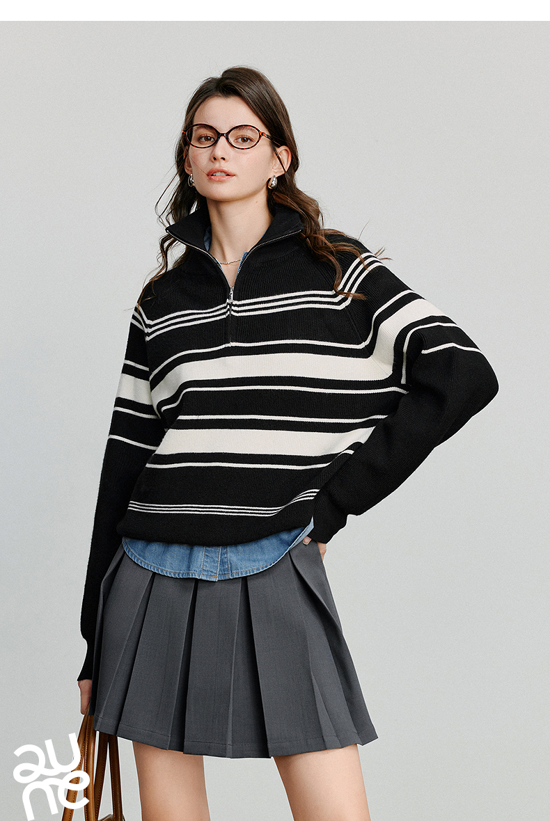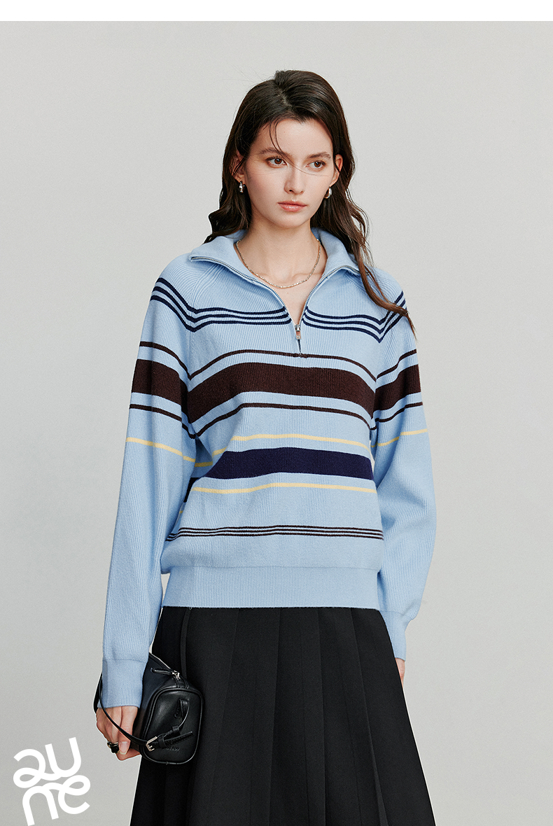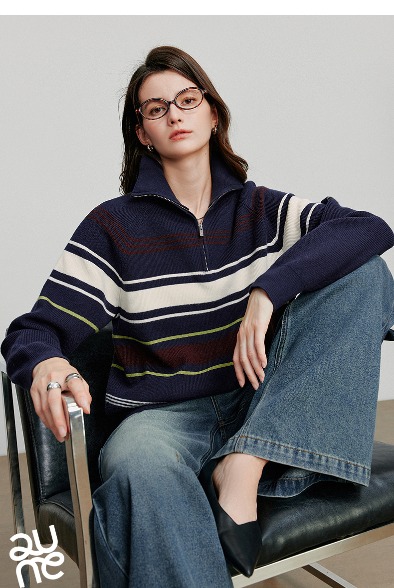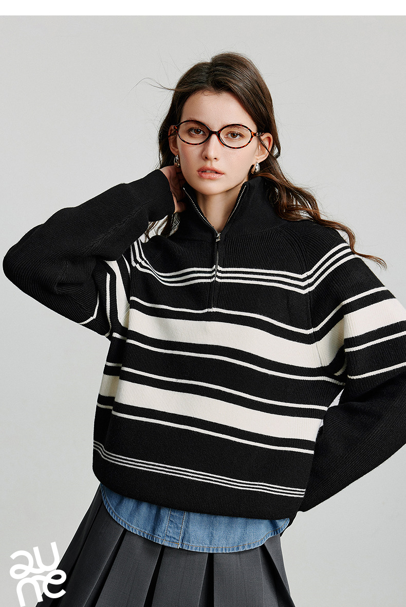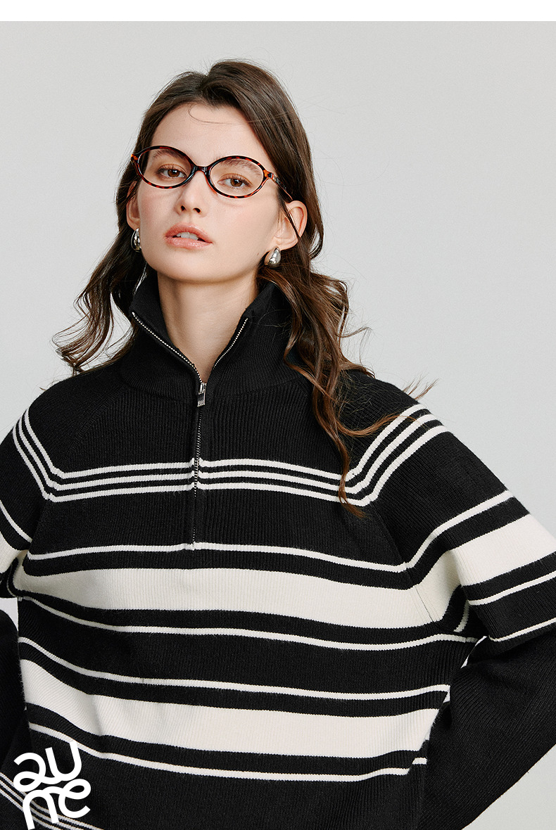 初语 女新款针织衫 时髦运动风条纹宽松拉链领长袖上衣