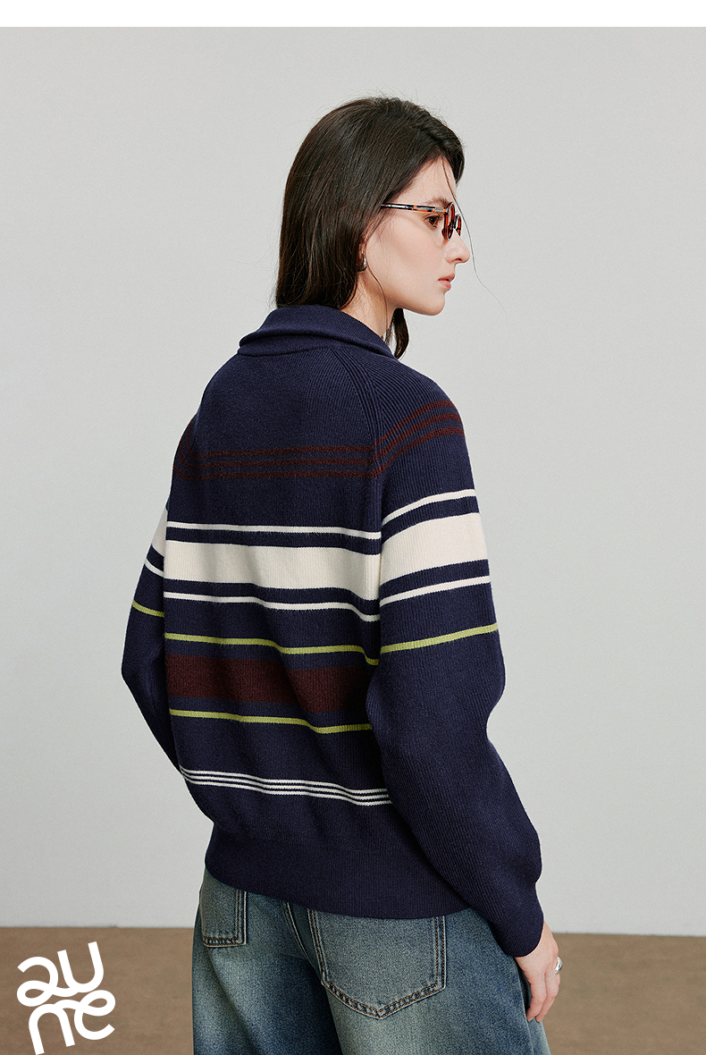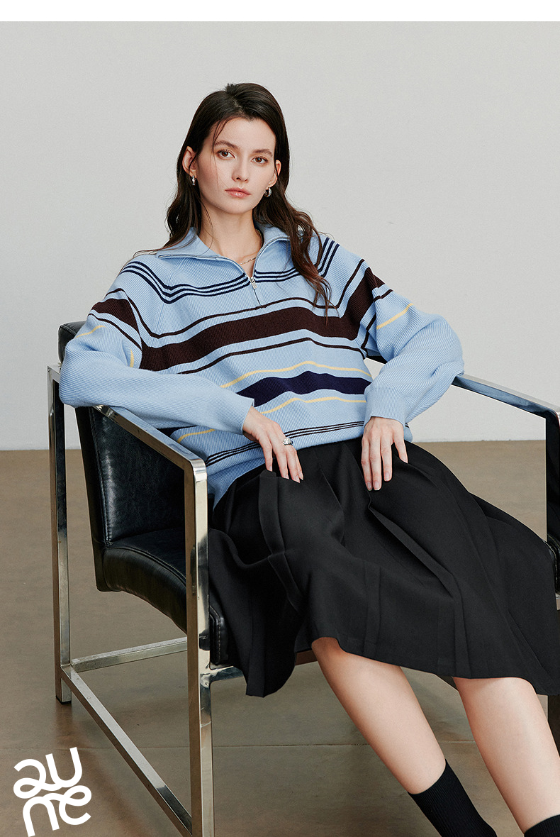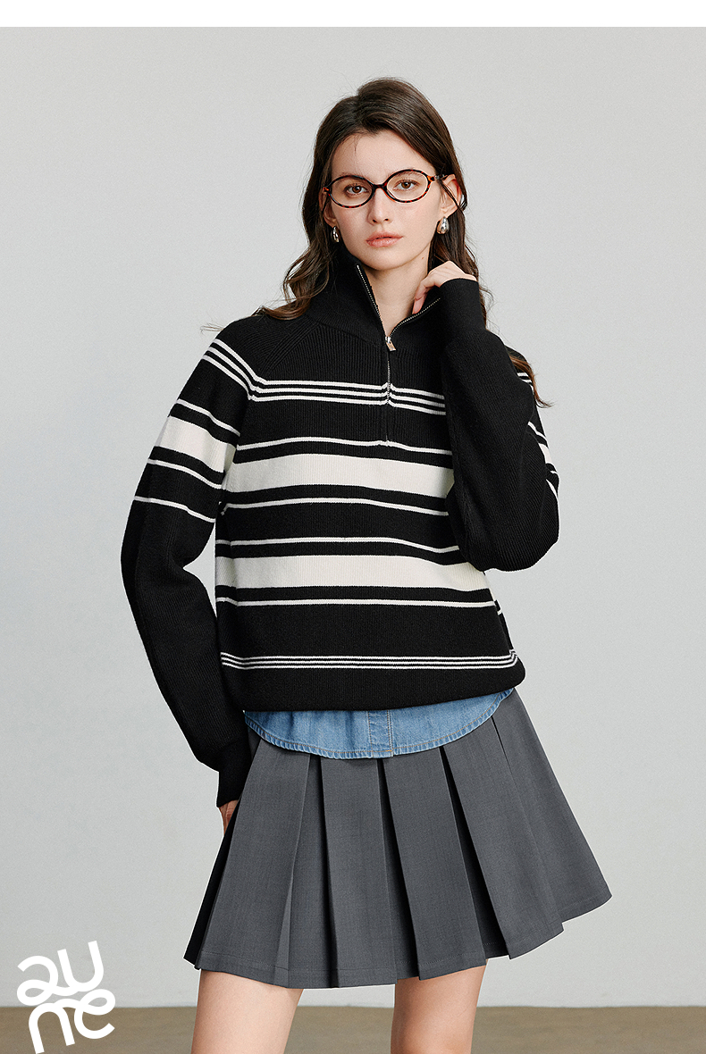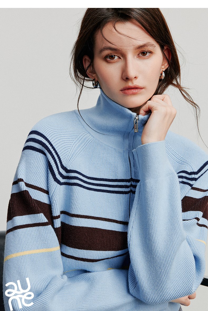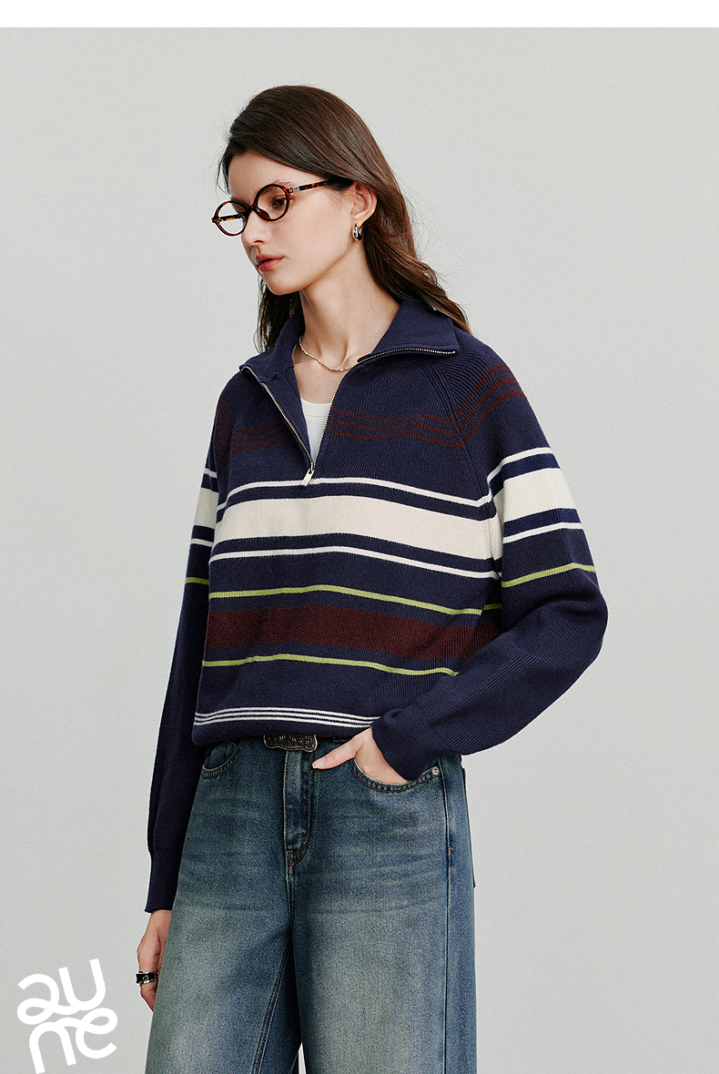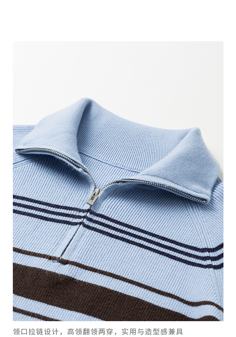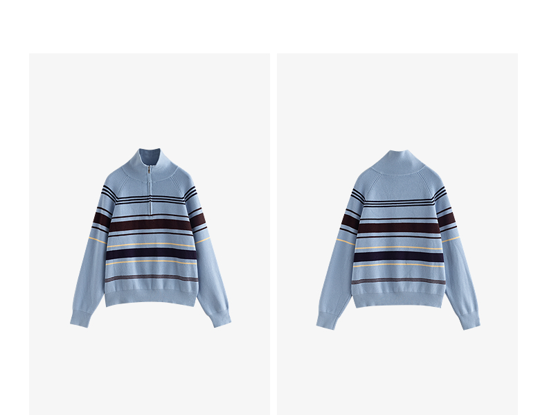 初语 女新款针织衫 时髦运动风条纹宽松拉链领长袖上衣