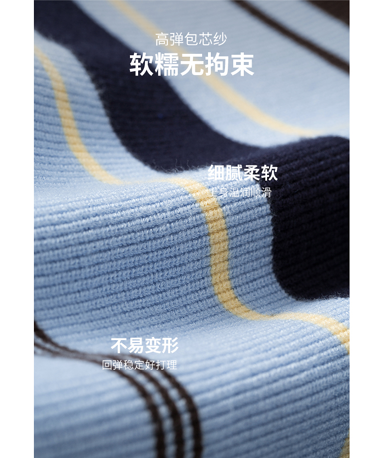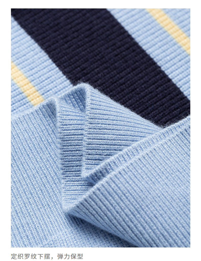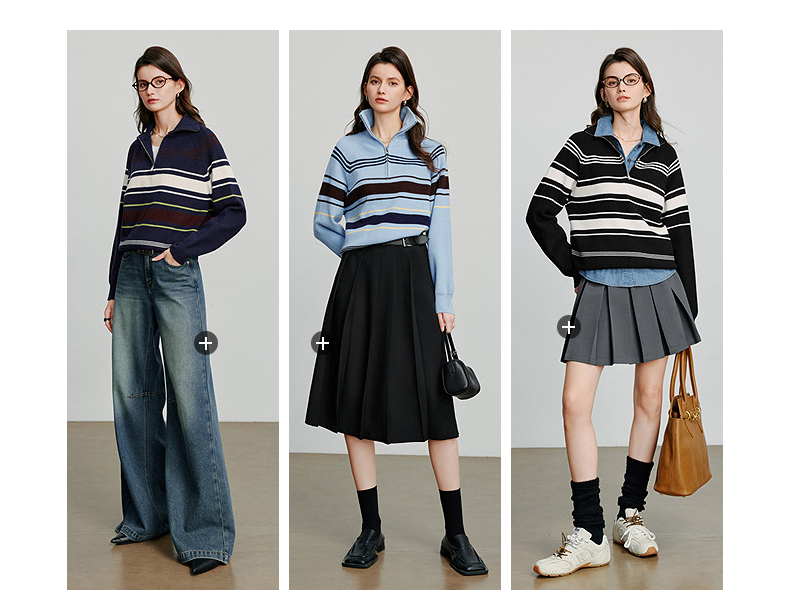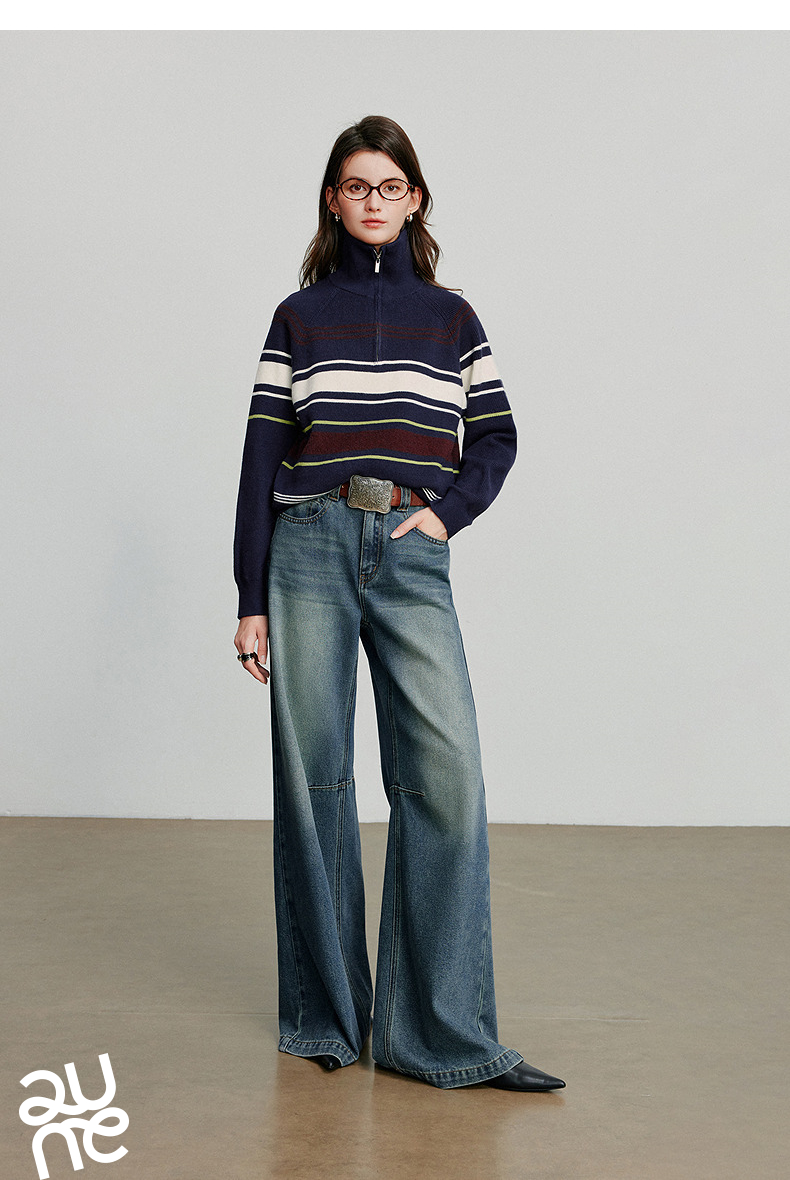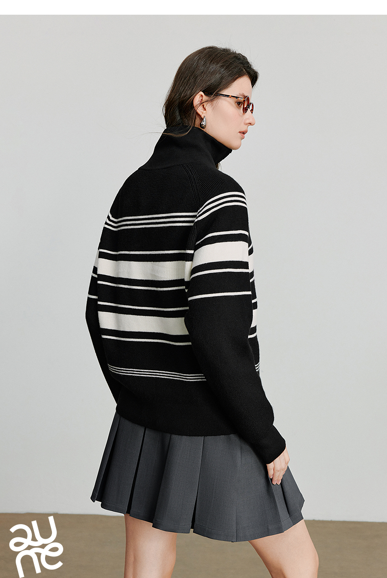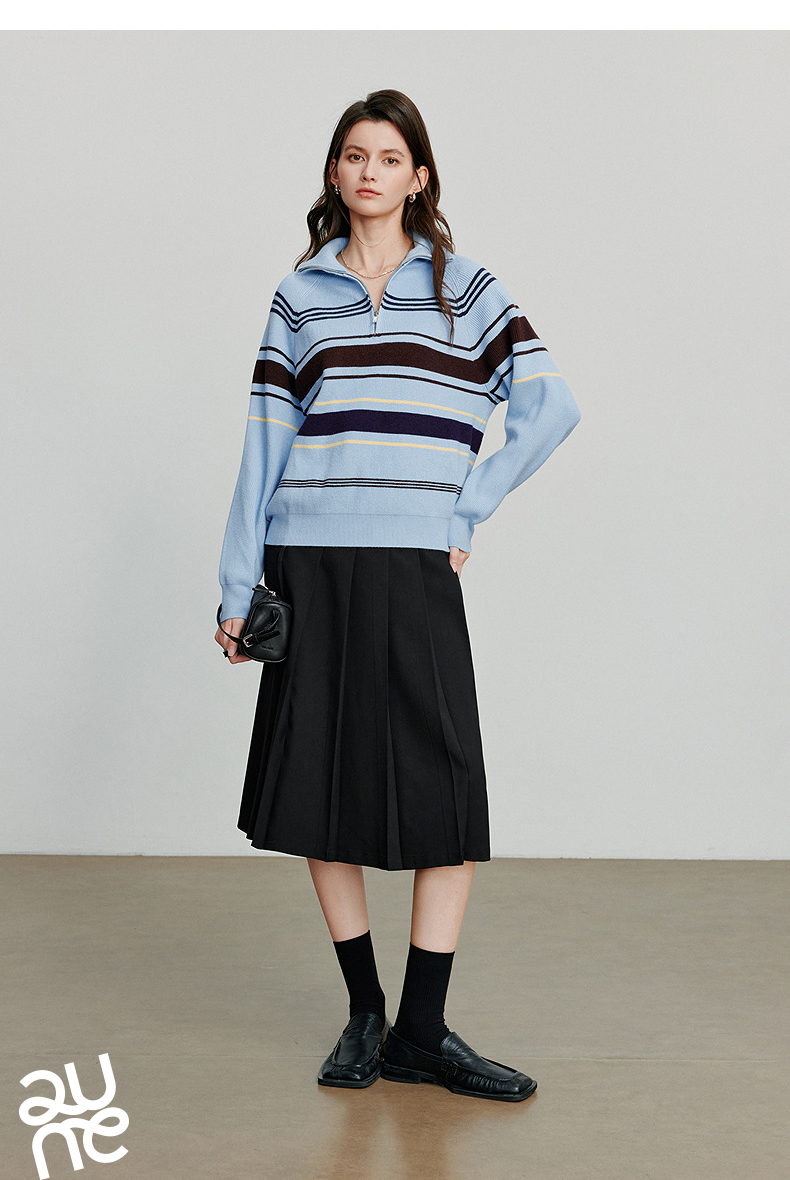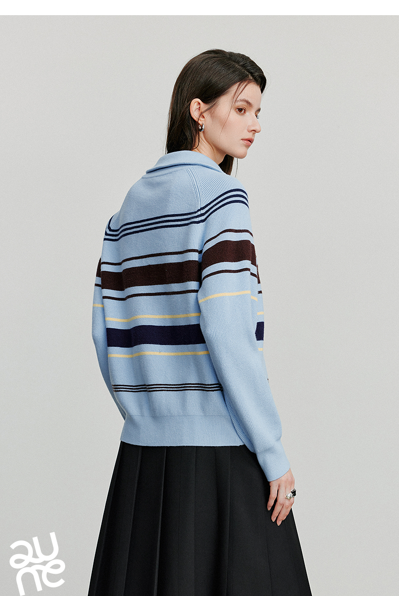 初语 女新款针织衫 时髦运动风条纹宽松拉链领长袖上衣