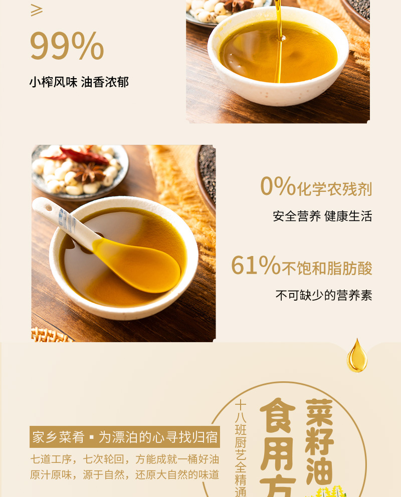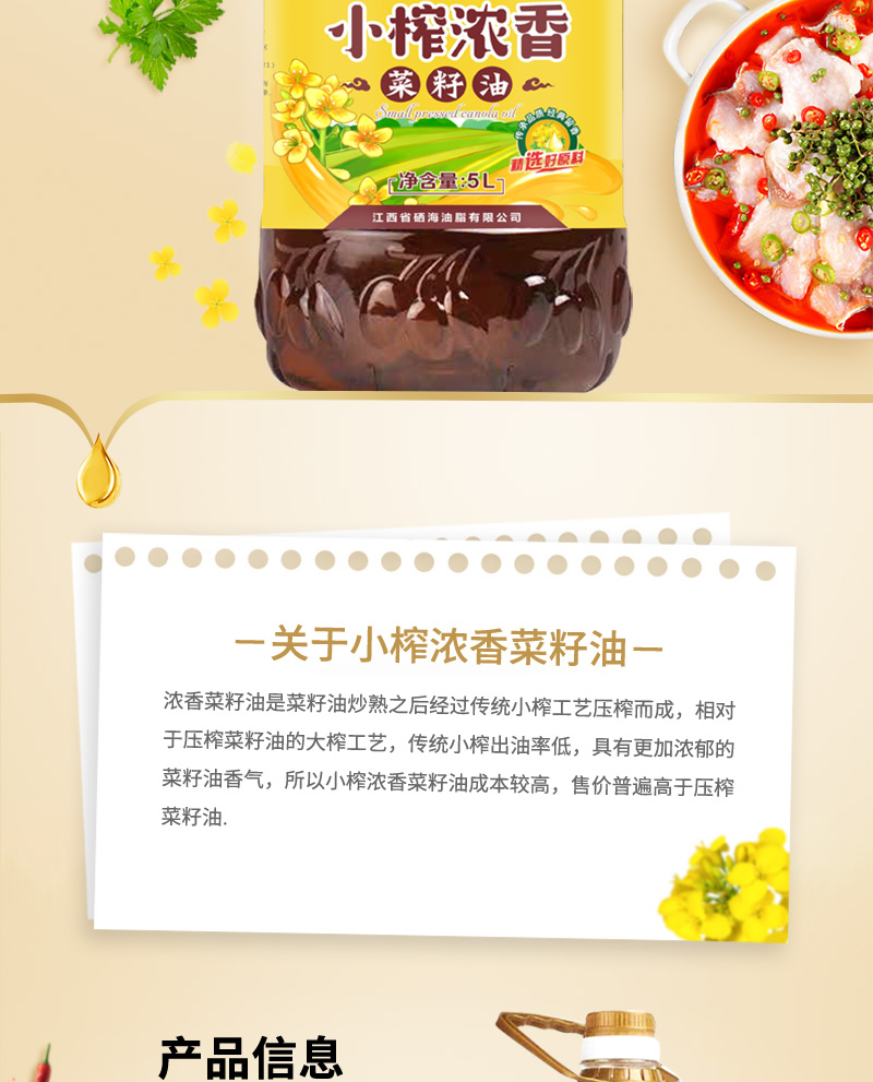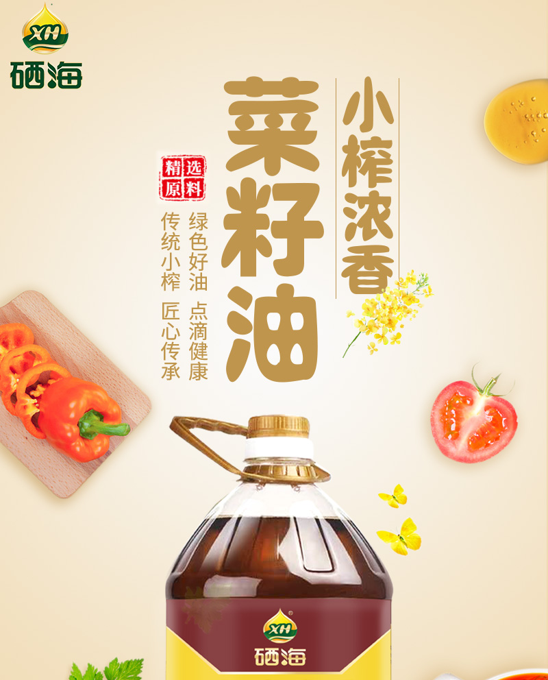 硒海小榨浓香菜籽油60度低温压榨风味十足5L*1瓶