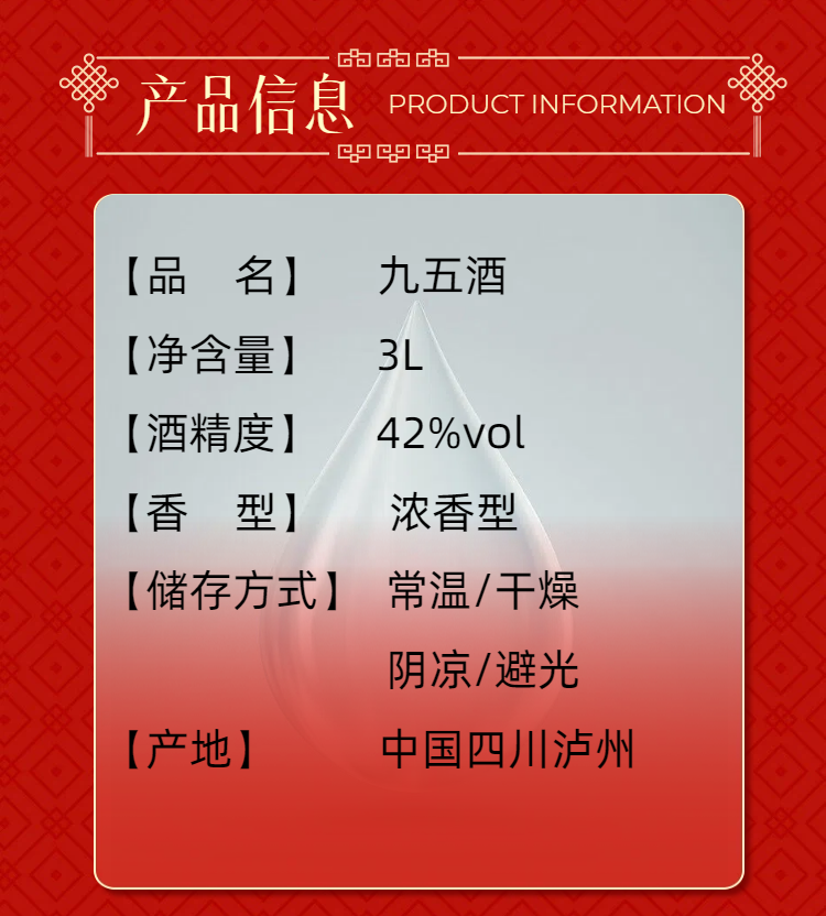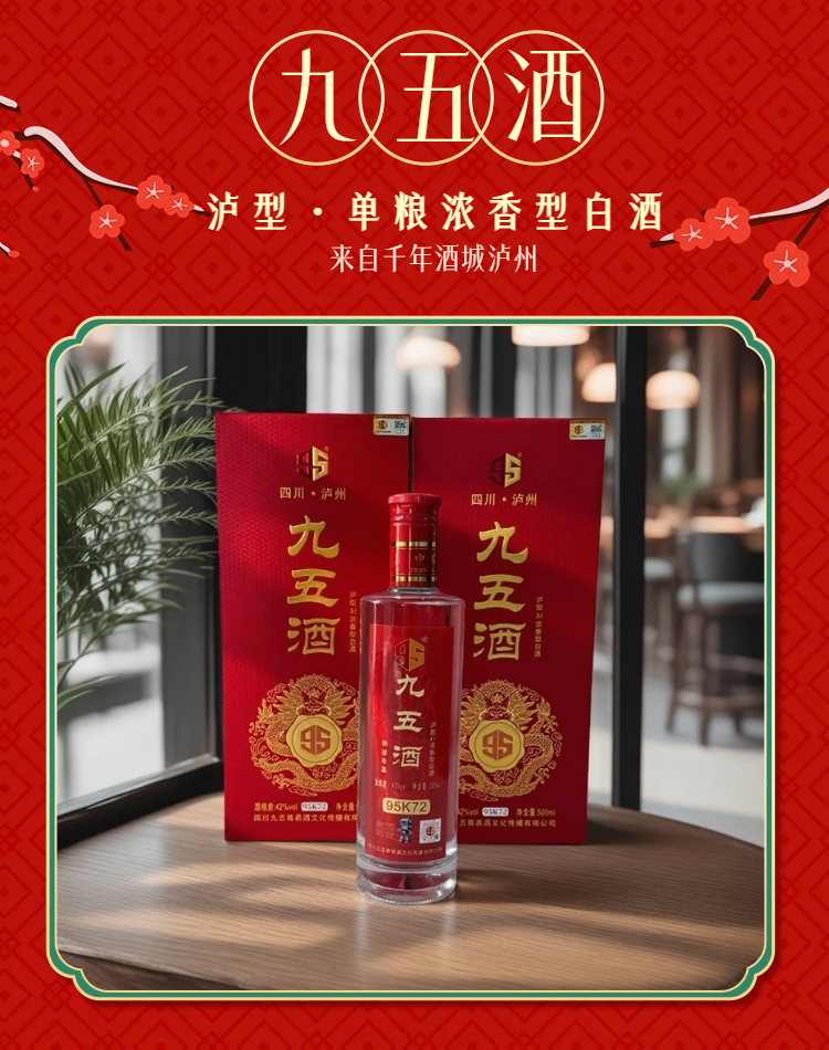 - 九五酒源自金三角产区,百年窖池、非遗工艺、千年传承酿造出泸型单粮浓香、茅台赤水河酱香、宜宾多粮浓香,简称“壹茅五”三种顶级绝佳口感美酒。