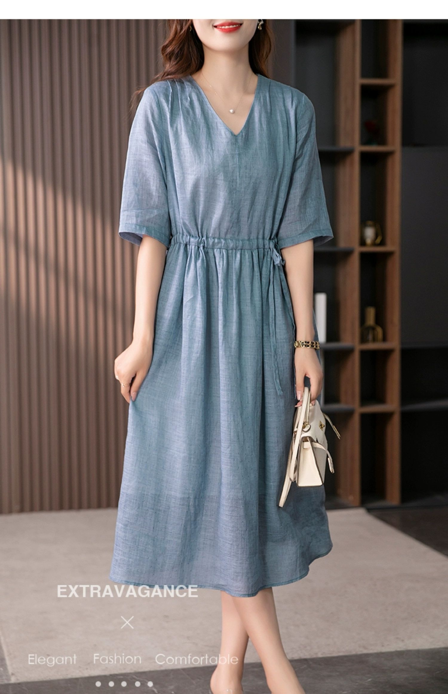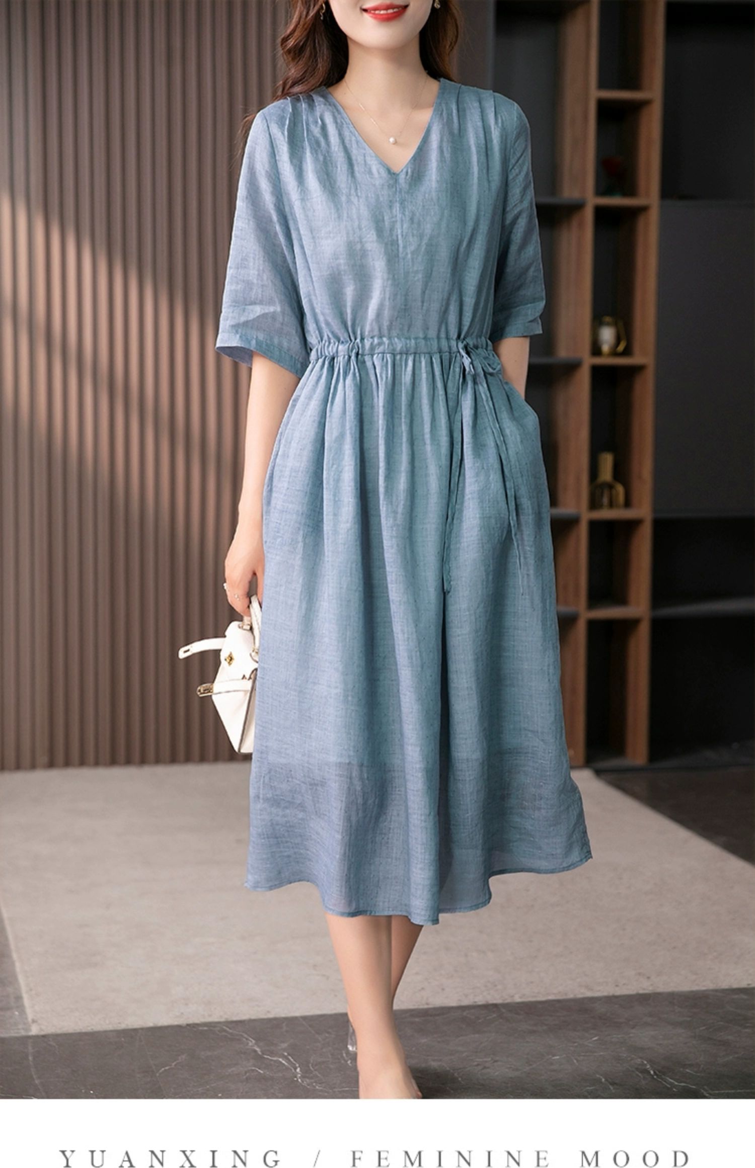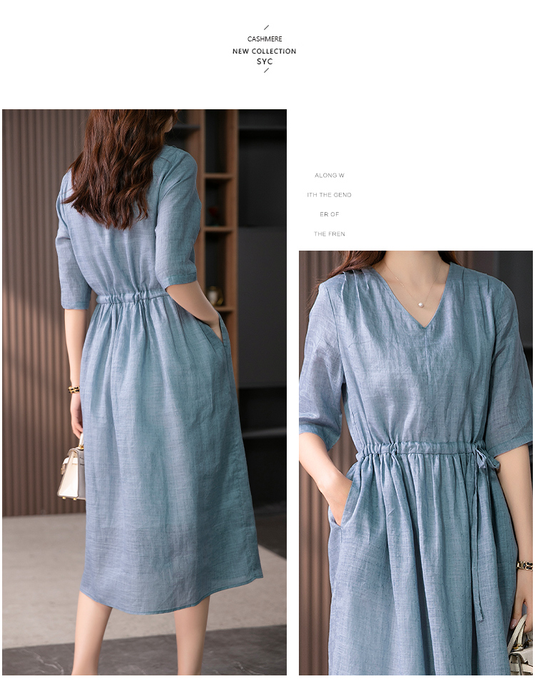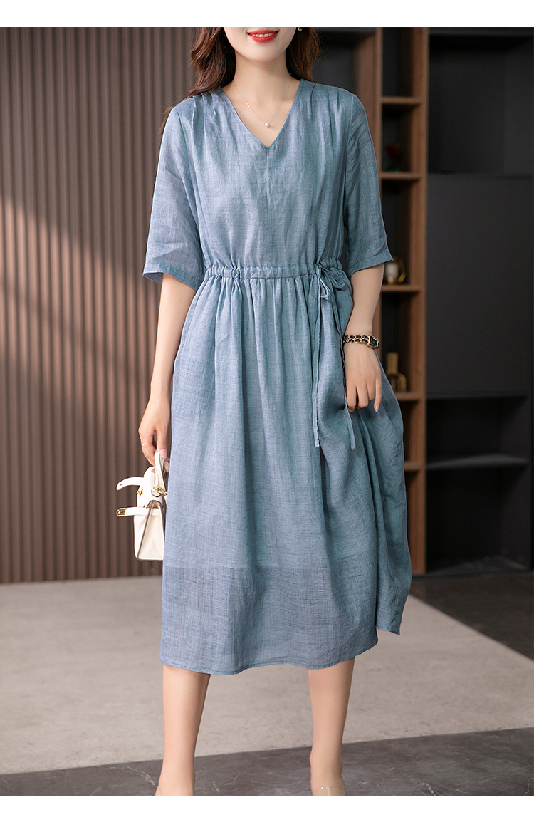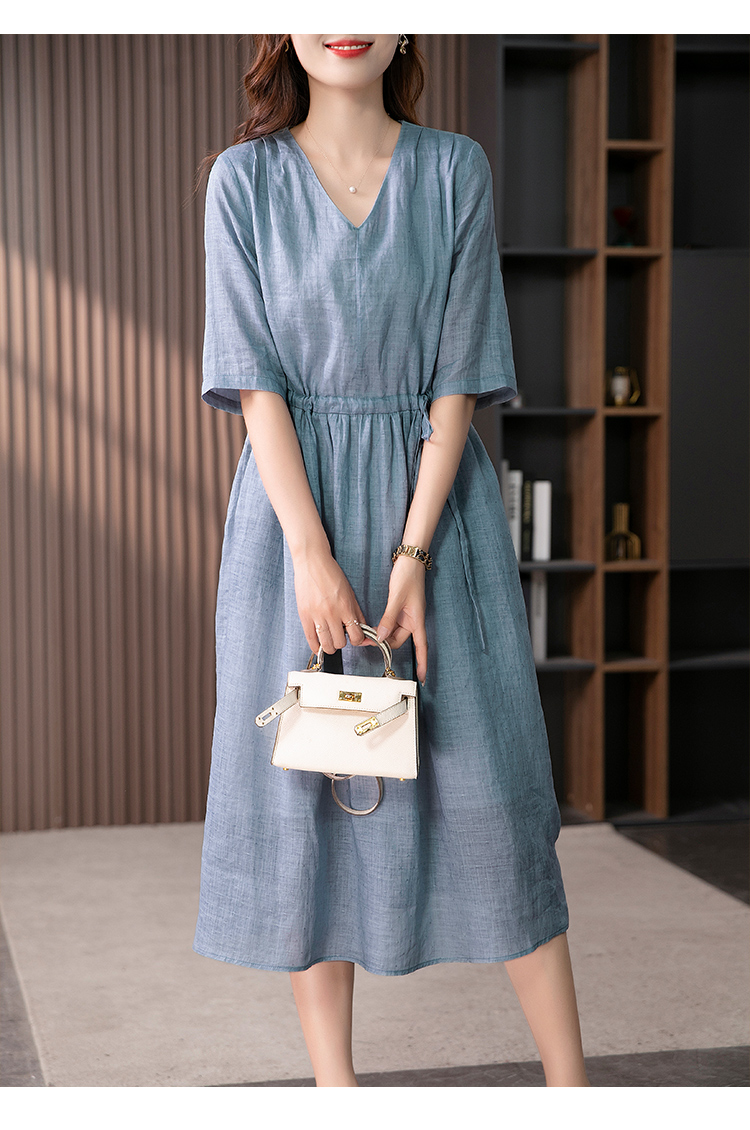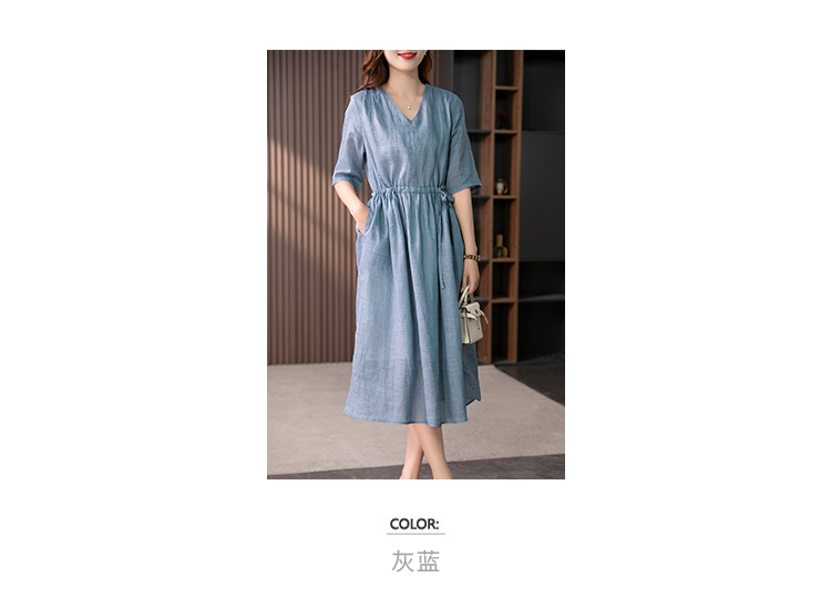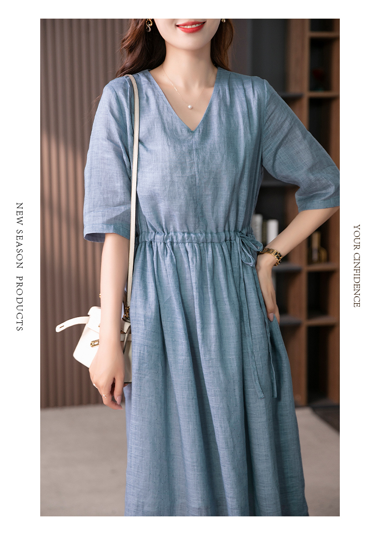YX【现货7天】V领苎麻连衣裙女抽绳显瘦A字裙2023夏季新款气质减龄长裙子