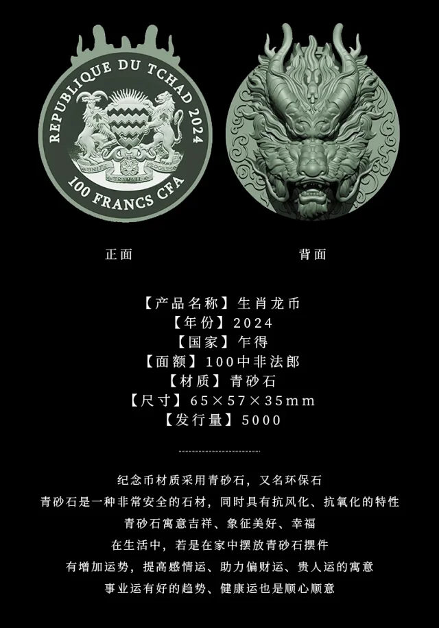 2024龙头青砂石纪念币 带礼盒证书 乍得发行
