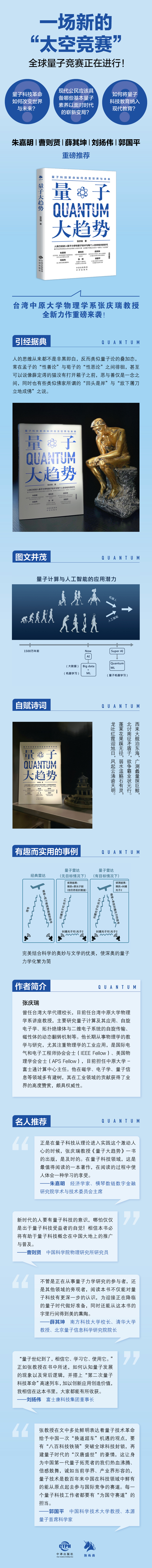 正是在量子科技从理论进入实践这个激动人心的时候,张庆瑞教授《量子大趋势》一书的出版,是及时的。本书的特点是:精心和细致的结构设计,对量子科技的科学原理作了系统和深入浅出的介绍,对相关技术做了具有操作性的说明,并配合必要的图解以及颇具文学性的文字。在量子科技领域,这是最值得阅读的一本著作,在阅读的过程中使人体会一种学习的享受。值得强调的是,在这本书中,张庆瑞教授就如何将量子科技教育纳入现代教育,如何将其从中学延续到大学,提出了他的方案,并以他的实验作为支持。最令人触动的是,张庆瑞教授将年轻人和 Q 世代紧密结合在一起,他说道:“这是个有史以来从未碰过的崭新的量子时代的开始,因为一切都是量子新实验,只有自己开垦与探索,量子‘淘金热’远比半导体与网络时代更精彩、更具竞争性。年轻的读者,努力‘翻滚’吧!在这个灿烂的世界量子舞台,在‘量子未来’,年轻一代,不论是在 Z 世代,甚至是在 α 世代,都会创造出比战后‘婴儿潮’那个古典世代更加百倍的辉煌。”