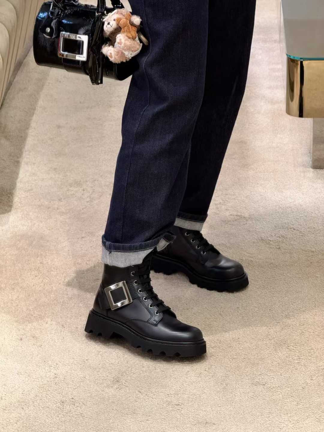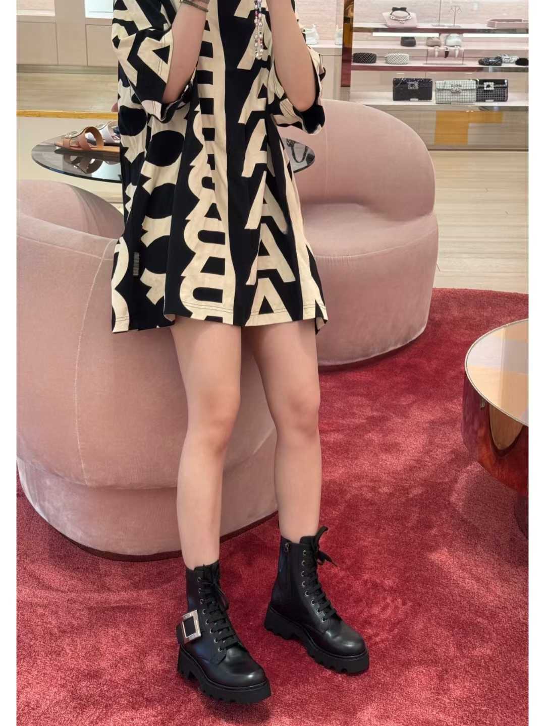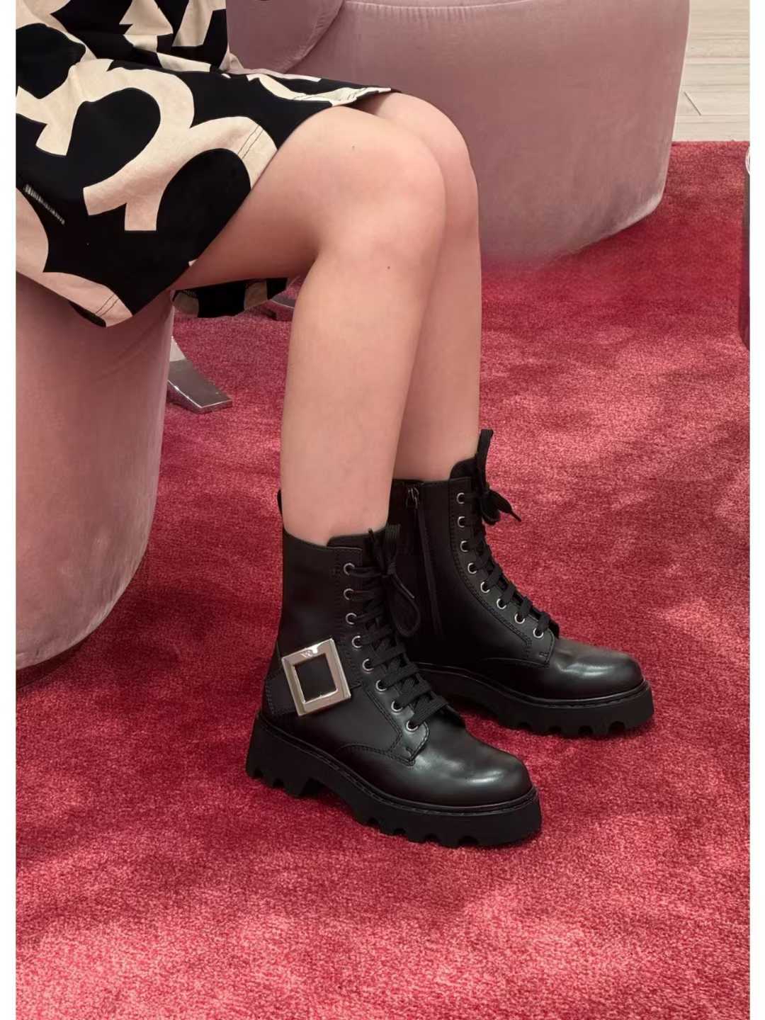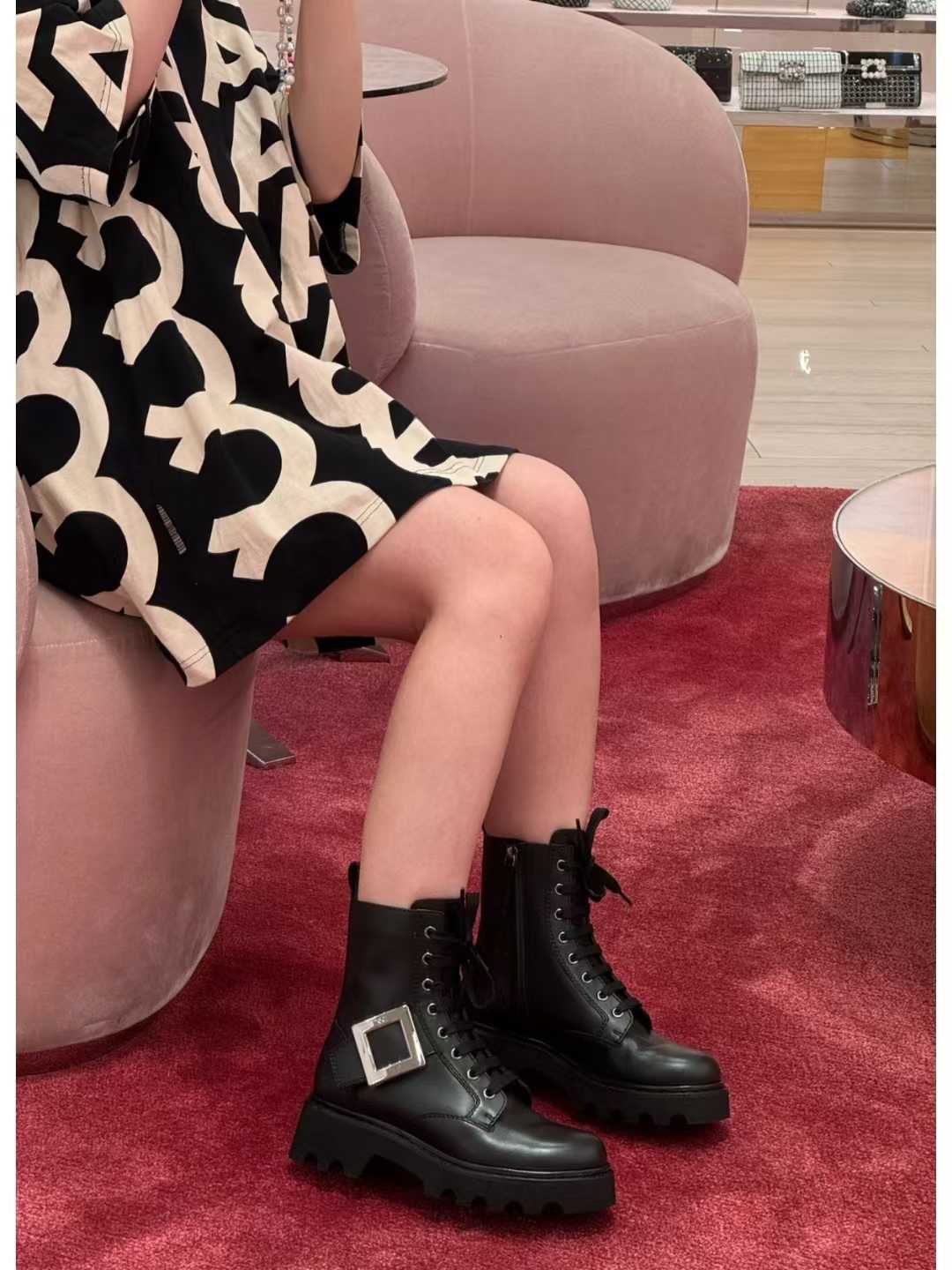 R家罗杰维维亚秋冬新款女靴 方扣中筒靴厚底英伦风马丁靴
