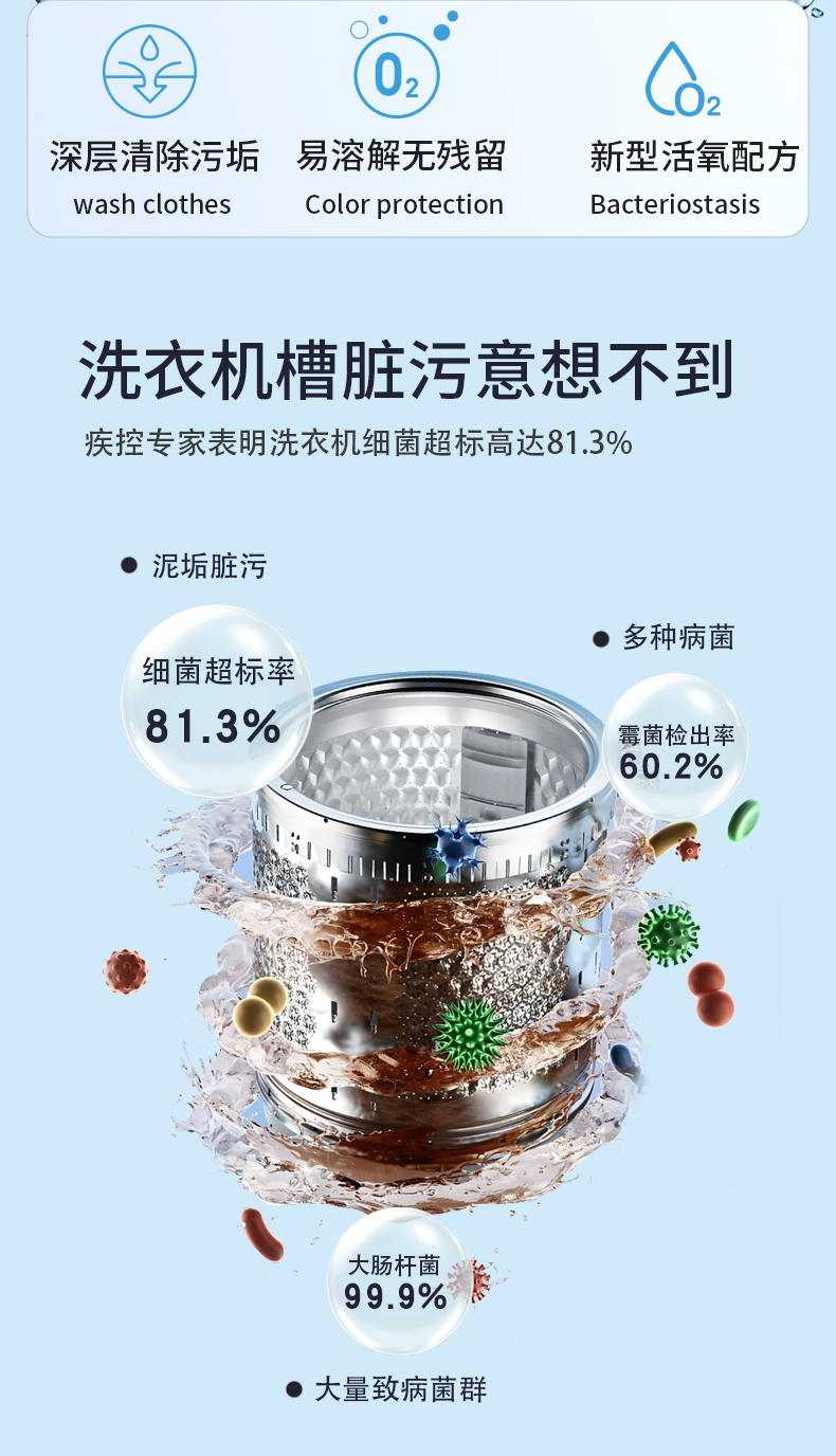 一:活性氧爆破去渍,深层瓦解顽固污垢、霉菌和细菌
