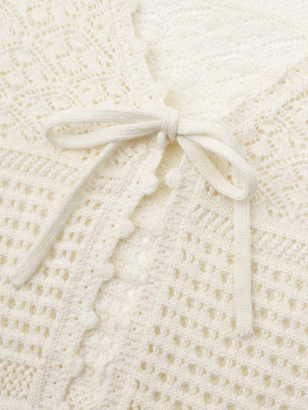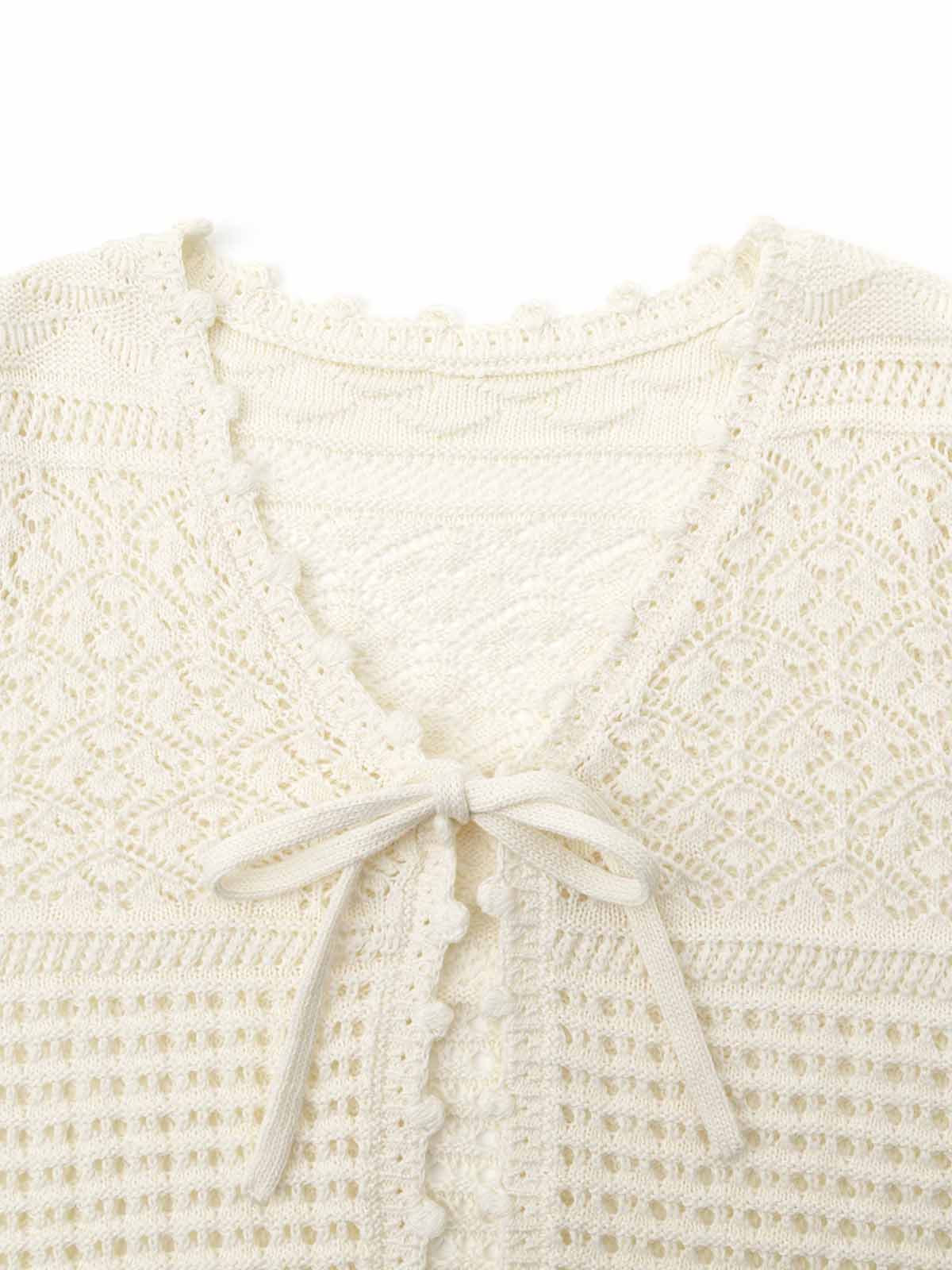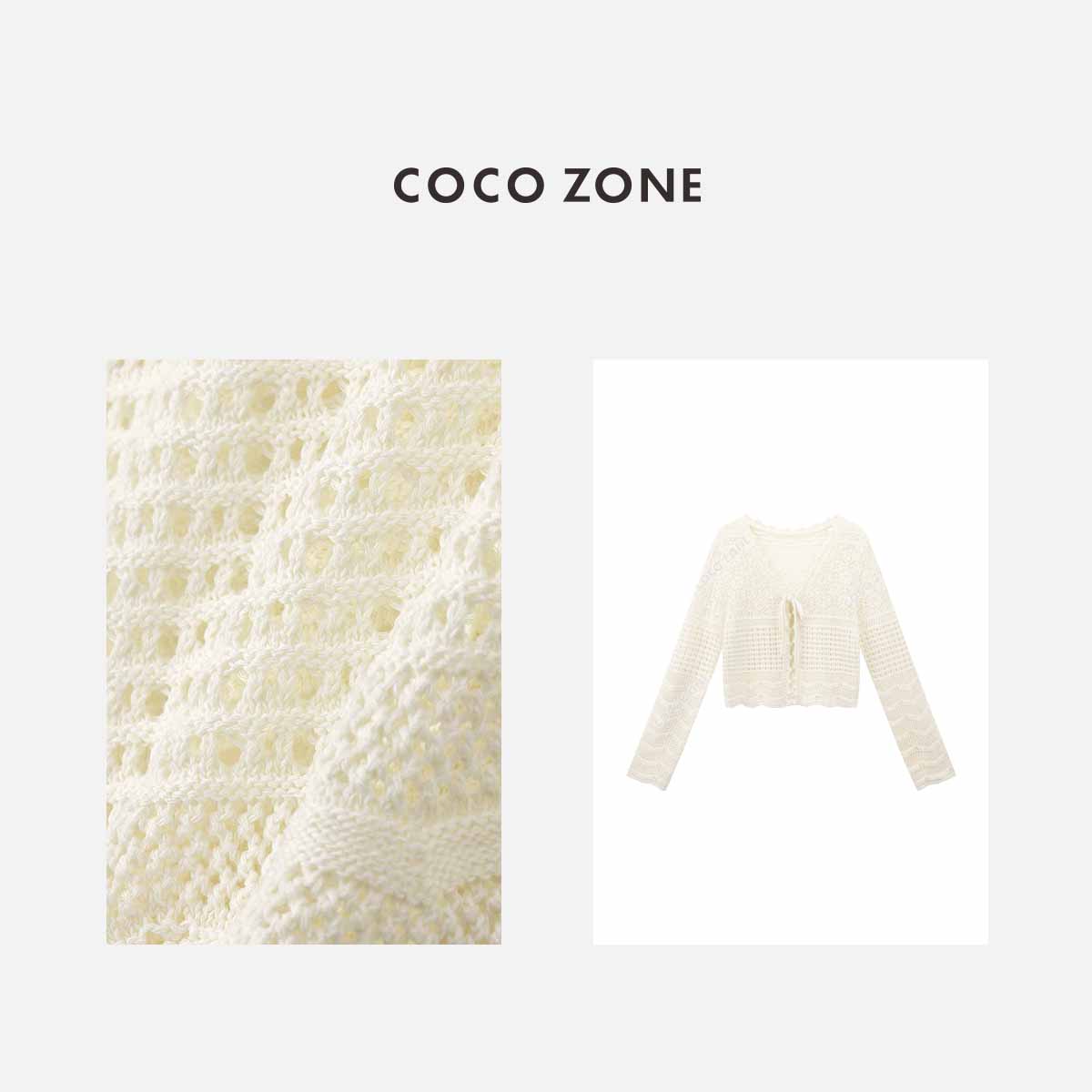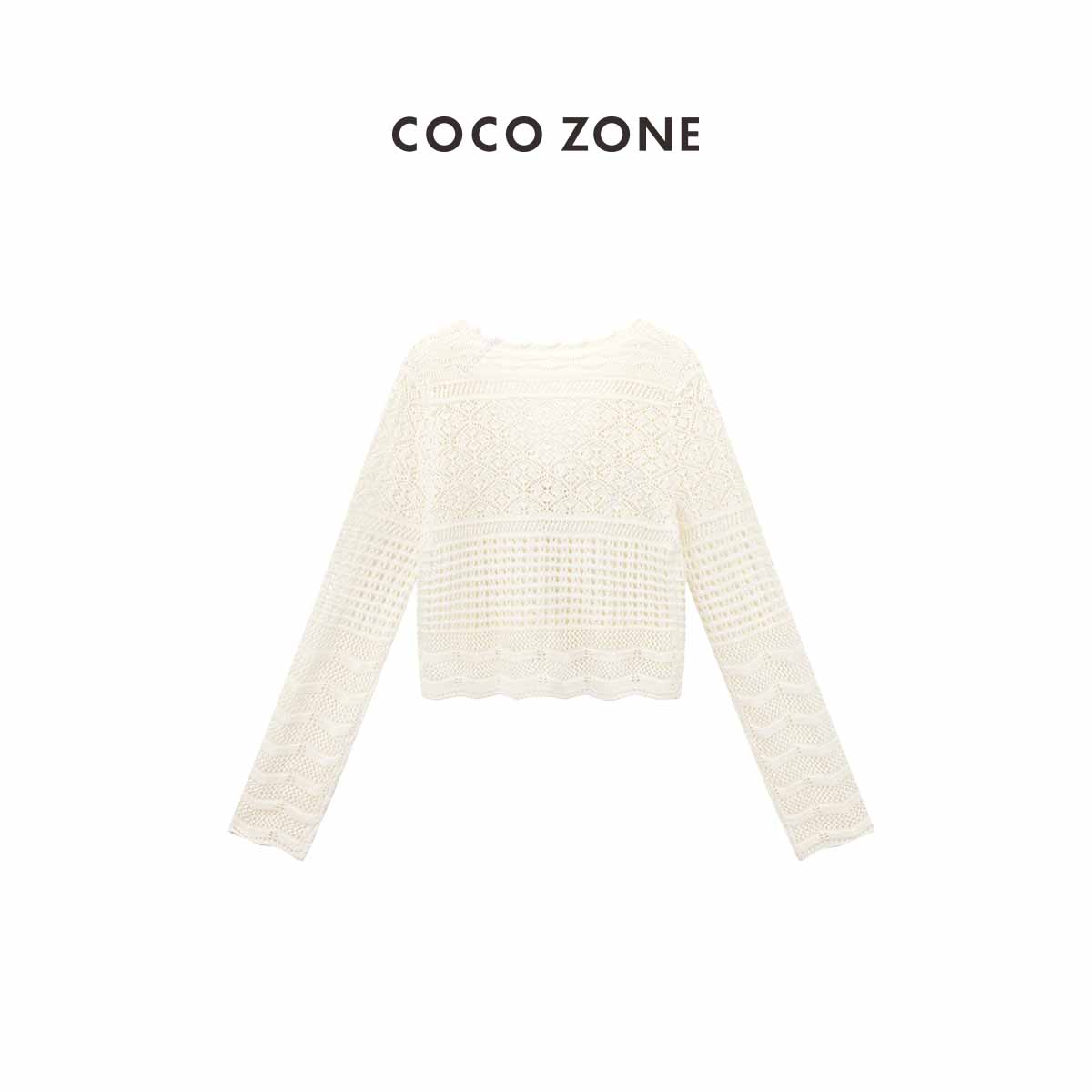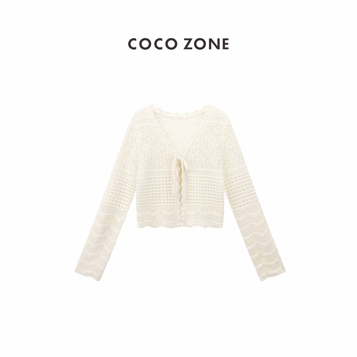 COCO ZONE"艾莉亚”时尚V领翻花镂空针织衫夏季透气感长袖上衣CC1B1085