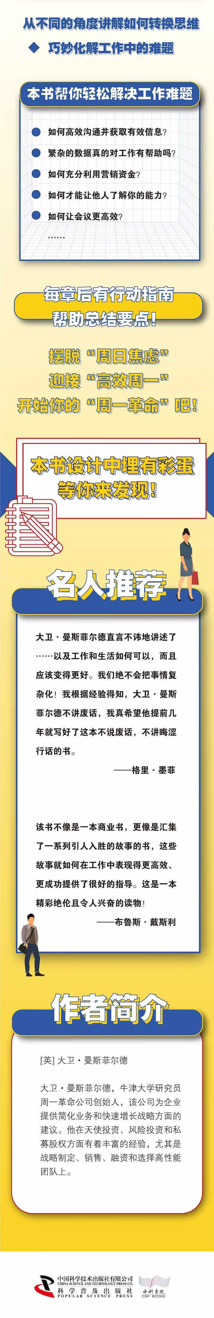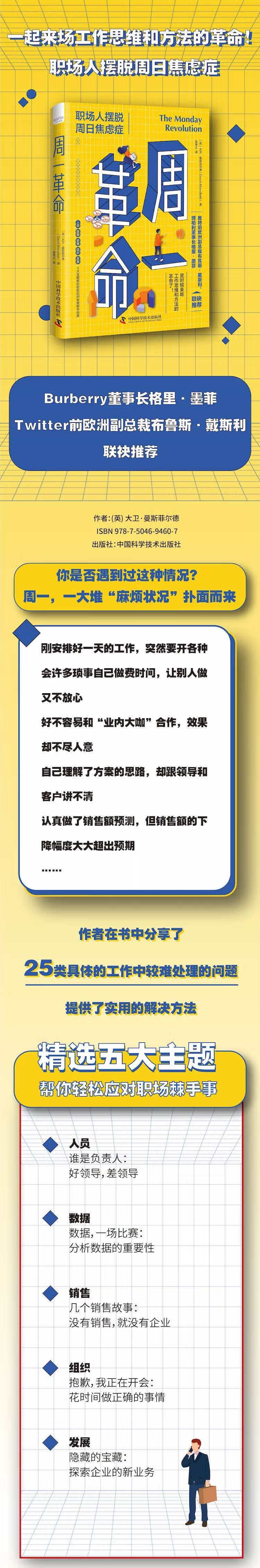 在本书中,作者提倡进行“周一革命”,其中的“革命”指转换自己的思维,摆脱对工作的厌倦与反感,用积极的心态和高效的方法解决看似棘手的问题。作者在书中分享了25类具体的工作中较难处理的问题,提供了实用的解决方法,并将这些问题分为了人员、数据、销售、组织、发展五个板块,从不同的角度讲解如何转换思维,巧妙化解工作中的难题。本书语言诙谐,观点独到,内容为作者多年工作经历的提炼总结,能激励、指导作者,掌握更有效的工作方法,拥有更积极的工作思维。