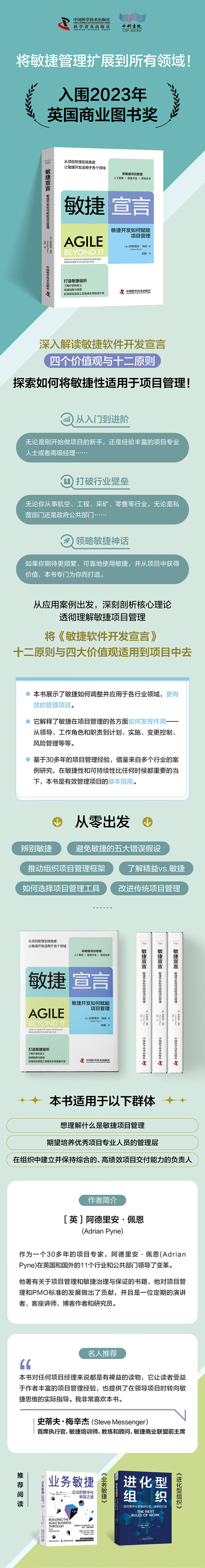 2.在当下科技飞速发展的时代,人工智能(AI)成为了推动各行各业创新发展的核心力量。在这样的背景下,项目管理也面临着前所未有的挑战与机遇。本书也将为您揭示如何在AI的浪潮中,运用敏捷的方法论,高效、灵活地应对项目管理的各种挑战。