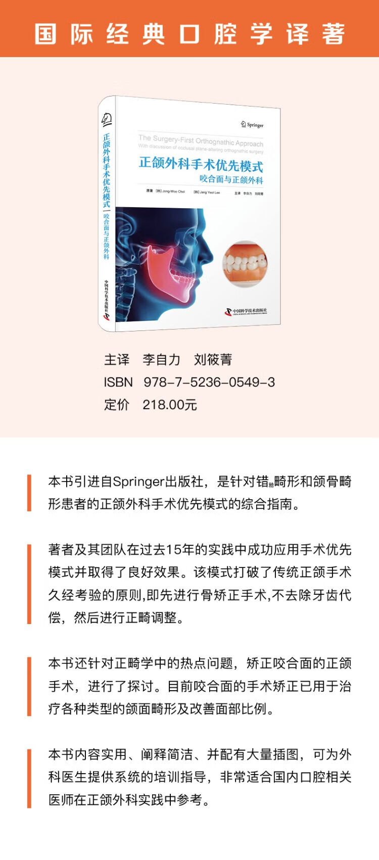 本书引进自 Springer 出版社,是针对错 畸形和颌骨畸形患者的正颌外科手术优先模式的综合指南。著者及其团队在过去 15 年的实践中成功应用手术优先模式并取得了良好效果。该模式打破了传统正颌手术久经考验的原则,即先进行骨矫正手术,不去除牙齿补偿,然后进行正畸调整。本书还针对正畸学中的热点问题矫正咬合面的正颌手术进行了探讨,目前咬合面的手术矫正已用于治疗各种类型的颌面畸形及改善面部比例。本书内容实用、阐释简洁,并配有大量直观展示的插图,可为外科医生提供系统的培训指导,非常适合国内口腔相关医师在正颌外科实践中参考。